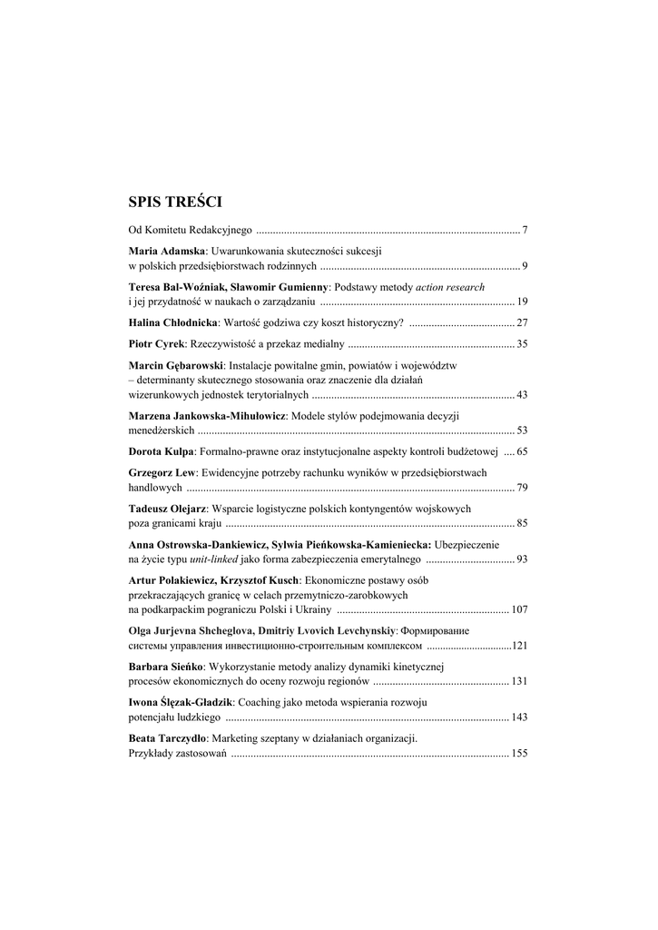SPIS TREŚCI Od Komitetu Redakcyjnego ............................................................................................... 7 Maria Adamska: Uwarunkowania skuteczności sukcesji w polskich przedsiębiorstwach rodzinnych ........................................................................ 9 Teresa Bal-Woźniak, Sławomir Gumienny: Podstawy metody action research i jej przydatność w naukach o zarządzaniu ...................................................................... 19 Halina Chłodnicka: Wartość godziwa czy koszt historyczny? ...................................... 27 Piotr Cyrek: Rzeczywistość a przekaz medialny ............................................................ 35 Marcin Gębarowski: Instalacje powitalne gmin, powiatów i województw – determinanty skutecznego stosowania oraz znaczenie dla działań wizerunkowych jednostek terytorialnych ......................................................................... 43 Marzena Jankowska-Mihułowicz: Modele stylów podejmowania decyzji menedżerskich .................................................................................................................. 53 Dorota Kulpa: Formalno-prawne oraz instytucjonalne aspekty kontroli budżetowej .... 65 Grzegorz Lew: Ewidencyjne potrzeby rachunku wyników w przedsiębiorstwach handlowych ...................................................................................................................... 79 Tadeusz Olejarz: Wsparcie logistyczne polskich kontyngentów wojskowych poza granicami kraju ........................................................................................................ 85 Anna Ostrowska-Dankiewicz, Sylwia Pieńkowska-Kamieniecka: Ubezpieczenie na życie typu unit-linked jako forma zabezpieczenia emerytalnego ................................ 93 Artur Polakiewicz, Krzysztof Kusch: Ekonomiczne postawy osób przekraczających granicę w celach przemytniczo-zarobkowych na podkarpackim pograniczu Polski i Ukrainy .............................................................. 107 Olga Jurjevna Shcheglova, Dmitriy Lvovich Levchynskiy: Формирование системы управления инвестиционно-строительным комплексом ................................121 Barbara Sieńko: Wykorzystanie metody analizy dynamiki kinetycznej procesów ekonomicznych do oceny rozwoju regionów ................................................. 131 Iwona Ślęzak-Gładzik: Coaching jako metoda wspierania rozwoju potencjału ludzkiego ...................................................................................................... 143 Beata Tarczydło: Marketing szeptany w działaniach organizacji. Przykłady zastosowań .................................................................................................... 155 Krzysztof Tereszkiewicz, Piotr Molenda: Referencyjne metody oceny zawartości mięsa i tłuszczu w tuszach wieprzowych ....................................................................... 161 Anatoliy Tkach: Институциональные предпосылки экономического роста и социального неравенства ................................................................................ 173 Natalia Vierchogliadowa, Aleksandra Rossichina: Исследование строительной области с целью обоснования формирования системы управления конкурентоспособности предприятия ......................................................................... 181 Joanna Wiażewicz: Tożsamość a wizerunek jednostki samorządu terytorialnego na przykładzie gminy ..................................................................................................... 191 Piotr Zawada: Zarządzanie przedsiębiorstwem w okresie dynamicznych zmian gospodarczych – studium przypadku .................................................................. 199 Agnieszka Zielińska: Strategie konkurencji w organizacjach pozarządowych ............ 209 CONTENTS From Editorial Committee .............................................................................................. 7 Maria Adamska: Determinants of efficient succession in Polish family business enterprises .......................................................................................................................... 9 Teresa Bal-Woźniak, Sławomir Gumienny: Basis of method action research and applicability in science of management .................................................................... 19 Halina Chłodnicka: Fair value or historical cost? .......................................................... 27 Piotr Cyrek: The reality and transmission media ........................................................... 35 Marcin Gębarowski: The welcome signs of municipalities, districts and voivodships – the determinants of effective use and the importance for image action of territorial units .................................................................................. 43 Marzena Jankowska-Mihułowicz: Models of managerial decision-making styles ................................................................................................................................ 53 Dorota Kulpa: Formal-legal and institutional aspects of budget control ......................... 65 Grzogorz Lew: Documentation for account results in trade enterprises ......................... 79 Tadeusz Olejarz: Logistical support of Polish military contingents outside the country ........................................................................................................... 85 Anna Ostrowska-Dankiewicz, S. Pieńkowska-Kamieniecka: Unit-linked life insurance as a form of pension provision ......................................................................... 93 Artur Polakiewicz, Krzysztof Kusch: Economic at