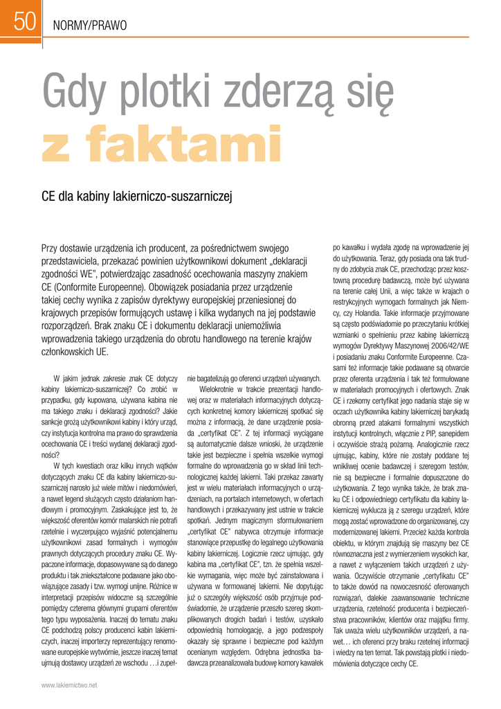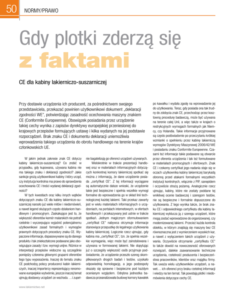 50 normy/prawo Gdy plotki zderzą się z faktami CE dla kabiny lakierniczo-suszarniczej Przy dostawie urządzenia ich producent, za pośrednictwem swojego przedstawiciela, przekazać powinien użytkownikowi dokument „deklaracji zgodności WE”, potwierdzając zasadność ocechowania maszyny znakiem CE (Conformite Europeenne). Obowiązek posiadania przez urządzenie takiej cechy wynika z zapisów dyrektywy europejskiej przeniesionej do krajowych przepisów formujących ustawę i kilka wydanych na jej podstawie rozporządzeń. Brak znaku CE i dokumentu deklaracji uniemożliwia wprowadzenia takiego urządzenia do obrotu handlowego na terenie krajów członkowskich UE. W jakim jednak zakresie znak CE dotyczy kabiny lakierniczo-suszarniczej? Co zrobić w przypadku, gdy kupowana, używana kabina nie ma takiego znaku i deklaracji zgodności? Jakie sankcje grożą użytkownikowi kabiny i który urząd, czy instytucja kontrolna ma prawo do sprawdzenia ocechowania CE i treści wydanej deklaracji zgodności? W tych kwestiach oraz kilku innych wątków dotyczących znaku CE dla kabiny lakierniczo-suszarniczej narosło już wiele mitów i niedomówień, a nawet legend służących często działaniom handlowym i promocyjnym. Zaskakujące jest to, że większość oferentów komór malarskich nie potrafi rzetelnie i wyczerpująco wyjaśnić potencjalnemu użytkownikowi zasad formalnych i wymogów prawnych dotyczących procedury znaku CE. Wypaczone informacje, dopasowywane są do danego produktu i tak zniekształcone podawane jako obowiązujące zasady i tzw. wymogi unijne. Różnice w interpretacji przepisów widoczne są szczególnie pomiędzy czterema głównymi grupami oferentów tego typu wyposażenia. Inaczej do tematu znaku CE podchodzą polscy producenci kabin lakierniczych, inaczej importerzy reprezentujący renomowane europejskie wytwórnie, jeszcze inaczej temat ujmują dostawcy urządzeń ze wschodu …i zupełwww.lakiernictwo.net nie bagatelizują go oferenci urządzeń używanych. Wielokrotnie w trakcie prezentacji handlowej oraz w materiałach informacyjnych dotyczących konkretnej komory lakierniczej spotkać się można z informacją, że dane urządzenie posiada „certyfikat CE”. Z tej informacji wyciągane są automatycznie dalsze wnioski, że urządzenie takie jest bezpieczne i spełnia wszelkie wymogi formalne do wprowadzenia go w skład linii technologicznej każdej lakierni. Taki przekaz zawarty jest w wielu materiałach informacyjnych o urządzeniach, na portalach internetowych, w ofertach handlowych i przekazywany jest ustnie w trakcie spotkań. Jednym magicznym sformułowaniem „certyfikat CE” nabywca otrzymuje informacje stanowiące przepustkę do legalnego użytkowania kabiny lakierniczej. Logicznie rzecz ujmując, gdy kabina ma „certyfikat CE”, tzn. że spełnia wszelkie wymagania, więc może być zainstalowana i używana w formowanej lakierni. Nie dopytując już o szczegóły większość osób przyjmuje podświadomie, że urządzenie przeszło szereg skomplikowanych drogich badań i testów, uzyskało odpowiednią homologację, a jego podzespoły okazały się sprawne i bezpieczne pod każdym ocenianym względem. Odrębna jednostka badawcza przeanalizowała budowę komory kawałek po kawałku i wydała zgodę na wprowadzenie jej do użytkowania. Teraz, gdy posiada ona tak trudny do zdobycia znak CE, przechodząc przez kosztowną procedurę badawczą, może być używana na terenie całej Unii, a więc także w krajach o restrykcyjnych wymogach formalnych jak Niemcy, czy Holandia. Takie informacje przyjmowane są często podświadomie po przeczytaniu krótkiej wzmianki o spełnieniu przez kabinę lakierniczą wymogów Dyrektywy Maszynowej 2006/42/WE i posiadaniu znaku Conformite Europeenne. Czasami też informacje takie podawane są otwarcie przez oferenta urządzenia i tak też formułowane w materiałach promocyjnych i ofertowych. Znak CE i rzekomy certyfikat jego nadania staje się w oczach użytkownika kabiny lakierniczej barykadą obronną przed atakami formalnymi wszystkich instytucji kontrolnych, włącznie z PIP, sanepidem i oczywiście strażą pożarną. Analogicznie rzecz ujmując, kabiny, które nie zostały poddane tej wnikliwej ocenie badawczej i szeregom testów, nie są bezpieczne i formalnie dopuszczone do użytkowania. Z tego wynika także, że brak znaku CE i odpowiedniego certyfikatu dla kabiny lakierniczej wyklucza ją z szeregu urządzeń, które mogą zostać wprowadzone do organizowanej, czy modernizowanej lakierni. Przecież każda kontrola obiektu, w którym znajdują się maszyny bez CE równoznaczna jest z wymierzeniem wysokich kar, a nawet z wyłączeniem takich urządzeń z używania. Oczywiście otrzymanie „certyfikatu CE” to także dowód na nowoczesność oferowanych rozwiązań, dalekie zaawansowanie techniczne urządzenia, rzetelność producenta i bezpieczeństwa pracowników, klientów oraz majątku firmy. Tak uważa wielu użytkowników urządzeń, a nawet… ich oferenci przy braku rzetelnej informacji i wiedzy na ten temat. Tak powstają plotki i niedomówienia dotyczące cechy CE. normy/prawo Jak do oceny oferowanych kabin lakierniczych podejdzie jego przyszły nabywca gdy dowie się, że „certyfikat CE” to… mit, plotka i dokument, który nie ma żadnej podstawy formalno-prawnej? Gdy potencjalny nabywca komory dowie się, że znak CE umieszcza na kabinie jej producent, to czy nadal uważać ją będzie za bezpieczną, nowoczesną i zgodną z wymogami prawa? Czy posiadając wiedzę o niezbitych faktach przeczących opisanym wcześniej mitom i plotkom, użytkownik komory lakierniczej nadal ze spokojem czekać będzie na wizytę instytucji kontrolnych? W zderzeniu z faktami, czyli wymogami szczegółowych rozporządzeń wydanych na podstawie ustawy z dnia 30 sierpnia 2002 r. o systemie oceny zgodności (Dz. U. z 2004 r. nr 204 poz. 2087 oraz z 2005 r. nr 64, poz. 565) wskazywanie na bezpieczeństwo rzekomo cert