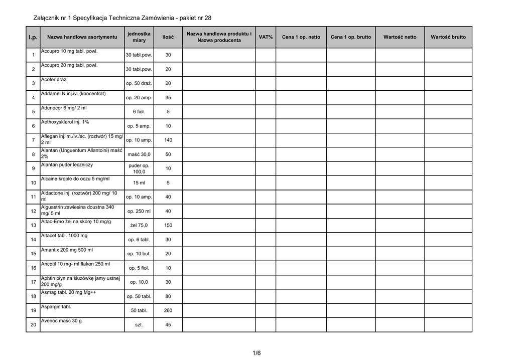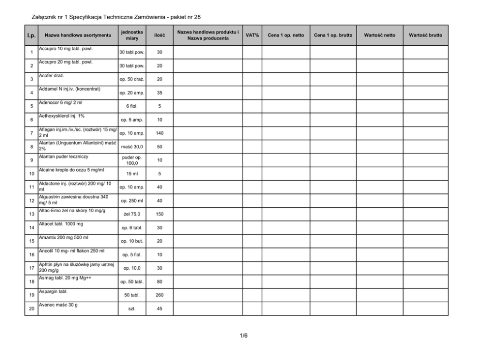Załącznik nr 1 Specyfikacja Techniczna Zamówienia - pakiet nr 28 jednostka miary ilość 30 tabl.pow. 30 30 tabl.pow. 20 op. 50 draż. 20 op. 20 amp. 35 6 fiol. 5 op. 5 amp. 10 7 Aflegan inj.im./iv./sc. (roztwór) 15 mg/ op. 10 amp. 2 ml 140 8 Alantan (Unguentum Allantoini) maść 2% maść 30,0 50 puder op. 100,0 10 15 ml 5 l.p. 1 2 3 4 5 6 9 10 Nazwa handlowa asortymentu Accupro 10 mg tabl. powl. Accupro 20 mg tabl. powl. Acofer draż. Addamel N inj.iv. (koncentrat) Adenocor 6 mg/ 2 ml Aethoxysklerol inj. 1% Alantan puder leczniczy Alcaine krople do oczu 5 mg/ml 11 Aldactone inj. (roztwór) 200 mg/ 10 ml op. 10 amp. 40 12 Alguastrin zawiesina doustna 340 mg/ 5 ml op. 250 ml 40 żel 75,0 150 op. 6 tabl. 30 op. 10 but. 20 op. 5 fiol. 10 op. 10,0 30 op. 50 tabl. 80 50 tabl. 260 szt. 45 13 14 15 16 17 18 19 20 Altac-Emo żel na skórę 10 mg/g Altacet tabl. 1000 mg Amantix 200 mg 500 ml Ancotil 10 mg- ml flakon 250 ml Aphtin płyn na śluzówkę jamy ustnej 200 mg/g Asmag tabl. 20 mg Mg++ Aspargin tabl. Avenoc maśc 30 g Nazwa handlowa produktu i Nazwa producenta VAT% 1/6 Cena 1 op. netto Cena 1 op. brutto Wartość netto Wartość brutto Załącznik nr 1 Specyfikacja Techniczna Zamówienia - pakiet nr 28 21 Berodual płyn do inhalacji(0,5mg+0,25mg)ml op. 20 ml 80 22 Bupivacain h/chlor 0,5% 5 mg/ ml inj. 10 ml op. x 10 amp. 50 op. 10 amp. 220 10 amp. 700 op. 16 tabl. mus. 300 op. x 125 tabl. pow. 60 op. 50 draż. 5 op. x 28 tabl. 300 op. 100 ml 35 30 tabl. 20 op. 30 tabl. 40 op. 10 czop. 500 op. 5,0 maść 60 op. 100 tabl. pow. 40 op. 20 tabl. 80 150 ml 50 op. 10 fiol. 150 Esputicon kaps. 50 mg op. 100 kaps. 200 Fortrans 74,0 torebki / Rekomendowany przez ESGE/ op. x 1 torebka 3000 op. 14 kaps. 60 op. 10 fiol. 60 23 Buscolysin inj. (roztwór) 20 mg/ 1 ml 24 Calcium chlorat. 10% 1000 mg/10 ml x 10 amp. 25 Calcium tabl. musujące 210 mg / dawka wycofana jest dawka min. 180mg Ca 26 27 28 29 30 31 32 33 34 35 36 37 38 39 40 41 Cerutin tabl. powl. Colchicum Dispert 0,5 mg tabl. Concor – Cor tabl. 2,5 mg Crotamiton 10% /100 g Cyclonamine 250 mg tabl Cytotec tabl. 0,2 mg Czopki Glicerynowe – suppositoria Glyceroli czopki 2000 mg Detremycyna 1% maść 10 mg/g Dormicum tabl. powl. 15 mg Duphaston tabl. 10 mg Enema płyn Esmeron inj.iv. (roztwór) 100 mg/ 10 ml Gliatilin kaps. 400 mg Glycophos inj.iv. (koncentrat) 2/6 Załącznik nr 1 Specyfikacja Techniczna Zamówienia - pakiet nr 28 42 43 44 45 46 47 48 49 50 51 52 53 54 55 56 57 58 59 60 61 62 63 Glypressin 1mg/8,5ml/iv. Halidor tabl. 100 mg Haloperidol inj. (roztwór) 5 mg/ 1 ml Hemorol czopki Hepa Merz 5 g/ 10 ml inj. iv. Hydroxyzinum draż. 25 mg Infacol 40mg/ml , 50ml zwies. Iomeron 300mg/50 ml Kalium h/mang 100 mg tabl. Klacid inject. 500 mg Klarmin 500 mg tabl. powl. Lidocain aerosol 10% aerozol do jamy ustnej I gardła 10% Maxipime 1000 mg iv. Maxitrol krople 5 ml Metypred tabl. 4 mg Metypred tabl.16 mg Milgamma N 2 ml amp. Mucosolvan płyn do inhalacji 7,5 mg/ ml Mucosolvan syrop 30 mg/ 5 ml Mydocalm 50 mg tabl. Nasivin 0,01% krople do nosa Nimotop S 0,2 mg/ml inj. iv. op. 5 amp. 15 op. 50 tabl. 5 10 amp. 50 op. 12 czop. 80 op. x 10 amp. 120 op. 30 draż. 60 szt. 10 szt. 150 op. x 30 tabl. 45 fiol. 150 op. x 14 tabl. 10 x op. 25 ml 30 fiol. 30 op. 50 op. 30 tabl. 10 op. 30 tabl. 10 op. x 5 amp. 900 op. 100 ml 20 op. 100 ml syrop 15 op. x 30 tabl. 10 op. x 5 ml 20 fiol. 50 ml 20 3/6 Załącznik nr 1 Specyfikacja Techniczna Zamówienia - pakiet nr 28 64 65 66 67 68 69 Nitrendypina tabl. 10 mg Nivalin 5 mg/ 1 ml amp. Norcuron inj.iv. (s.subst.) 10 mg Normalac syrop 2,5 g/ 5 ml Novoseven 2mg/100Kjm/ inj. Oekolp krem dopochwowy 1 mg/ g op. 30 tabl. 30 op. x 10 amp. 10 op. 10 amp. 200 op. 200 ml syrop 120 fiol. 15 op. 25,0 krem 60 70 Oxytocin inj.im./iv. (roztwór) 5 j.m./ 1 ml op. 10 amp. 900 71 Panthenol aerozol na skórę 46,3 mg/ g op. 130,0 15 op. x 10 czopków 20 op. 150,0 90 op. 50 tabl. 300 op. 10 amp. 30 op. 15,0 maść 25 op. 90 454 g 5 op. 30,0 żel 40 op. 5 amp. 15 op. x 6 czopków 100 op. 100 10 op. 20,0 maść 10 op. 20,0 żel 15 1 fiol. 10 72 73 74 75 76 77 78 79 80 81 82 83 84 85 Paracetamol 50 mg czopki Paracetamol syrop 120 mg/ 5 ml Paracetamol tabl. 500 mg Perlinganit inj.iv. (roztwór) 1 mg/ ml Pimafucort maść Presartan 50 mg x 30 tabl. Resonium A proszek Rivel żel do użytku zewnętrznego 0,5% Rytmonorm inj. (roztwór) 3,5 mg/ ml Scopolan 10 mg czopki Silol aerozol na skórę,205,6mg/ml Solcoseryl maść 2% Solcoseryl żel do użytku zewnętrznego 4 mg/ g Solu Medrol 40 mg fiol. 4/6 Załącznik nr 1 Specyfikacja Techniczna Zamówienia - pakiet nr 28 86 87 88 89 Solu Medrol 500 mg fiol. Soluvit N inj. Sylimarol 70 mg draż 70 mg Szałwia fix. x 30 szt. 2 fiol. 20 op. 10 fiol. 80 op. 30 draż. 60 op. 50 90 Szczepionka tężcowa adsorbowana (T) inj.sc. (roztwór) 40 j.m./0,5 ml op. 3 amp. 35 91 Tardyferon-Fol tabl.o prz. uwaln. 80 mg Fe++ op. 30 tabl. 80 92 Targocid 200 mg i nj. im/iv.fiol + rozpuszczalnik fiol. 30 poj. 250 ml 250 op. 10 tabl. 70 30 tabl. pow. 40 op. 5 amp. 250 op. 40 kaps. 30 op. 28 kaps. 20 op. 15,0 maść 30 op. 20 kaps. 800 op. 10 ml krople 30 op. 60 draż. 15 op. 50 ml 10 op. 50 tabl. 10 Vitalipid Infant inj. 10ml op. x 10 amp. 15 Vitalipid N Adult inj. iv. 10 ml op. x 10 amp. 60 93 94 95 96 97 98 99 Theophylinum 300 mg/ 250 ml iv Thiocodin tabl. Thiogamma 600 mg tabl. powl. Thiogamma Turbo Set 600 mg/50 ml inject. Trandogen 0,5 kaps. 0,5 mg Trandogen 2,0 kaps. 2 mg Triderm maść Trilac kaps. z liofilizatem 1,6 mld 100 komórek Tropicamidum 0,5% krople do oczu 5 101 mg/ml 102 103 104 105 106 Urosept draż. Vagothyl płyn dopochwowy 360 mg/ g Viregyt K 100 mg tabl. 5/6 Załącznik nr 1 Specyfikacja Techniczna Zamówienia - pakiet nr 28 Wodny Roztwór Fioletu 107 Gencjanowego 1% roztwór antyspetyczny 108 109 Xifaxan 200 mg tabl. powl. Zyvoxid 2 mg/ ml worki 300 ml op. 20,0 100 28 tabl. 40 op. x 1 worek 100 SUMA 6/6