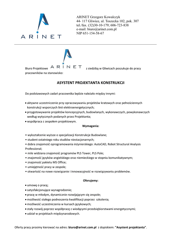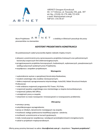 ARINET Grzegorz Kowalczyk 44- 117 Gliwice, ul. Toszecka 102, pok. 307 tel./fax. (32)30-10-179; 606-723-838 e-mail: [email protected] NIP 651-154-58-67 Biuro Projektowe pracowników na stanowisko: z siedzibą w Gliwicach poszukuje do pracy ASYSTENT PROJEKTANTA KONSTRUKCJI Do podstawowych zadań pracownika będzie należało między innymi: aktywne uczestniczenie przy opracowywaniu projektów kratowych oraz pełnościennych konstrukcji wsporczych linii elektroenergetycznych; przygotowywanie projektów koncepcyjnych, budowlanych, wykonawczych, powykonawczych według wytycznych podanych przez Projektanta; współpraca z zespołem projektowym. Wymagania: • wykształcenie wyższe o specjalizacji Konstrukcje Budowlane; • student ostatniego roku studiów niestacjonarnych; • dobra znajomość oprogramowania inżynierskiego: AutoCAD, Robot Structural Analysis Professional; • mile widziana znajomość programów PLS Tower, PLS Pole; • znajomość języków angielskiego oraz niemieckiego w stopniu komunikatywnym; • znajomość pakietu MS Office; • umiejętność pracy w zespole; • otwartość na nowe rozwiązanie i innowacyjność w rozwiązywaniu problemów. Oferujemy: umowę o pracę; satysfakcjonujące wynagrodzenie; pracę w młodym, dynamicznie rozwijającym się zespole; możliwość stałego podnoszenia kwalifikacji poprzez szkolenia; możliwość uczestniczenia w kursach językowych; stały rozwój poprzez współpracę z wiodącymi przedsiębiorstwami energetycznymi; udział w projektach międzynarodowych. Oferty pracy prosimy kierować na adres: [email protected] z dopiskiem: "Asystent projektanta".
