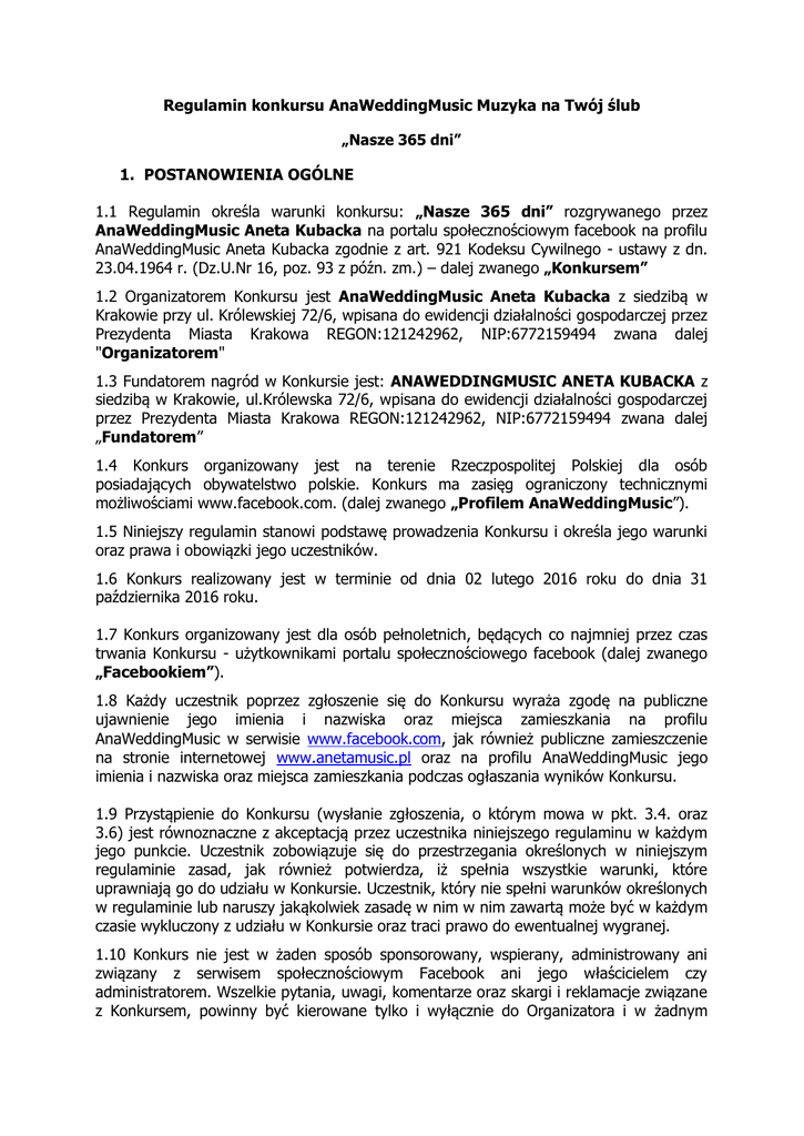 Regulamin konkursu AnaWeddingMusic Muzyka na Twój ślub „Nasze 365 dni” 1. POSTANOWIENIA OGÓLNE 1.1 Regulamin określa warunki konkursu: „Nasze 365 dni” rozgrywanego przez AnaWeddingMusic Aneta Kubacka na portalu społecznościowym facebook na profilu AnaWeddingMusic Aneta Kubacka zgodnie z art. 921 Kodeksu Cywilnego - ustawy z dn. 23.04.1964 r. (Dz.U.Nr 16, poz. 93 z późn. zm.) – dalej zwanego „Konkursem” 1.2 Organizatorem Konkursu jest AnaWeddingMusic Aneta Kubacka z siedzibą w Krakowie przy ul. Królewskiej 72/6, wpisana do ewidencji działalności gospodarczej przez Prezydenta Miasta Krakowa REGON:121242962, NIP:6772159494 zwana dalej "Organizatorem" 1.3 Fundatorem nagród w Konkursie jest: ANAWEDDINGMUSIC ANETA KUBACKA z siedzibą w Krakowie, ul.Królewska 72/6, wpisana do ewidencji działalności gospodarczej przez Prezydenta Miasta Krakowa REGON:121242962, NIP:6772159494 zwana dalej „Fundatorem” 1.4 Konkurs organizowany jest na terenie Rzeczpospolitej Polskiej dla osób posiadających obywatelstwo polskie. Konkurs ma zasięg ograniczony technicznymi możliwościami www.facebook.com. (dalej zwanego „Profilem AnaWeddingMusic”). 1.5 Niniejszy regulamin stanowi podstawę prowadzenia Konkursu i określa jego warunki oraz prawa i obowiązki jego uczestników. 1.6 Konkurs realizowany jest w terminie od dnia 02 lutego 2016 roku do dnia 31 października 2016 roku. 1.7 Konkurs organizowany jest dla osób pełnoletnich, będących co najmniej przez czas trwania Konkursu - użytkownikami portalu społecznościowego facebook (dalej zwanego „Facebookiem”). 1.8 Każdy uczestnik poprzez zgłoszenie się do Konkursu wyraża zgodę na publiczne ujawnienie jego imienia i nazwiska oraz miejsca zamieszkania na profilu AnaWeddingMusic w serwisie www.facebook.com, jak również publiczne zamieszczenie na stronie internetowej www.anetamusic.pl oraz na profilu AnaWeddingMusic jego imienia i nazwiska oraz miejsca zamieszkania podczas ogłaszania wyników Konkursu. 1.9 Przystąpienie do Konkursu (wysłanie zgłoszenia, o którym mowa w pkt. 3.4. oraz 3.6) jest równoznaczne z akceptacją przez uczestnika niniejszego regulaminu w każdym jego punkcie. Uczestnik zobowiązuje się do przestrzegania określonych w niniejszym regulaminie zasad, jak również potwierdza, iż spełnia wszystkie warunki, które uprawniają go do udziału w Konkursie. Uczestnik, który nie spełni warunków określonych w regulaminie lub naruszy jakąkolwiek zasadę w nim w nim zawartą może być w każdym czasie wykluczony z udziału w Konkursie oraz traci prawo do ewentualnej wygranej. 1.10 Konkurs nie jest w żaden sposób sponsorowany, wspierany, administrowany ani związany z serwisem społecznościowym Facebook ani jego właścicielem czy administratorem. Wszelkie pytania, uwagi, komentarze oraz skargi i reklamacje związane z Konkursem, powinny być kierowane tylko i wyłącznie do Organizatora i w żadnym wypadku nie należy ich kierować społecznościowego Faceboook. do właściciela czy administratora serwisu 1.11 Adres e-mail Organizatora, pod którym można uzyskać informacje na temat organizacji Konkursu: [email protected] 2. NAGRODY 2.1 Zwycięzca Konkursu otrzyma nagrodę w postaci specjalnie zaprojektowanego i stworzonego z jego własnych zdjęć ślubnych kalendarza o wartości 80 PLN brutto (słownie: 80 złotych). 2.2 O szczegółach odbioru i realizacji nagród zwycięzcy Konkursu zostaną poinformowani przez Organizatora drogą mailową lub za pośrednictwem rozmowy telefonicznej. 2.3 Organizator nie ponosi odpowiedzialności za niemożność odbioru lub nieodebranie nagrody, z jakiejkolwiek przyczyny leżącej po stronie nagrodzonego uczestnika. 2.4 Organizator nie ponosi odpowiedzialności za zmianę miejsca zamieszkania i/lub podanego przez uczestnika Konkursu adresu lub zmianę innych danych – uniemożliwiającą kontakt z tym uczestnikiem lub odebranie przez niego zestawu nagród/nagrody. 2.5 Organizator oświadcza, iż wszystkie nagrody zostaną wydane zgodnie z przepisami prawa podatkowego. 2.6 Nagrody nie odebrane przez zwycięzcę Konkursu przechodzą na własność Organizatora. 2.7 Przy odbiorze przez zwycięzcę edycji Konkursu nagrody zobowiązany jest on okazać dokument potwierdzający jego tożsamość. 2.8 Wszystkie nagrody pozostają własnością Fundatora do momentu przekazania ich zwycięzcy Konkursu. 3. ZASADY UCZESTNICTWA W KONKURSIE 3.1 Konkurs rozgrywany jest w Internecie na portalu www.facebook.com na Profilu AnaWeddingMusic. 3.2 W celu wzięcia udziału w konkursie należy zarezerwować u Organizatora termin oprawy muzycznej ceremonii ślubnej w sezonie ślubnym 2016. 3.3 Ogólne zasady Konkursu podane są przez Organizatora na stronie www.anetamusic.pl oraz w postach promocyjnych informujących o Konkursie na profilu AnaWeddingMusic. 3.3 Zadaniem konkursowym jest dokończenie w ciekawy, kreatywny i zabawny sposób zdania „Nasze wspólne 365 dni ….”, które umieszczone jest na stronie www.anetamusic.pl w zakładce „Konkursy” oraz w poście promującym Konkurs umieszczonym na profilu AnaWeddingMusic na Facebook’u przypiętym u góry tablicy profilu AnaWedddingMusic. 3.4 Zgłoszenie do udziału w konkursie następuje poprzez napisanie zakończenia zdania, o którym mowa w pkt. 3.3, na Profilu ANAWEDDINGMUSIC w komentarzu pod postem informującym o Konkursie w okresie trwania Konkursu. 3.5 Zgłoszenie dokończenia zdania jest równoznaczne ze złożeniem przez uczestnika oświadczenia, że jest on autorem tego zdania i posiada pełne prawa autorskie do korzystania z niego a w przypadku gdy uczestnik zgłaszający zakończenie zdania nie jest jego autorem, że uzyskał zgodę autora na jego zgłoszenie do konkursu i publikację podczas konkursu na Facebooku (w tym na Profilu ANAWEDDINGMUSIC), a także po jego zakończeniu. 3.6 Uczestnik zgłaszający zakończenie zdania do konkursu ponosi pełną odpowiedzialność prawną za prawdziwość po