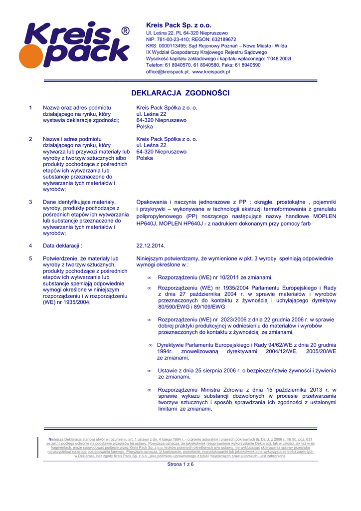 Kreis Pack Sp. z o.o. Ul. Leśna 22, PL 64-320 Niepruszewo NIP: 781-00-23-410; REGON: 632189672 KRS: 0000113495; Sąd Rejonowy Poznań – Nowe Miasto i Wilda IX Wydział Gospodarczy Krajowego Rejestru Sądowego Wysokość kapitału zakładowego i kapitału wpłaconego: 1’048’200zł Telefon: 61 8940570, 61 8940580, Faks: 61 8940590 [email protected]; www.kreispack.pl __________________________________________________________________________________________ DEKLARACJA ZGODNOŚCI 1 Nazwa oraz adres podmiotu działającego na rynku, który wystawia deklarację zgodności; Kreis Pack Spółka z o. o. ul. Leśna 22 64-320 Niepruszewo Polska 2 Nazwa i adres podmiotu działającego na rynku, który wytwarza lub przywozi materiały lub wyroby z tworzyw sztucznych albo produkty pochodzące z pośrednich etapów ich wytwarzania lub substancje przeznaczone do wytwarzania tych materiałów i wyrobów; Kreis Pack Spółka z o. o. ul. Leśna 22 64-320 Niepruszewo Polska 3 Dane identyfikujące materiały, wyroby, produkty pochodzące z pośrednich etapów ich wytwarzania lub substancje przeznaczone do wytwarzania tych materiałów i wyrobów; Opakowania i naczynia jednorazowe z PP : okrągłe, prostokątne , pojemniki i przykrywki – wykonywane w technologii ekstruzji termoformowania z granulatu polipropylenowego (PP) noszącego następujące nazwy handlowe MOPLEN HP640J, MOPLEN HP640J - z nadrukiem dokonanym przy pomocy farb 4 Data deklaracji : 22.12.2014. 5 Potwierdzenie, że materiały lub wyroby z tworzyw sztucznych, produkty pochodzące z pośrednich etapów ich wytwarzania lub substancje spełniają odpowiednie wymogi określone w niniejszym rozporządzeniu i w rozporządzeniu (WE) nr 1935/2004; Niniejszym potwierdzamy, że wymienione w pkt. 3 wyroby spełniają odpowiednie wymogi określone w : • Rozporządzeniu (WE) nr 10/2011 ze zmianami, • Rozporządzeniu (WE) nr 1935/2004 Parlamentu Europejskiego i Rady z dnia 27 października 2004 r. w sprawie materiałów i wyrobów przeznaczonych do kontaktu z żywnością i uchylającego dyrektywy 80/590/EWG i 89/109/EWG • Rozporządzeniu (WE) nr 2023/2006 z dnia 22 grudnia 2006 r. w sprawie dobrej praktyki produkcyjnej w odniesieniu do materiałów i wyrobów przeznaczonych do kontaktu z żywnością ze zmianami, • Dyrektywie Parlamentu Europejskiego i Rady 94/62/WE z dnia 20 grudnia 1994r. znowelizowaną dyrektywami 2004/12/WE, 2005/20/WE ze zmianami, • Ustawie z dnia 25 sierpnia 2006 r. o bezpieczeństwie żywności i żywienia ze zmianami, • Rozporządzeniu Ministra Zdrowia z dnia 15 października 2013 r. w sprawie wykazu substancji dozwolonych w procesie przetwarzania tworzyw sztucznych i sposób sprawdzania ich zgodności z ustalonymi limitami ze zmianami, __________________________________________________________________________________________ Niniejsza Deklaracja stanowi utwór w rozumieniu art. 1 ustawy z dn. 4 lutego 1994 r. - o prawie autorskim i prawach pokrewnych (tj. Dz.U. z 2006 r., Nr 90, poz. 631 ze zm.) i podlega ochronie na podstawie przepisów tej ustawy. Powyższe oznacza, że jakiekolwiek nieuprawnione wykorzystanie Deklaracji, tak w całości, jak też w jej fragmentach, może spowodować podjęcie przez Kreis Pack Sp. z o.o. kroków prawnych określonych w/w ustawą, nie wykluczając skierowania sprawy przeciwko naruszycielowi na drogę postępowania karnego. Powyższe oznacza, iż kopiowanie, powielanie, reprodukowanie lub jakiekolwiek inne wykorzystanie treści zawartych w Deklaracji, bez zgody Kreis Pack Sp. z o.o., jako podmiotu uprawnionego z tytułu majątkowych praw autorskich - jest zabronione. ___________________________________________________________________________________________________________________________________________________________________ Strona 1 z 6 Kreis Pack Sp. z o.o. Ul. Leśna 22, PL 64-320 Niepruszewo NIP: 781-00-23-410; REGON: 632189672 KRS: 0000113495; Sąd Rejonowy Poznań – Nowe Miasto i Wilda IX Wydział Gospodarczy Krajowego Rejestru Sądowego Wysokość kapitału zakładowego i kapitału wpłaconego: 1’048’200zł Telefon: 61 8940570, 61 8940580, Faks: 61 8940590 [email protected]; www.kreispack.pl __________________________________________________________________________________________ • 6 7 Ustawie z dnia 13 czerwca 2013 2013r. o gospodarce opakowaniami i odpadami opakowaniowymi, Odpowiednie informacje dotyczące wykorzystywanych substancji lub produktów ich rozpadu, dla których w załączniku I i II niniejszego rozporządzenia określone zostały ograniczenia lub wymagania, aby umożliwić podmiotom działającym na rynku na dalszych etapach obrotu zapewnienie zgodności z tymi ograniczeniami; Monomery i substancje wchodzące w skład opisanych artykułów są umieszczone w wykazie w załączniku nr I do Rozporządzenia (WE) nr 10/2011 - Unijny Wykazie dozwolonych monomerów, innych substancji wyjściowych, makrocząsteczek uzyskiwanych z fermentacji mikrobiologicznej, dodatków oraz substancji pomocniczych w produkcji polimerów. Odpowiednie informacje dotyczące substancji podlegających ograniczeniom w żywności, uzyskane z danych doświadczalnych lub w drodze teoretycznych obliczeń dotyczących poziomu ich migracji specyficznej oraz – w odpowiednich przypadkach – kryteria czystości zgodnie z dyrektywami 2008/60/WE, 95/45/WE i 2008/84/WE w celu umożliwienia użytkownikowi tych materiałów i wyrobów zgodności z odpowiednimi przepisami UE lub – w razie ich braku przepisami krajowymi mającymi zastosowanie do żywności; Ta deklaracja opiera się na wynikach testów przeprowadzonych przez niezależne, akredytowane i certyfikowane laboratoria. Wszystkie poziomy migracji są w zgodzie ze wspomnianymi aktami prawnymi. W szczególności limit migracji globalnej i limity migracji specyficznych dla naszych artykułów są poprawne. Badania migracji globalnej wykonano przez Centrum Laboratoriów Higienicznych w Ostrawie w dniach 21.09.-17.10.2012. Zgodnie
