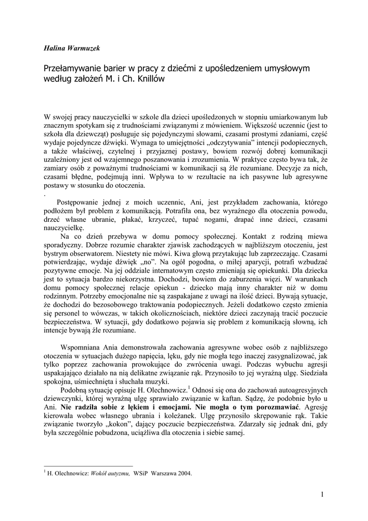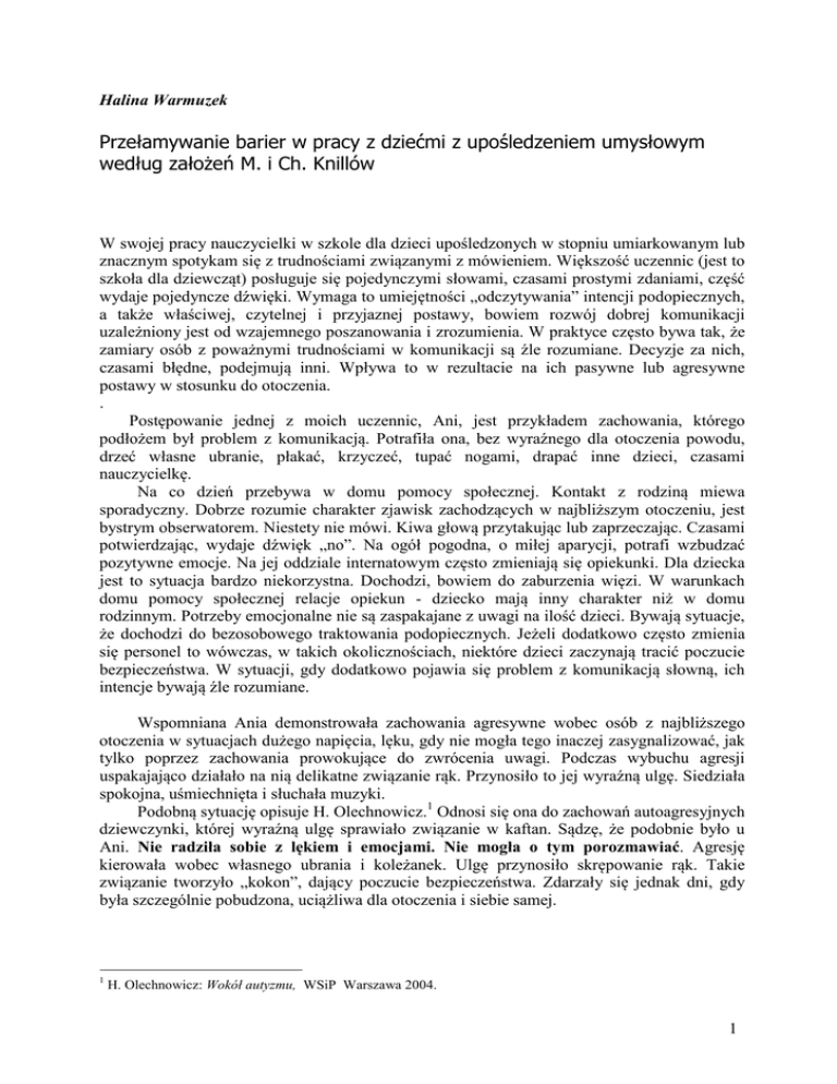 Halina Warmuzek Przełamywanie barier w pracy z dziećmi z upośledzeniem umysłowym według założeń M. i Ch. Knillów W swojej pracy nauczycielki w szkole dla dzieci upośledzonych w stopniu umiarkowanym lub znacznym spotykam się z trudnościami związanymi z mówieniem. Większość uczennic (jest to szkoła dla dziewcząt) posługuje się pojedynczymi słowami, czasami prostymi zdaniami, część wydaje pojedyncze dźwięki. Wymaga to umiejętności „odczytywania” intencji podopiecznych, a także właściwej, czytelnej i przyjaznej postawy, bowiem rozwój dobrej komunikacji uzależniony jest od wzajemnego poszanowania i zrozumienia. W praktyce często bywa tak, że zamiary osób z poważnymi trudnościami w komunikacji są źle rozumiane. Decyzje za nich, czasami błędne, podejmują inni. Wpływa to w rezultacie na ich pasywne lub agresywne postawy w stosunku do otoczenia. . Postępowanie jednej z moich uczennic, Ani, jest przykładem zachowania, którego podłożem był problem z komunikacją. Potrafiła ona, bez wyraźnego dla otoczenia powodu, drzeć własne ubranie, płakać, krzyczeć, tupać nogami, drapać inne dzieci, czasami nauczycielkę. Na co dzień przebywa w domu pomocy społecznej. Kontakt z rodziną miewa sporadyczny. Dobrze rozumie charakter zjawisk zachodzących w najbliższym otoczeniu, jest bystrym obserwatorem. Niestety nie mówi. Kiwa głową przytakując lub zaprzeczając. Czasami potwierdzając, wydaje dźwięk „no”. Na ogół pogodna, o miłej aparycji, potrafi wzbudzać pozytywne emocje. Na jej oddziale internatowym często zmieniają się opiekunki. Dla dziecka jest to sytuacja bardzo niekorzystna. Dochodzi, bowiem do zaburzenia więzi. W warunkach domu pomocy społecznej relacje opiekun - dziecko mają inny charakter niż w domu rodzinnym. Potrzeby emocjonalne nie są zaspakajane z uwagi na ilość dzieci. Bywają sytuacje, że dochodzi do bezosobowego traktowania podopiecznych. Jeżeli dodatkowo często zmienia się personel to wówczas, w takich okolicznościach, niektóre dzieci zaczynają tracić poczucie bezpieczeństwa. W sytuacji, gdy dodatkowo pojawia się problem z komunikacją słowną, ich intencje bywają źle rozumiane. Wspomniana Ania demonstrowała zachowania agresywne wobec osób z najbliższego otoczenia w sytuacjach dużego napięcia, lęku, gdy nie mogła tego inaczej zasygnalizować, jak tylko poprzez zachowania prowokujące do zwrócenia uwagi. Podczas wybuchu agresji uspakajająco działało na nią delikatne związanie rąk. Przynosiło to jej wyraźną ulgę. Siedziała spokojna, uśmiechnięta i słuchała muzyki. Podobną sytuację opisuje H. Olechnowicz.1 Odnosi się ona do zachowań autoagresyjnych dziewczynki, której wyraźną ulgę sprawiało związanie w kaftan. Sądzę, że podobnie było u Ani. Nie radziła sobie z lękiem i emocjami. Nie mogła o tym porozmawiać. Agresję kierowała wobec własnego ubrania i koleżanek. Ulgę przynosiło skrępowanie rąk. Takie związanie tworzyło „kokon”, dający poczucie bezpieczeństwa. Zdarzały się jednak dni, gdy była szczególnie pobudzona, uciążliwa dla otoczenia i siebie samej. 1 H. Olechnowicz: Wokół autyzmu, WSiP Warszawa 2004. 1 Postanowiłam przeprowadzić z nią sesje kontaktu podejściem „Dotyk i Komunikacja” Ch.Knilla, których celem jest stwarzanie odpowiednich warunków wspierających rozwój wzajemnej komunikacji. Ch. Knill2 uważa, że najbardziej wrażliwym kanałem sensorycznym, jaki posiadamy, jest skóra. Podstawowymi dla nas są informacja i stymulacja, którą otrzymujemy dzięki kontaktowi fizycznemu, dlatego dotyk jest dla naszego rozwoju szczególnie ważny. Sesje kontaktu należy przeprowadzać w dobrze zorganizowanych warunkach. Ważne są pora i stałość miejsca. Ta rytualizacja tworzy ramy dające poczucie bezpieczeństwa, wewnątrz których nasz partner może dowolnie eksperymentować i je przekraczać. Sesji towarzyszy specjalnie w tym celu skomponowana muzyka, której podstawową cechą jest to, że jej właściwości mają wpływ na wszystkich ludzi niezależnie od ich wieku i poziomu rozwoju oraz umiejętności komunikacji. Tworzy ona spokojną i bezpieczną atmosferę, która pomaga w duchowym przygotowaniu się do kontaktu, a następnie do dialogu z naszym partnerem. H. Olechnowicz zauważa, że „Dotykanie w takt znanej dziecku muzyki sprawia, że staje się ono przewidywalne.[...] Dziecko zwłaszcza upośledzone, zapamięta kolejne sekwencje sygnałów muzycznych łatwiej, niż słowa, których większości nie rozumie.”3 Przeprowadziłam z Anią pierwszą sesję. Jej reakcja okazała się dla mnie dużym zaskoczeniem. Moja partnerka bez żadnych oporów poddała się moim działaniom. W części sesji, w której znajdowała się ze mną w kontakcie wzrokowym, z uwagą i zdumieniem mi się przyglądała. Cały czas była spokojna, odprężona. Mówiłam do niej, nazywając poszczególne części ciała, które akurat dotykałam. Ton mojego głosu był spokojny, zharmonizowany z towarzyszącą muzyką. Ania prawdopodobnie po raz pierwszy znalazła się w sytuacji, gdy osoba znacząca poświęcała cały swój czas i uwagę tylko dla niej. Gdy sesja dobiegła końca, jeszcze chwilę leżała nieruchomo wpatrzona we mnie. Uśmiechała się. Wychodząc z sali oglądała się i gestem ręki mnie pożegnała. Było oczywiste, że nowe doświadczenie wywarło na niej duże wrażenie. Zachęciło mnie to do kontynuacji rozpoczętej terapii. Dwa razy w tygodniu przeprowadzałam z nią sesje kontaktu. Zdaniem Ch. Knilla „sesje kontaktu prowadzą do wzrostu wrażliwości interpersonalnej, otwartości i aktywnej komunikacji.[...] Stosowane regularnie i świadomie przyczyniają się do tego, że opiekun i partner są zdolni do zidentyfikowania swoich sygnałów, do zrozumienia ich, akceptacji i odpowiedzi na nie szybciej i łatwiej”.4 Prowadzona terapia zaowocowała poprawą nastroju uczennicy. Ustąpiły zachowania agresy