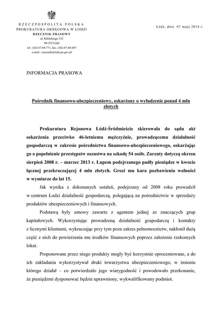RZECZPOSPOLITA POLSKA PROKURATURA OKRĘGOWA W ŁODZI Łódź, dnia 07 maja 2014 r. RZE CZNIK P RASOWY ul. Kilińskiego 152 90-322 Łódź tel.: (42) 67-68-771, fax.: (42) 67-68-607 e-mail : [email protected] INFORMACJA PRASOWA Pośrednik finansowo-ubezpieczeniowy, oskarżony o wyłudzenie ponad 4 mln złotych Prokuratura Rejonowa Łódź-Śródmieście skierowała do sądu akt oskarżenia przeciwko 46-letniemu mężczyźnie, prowadzącemu działalność gospodarczą w zakresie pośrednictwa finansowo-ubezpieczeniowego, oskarżając go o popełnienie przestępstw oszustwa na szkodę 54 osób. Zarzuty dotyczą okresu sierpień 2008 r. – marzec 2013 r. Łupem podejrzanego padły pieniądze w kwocie łącznej przekraczającej 4 mln złotych. Grozi mu kara pozbawienia wolności w wymiarze do lat 15. Jak wynika z dokonanych ustaleń, podejrzany od 2008 roku prowadził w centrum Łodzi działalność gospodarczą, polegającą na pośrednictwie w sprzedaży produktów ubezpieczeniowych i finansowych. Podstawą były umowy zawarte z agentem jednej ze znaczących grup kapitałowych. Wykorzystując prowadzoną działalność gospodarczą i kontakty z licznymi klientami, wykraczając przy tym poza zakres pełnomocnictw, nakłonił dużą część z nich do powierzenia mu środków finansowych poprzez założenie rzekomych lokat. Proponowane przez niego produkty mogły być korzystnie oprocentowane, a do ich zakładania wykorzystywał druki towarzystwa ubezpieczeniowego, w imieniu którego działał – co potwierdzało jego wiarygodność i powodowało przekonanie, że pieniędzmi dysponować będzie uprawniony, wykwalifikowany podmiot. 2 W rzeczywistości trafiały one na konto bankowe, z którego wypłacał je podejrzany, przeznaczając następnie na własne cele, w dużej części na spłatę swoich długów. Przyjmowanymi „lokatami” niejednokrotnie spłacał klientów, którzy powierzyli mu środki we wcześniejszym terminie. Z czasem jednak do towarzystwa ubezpieczeniowego zaczęli zgłaszać się niezadowoleni klienci, żądając zwrotu zainwestowanych pieniędzy. Niebawem podejrzany zaprzestał prowadzenia działalności gospodarczej i ślad po nim zaginął. W kwietniu ubiegłego roku, po wpłynięciu pierwszych zawiadomień o możliwości popełnienia ubezpieczeniowego), przestępstwa prokuratura (w śródmiejska tym ze wszczęła strony towarzystwa śledztwo. Wydano postanowienie o przedstawieniu zarzutów i rozpoczęto poszukiwania podejrzanego. Jak wskazują dowody, wśród pokrzywdzonych są osoby oszukane na kwoty 4 tys. złotych, ale i takie, które utraciły nawet 400 tys. złotych. Podczas przesłuchania mężczyzna częściowo przyznał się do zarzucanych mu czynów, negując przy tym wysokość szkody. Od września 2013 roku jest tymczasowo aresztowany. Rzecznik Prasowy Prokuratury Okręgowej w Łodzi Krzysztof Kopania
