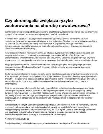 Czy akromegalia zwiększa ryzyko zachorowania na chorobę nowotworową? Zainteresowanie prawdopodobną zwiększoną częstością występowania chorób nowotworowych u chorych z nadmiarem hormonu wzrostu wynika z dwóch przesłanek. Hormony hGH jak i IGF-1 są czynnikami odpowiadającymi za wzrost komórek w ludzkim organizmie (obydwa hormony współdziałają w tym zakresie). Obydwa hormony wpływają zarówno na podział, jak i na zwiększenie się ilości komórek w organizmie, dlatego też budzą zainteresowanie pacjentów w zakresie podziału niekontrolowanego – doprowadzającego do powstania nowotworu złośliwego. Potwierdzonym faktem naukowym jest to, że długość życia chorych z aktywną akromegalią jest statystycznie krótsza od populacji z prawidłowym stężeniem IGF-1 i hGH. Przyczyny przedwczesnej umieralności są intensywnie badane, w celu ustalenia bezpośredniego czynnika sprawczego - co mogłoby doprowadzić do wyrównania średniej długości życia z populacją zdrową. Przyczyny przedwczesnej umieralności chorych z akromegalią nie różnią się od przyczyn w populacji ogólnej. Do dwóch głównych przyczyn należą choroby sercowo-naczyniowe oraz nowotwory złośliwe. Badania epidemiologiczne mające na celu ocenę częstości występowania chorób nowotworowych w tej wybranej grupie chorych są obarczone dużym błędem. Wynika to z faktu relatywnej rzadkości choroby – nie jest łatwo badaczom zebrać odpowiednio liczną i reprezentatywną grupę chorych, a także – być może przede wszystkim i paradoksalnie - ze ścisłego nadzoru nad chorymi z akromegalią. O ile do rozpoznania akromegalii dochodzi z wieloletnim opóźnieniem od czasu pojawienia się pierwszych objawów , to w przypadku istnienia jawnej choroby, leczący endokrynolog będąc świadom natury patologii i jej powikłań narządowych kieruje chorego na odpowiednie konsultacje i procedury. Oznacza to, że ta grupa chorych jest statystycznie częściej badana, poddawana diagnostyce, m.in obrazowej, co może skutkować większą ilością rozpoznanych nowotworów złośliwych. W badaniach, w których oceniano zależność pomiędzy umieralnością m.in. na nowotwory złośliwe u chorych z akromegalią, wyraźny jej spadek lub powrót do wartości równych z populacją następował przy obniżeniu stężenia hGH poniżej 2,0 - 2,5 ng/ml. Dane te podkreślają, jak istotne jest uzyskanie wskazanych wartości stężenia hormonu wzostu, niezależnie od rodzaju zastosowanego leczenia (chirurgia, farmakoterapia, radioterapia). Nowotwory jelita grubego Rak jelita grubego należy do najczęstszych nowotworów złośliwych w Polsce i na świecie, Strona 1 / 3 dotycząc obu płci. Należy również do najczęstszych przyczyn zgonów z powodu nowotworów złośliwych, głównie z powodu późnych (i zaawansowanych rozpoznań). Nie inaczej jest w grupie chorych z akromegalią. Doniesienia o zwiększonej zapadalności tych chorych na ten rodzaj nowotworu sięgają 1982 roku. Są to badania oparte najczęściej na analizie częstości występowania wszystkich polipów i zmian zweryfikowanych jako rak w badaniach kolonoskopowych. Na tej podstawie określono względne ryzyko wystąpienia nowotworu złośliwego raka jelita grubego na nawet 18-krotnie częstsze niż w populacji zdrowej. Badania te oprócz opisanych powyżej ograniczeń, mają dodatkowe wady. Kolonoskopia u osoby z akromegalią jest trudniejsza technicznie, a sam fakt wykonywania badania u osoby ze zwiększonym ryzykiem zmiany złośliwej wpływa na szczególnie baczną ocenę zmian przez endoskopistę. Co więcej, analiza liczby polipów, których ilość jest w rzeczywistości większa, nie przekłada się 1 do 1 na obecność lub nawet prawodopodobnieństwo wystąpienia raka – istnieją również zmiany polipowate o charakterze łagodnym. Dokładna analiza publikacji opartych na wynikach badań kolonoskopowych oraz populacyjnych – uznanych za dokładniejsze, zweryfikowała początkowe dane. Istnieje zwiększone ryzyko wystąpienia raka jelita grubego u chorych z akromegalią, ale jest ono zwiększone o około 2 razy. Tym niemniej, według obowiązujących standardów, chorzy z akromegalią należą do grupy o przeciętnym (jak w populacji ogólnej) ryzyku zachorowania na raka jelita grubego. Wpływa to na brak oddzielnych zaleceń odnośnie badań przesiewowych (kolonospokopowych) w tej grupie chorych. Nowotwory tarczycy Istnieją przekonywające dowody o częstszym występowaniu raka tarczycy u chorych z akromegalią. Obecność wola guzkowego w tej grupie chorych jest praktycznie regułą, z częstością występowania zmian palpacyjnych określaną na około 87%, a przypadkowo rozpoznanych zmian ogniskowych podczas ultrasonografii na około 92%. Stwierdzono także, że objętość wola (wielkość tarczycy) dodatnio koreluje ze stężeniem IGF-1 i hGH. Dane z kliku dużych badań populacyjnych potwierdzają zwiększone ryzyko wystąpienia raka tarczycy u chorych z akromegalią. Znana jest duża zmienność populacyjna, tym niemniej ryzyko oceniane jest na około 3,6 krotnie większe od populacji zdrowej. Zależność ta podkreśla konieczność rutynowej diagnostyki ultrasonograficznej i biopsyjnej zmian ogniskowych tarczycy w tej grupie chorych. Nowotwory gruczołu krokowego (prostaty) Zainteresowanie związkiem pomiędzy akromegalią, a rakiem prostaty wynika z obserwacji częstszego występowania tego nowotworu u osób z wysokim prawidłowym stężeniem IGF-1. U tych osób, badania z końca lat 90-tych wykazały 1,8 krotny wzrost względnego ryzyka zachorowania. Dane te nie przekładają się jednoznacznie na chorych z akromegalią, a wzrost ryzyka nie został Strona 2 / 3 Dane te nie przekładają się jednoznacznie na chorych z akromegalią, a wzrost ryzyka nie został jednoznacznie potwierdzony. Wynika to z faktu, że pod wpływem hGH w wątrobie dochodzi również do wzrostu syntezy białek wiążących IGF-1 (IGFBP), co w