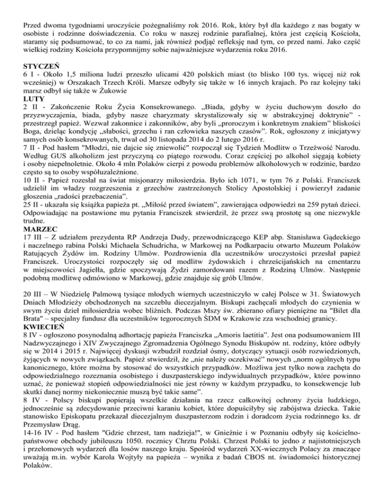 Przed dwoma tygodniami uroczyście pożegnaliśmy rok 2016. Rok, który był dla każdego z nas bogaty w osobiste i rodzinne doświadczenia. Co roku w naszej rodzinie parafialnej, która jest częścią Kościoła, staramy się podsumować, to co za nami, jak również podjąć refleksję nad tym, co przed nami. Jako część wielkiej rodziny Kościoła przypomnijmy sobie najważniejsze wydarzenia roku 2016. STYCZEŃ 6 I - Około 1,5 miliona ludzi przeszło ulicami 420 polskich miast (to blisko 100 tys. więcej niż rok wcześniej) w Orszakach Trzech Króli. Marsze odbyły się także w 16 innych krajach. Po raz kolejny taki marsz odbył się także w Żukowie LUTY 2 II - Zakończenie Roku Życia Konsekrowanego. „Biada, gdyby w życiu duchowym doszło do przyzwyczajenia, biada, gdyby nasze charyzmaty skrystalizowały się w abstrakcyjnej doktrynie” przestrzegł papież. Wezwał zakonnice i zakonników, aby byli „proroczym i konkretnym znakiem” bliskości Boga, dzieląc kondycję „słabości, grzechu i ran człowieka naszych czasów”. Rok, ogłoszony z inicjatywy samych osób konsekrowanych, trwał od 30 listopada 2014 do 2 lutego 2016 r. 7 II - Pod hasłem "Młodzi, nie dajcie się zniewolić" rozpoczął się Tydzień Modlitw o Trzeźwość Narodu. Według GUS alkoholizm jest przyczyną co piątego rozwodu. Coraz częściej po alkohol sięgają kobiety i osoby niepełnoletnie. Około 4 mln Polaków cierpi z powodu problemów alkoholowych w rodzinie, bardzo często są to osoby współuzależnione. 10 II - Papież rozesłał na świat misjonarzy miłosierdzia. Było ich 1071, w tym 76 z Polski. Franciszek udzielił im władzy rozgrzeszenia z grzechów zastrzeżonych Stolicy Apostolskiej i powierzył zadanie głoszenia „radości przebaczenia”. 25 II - ukazała się książka papieża pt. „Miłość przed światem”, zawierająca odpowiedzi na 259 pytań dzieci. Odpowiadając na postawione mu pytania Franciszek stwierdził, że przez swą prostotę są one niezwykle trudne. MARZEC 17 III – Z udziałem prezydenta RP Andrzeja Dudy, przewodniczącego KEP abp. Stanisława Gądeckiego i naczelnego rabina Polski Michaela Schudricha, w Markowej na Podkarpaciu otwarto Muzeum Polaków Ratujących Żydów im. Rodziny Ulmów. Pozdrowienia dla uczestników uroczystości przesłał papież Franciszek. Uroczystości rozpoczęły się od modlitw żydowskich i chrześcijańskich na cmentarzu w miejscowości Jagiełła, gdzie spoczywają Żydzi zamordowani razem z Rodziną Ulmów. Następnie podobną modlitwę odmówiono w Markowej, gdzie znajduje się grób Ulmów. 20 III – W Niedzielę Palmową tysiące młodych wiernych uczestniczyło w całej Polsce w 31. Światowych Dniach Młodzieży obchodzonych na szczeblu diecezjalnym. Biskupi zachęcali młodych do czynienia w swym życiu dzieł miłosierdzia wobec bliźnich. Podczas Mszy św. zbierano ofiary pieniężne na "Bilet dla Brata" – specjalny fundusz dla uczestników tegorocznych ŚDM w Krakowie zza wschodniej granicy. KWIECIEŃ 8 IV - ogłoszono posynodalną adhortację papieża Franciszka „Amoris laetitia”. Jest ona podsumowaniem III Nadzwyczajnego i XIV Zwyczajnego Zgromadzenia Ogólnego Synodu Biskupów nt. rodziny, które odbyły się w 2014 i 2015 r. Najwięcej dyskusji wzbudził rozdział ósmy, dotyczący sytuacji osób rozwiedzionych, żyjących w nowych związkach. Papież stwierdził, że „nie należy oczekiwać” nowych „norm ogólnych typu kanonicznego, które można by stosować do wszystkich przypadków. Możliwa jest tylko nowa zachęta do odpowiedzialnego rozeznania osobistego i duszpasterskiego indywidualnych przypadków, które powinno uznać, że ponieważ stopień odpowiedzialności nie jest równy w każdym przypadku, to konsekwencje lub skutki danej normy niekoniecznie muszą być takie same”. 8 IV - Polscy biskupi popierają wszelkie działania na rzecz całkowitej ochrony życia ludzkiego, jednocześnie są zdecydowanie przeciwni karaniu kobiet, które dopuściłyby się zabójstwa dziecka. Takie stanowisko Episkopatu przekazał diecezjalnym duszpasterzom rodzin i doradcom życia rodzinnego ks. dr Przemysław Drąg. 14-16 IV - Pod hasłem "Gdzie chrzest, tam nadzieja!", w Gnieźnie i w Poznaniu odbyły się kościelnopaństwowe obchody jubileuszu 1050. rocznicy Chrztu Polski. Chrzest Polski to jedno z najistotniejszych i przełomowych wydarzeń dla losów naszego kraju. Spośród wydarzeń XX-wiecznych Polacy za znaczące uważają m.in. wybór Karola Wojtyły na papieża – wynika z badań CBOS nt. świadomości historycznej Polaków. MAJ 3 V - W wieku 84 lat zmarł abp Tadeusz Gocłowski, emerytowany metropolita gdański, wieloletni członek Rady Stałej KEP, wiceprzewodniczący Rady Fundacji „Dzieło Nowego Tysiąclecia”. Za swoją działalność otrzymał wiele odznaczeń i tytułów, m.in. Order Orła Białego w 2011 r. 15 V - Pod hasłem „Każde życie jest bezcenne!”, ulicami 140 miast przeszły wielotysięczne, kolorowe Marsze dla Życia i Rodziny. Ich uczestnicy przypominali o wartości każdego ludzkiego życia od chwili poczęcia, a także o rodzinie jako dobru, o które należy dbać w sposób szczególny. CZERWIEC 24 VI - Prezydium KEP wezwało do pojednania polsko-ukraińskiego. W specjalnym komunikacie przed 73. rocznicą zbrodni wołyńskiej wskazano, że „chrześcijańskie przebaczenie jest wartością bezwarunkową obejmującą nawet największe niegodziwości, takie jak zabijanie niewinnych ludzi i ludobójstwo, czy przymusowe przesiedlenia”. Biskupi piszą, że „wzajemne przebaczenie między narodami polskim i ukraińskim jest szczególnym wymogiem religijnym i moralnym, jaki staje przed nami w przeżywanym obecnie Nadzwyczajnym Jubileuszu Miłosierdzia (…). LIPIEC 20-25 VII - Odbył się pierwszy etap Światowych Dni Młodzieży: Dni w Diecezjach, w których uczestniczyło 115 tys. młodych ze 135 krajów świata. Zostali oni rozlokowani w domach u polski