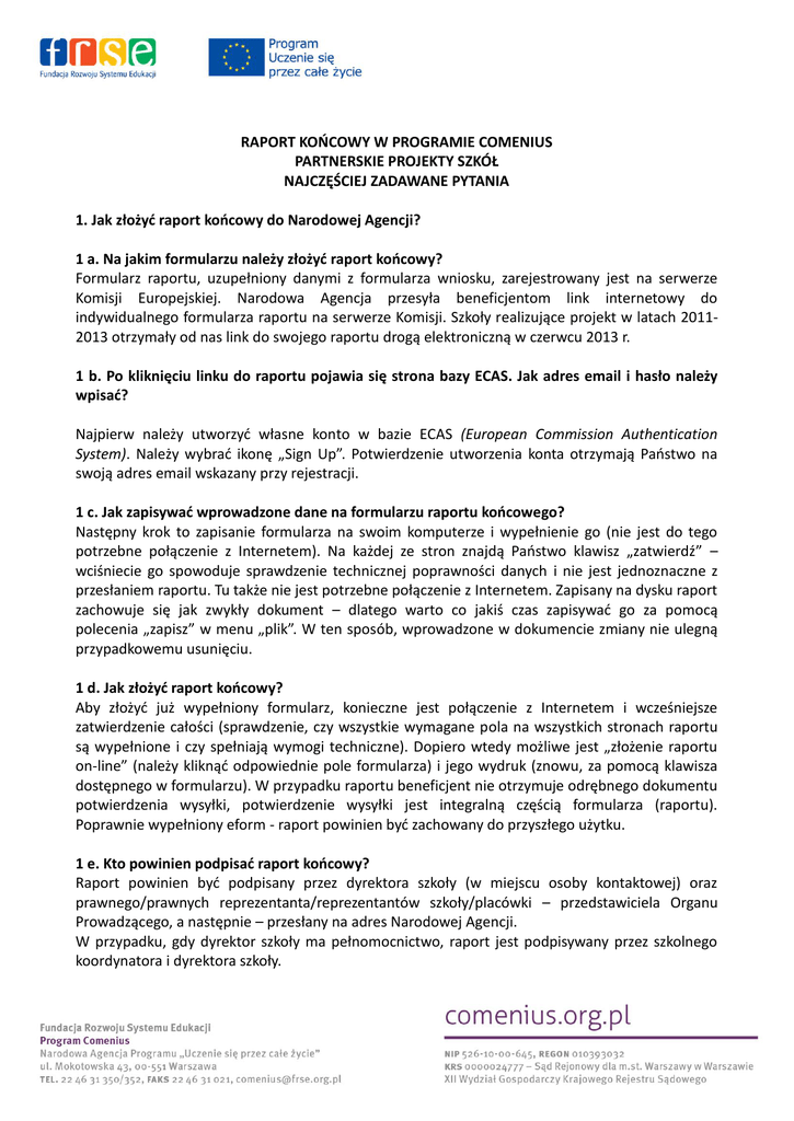 RAPORT KOŃCOWY W PROGRAMIE COMENIUS PARTNERSKIE PROJEKTY SZKÓŁ NAJCZĘŚCIEJ ZADAWANE PYTANIA 1. Jak złożyć raport końcowy do Narodowej Agencji? 1 a. Na jakim formularzu należy złożyć raport końcowy? Formularz raportu, uzupełniony danymi z formularza wniosku, zarejestrowany jest na serwerze Komisji Europejskiej. Narodowa Agencja przesyła beneficjentom link internetowy do indywidualnego formularza raportu na serwerze Komisji. Szkoły realizujące projekt w latach 20112013 otrzymały od nas link do swojego raportu drogą elektroniczną w czerwcu 2013 r. 1 b. Po kliknięciu linku do raportu pojawia się strona bazy ECAS. Jak adres email i hasło należy wpisać? Najpierw należy utworzyć własne konto w bazie ECAS (European Commission Authentication System). Należy wybrać ikonę „Sign Up”. Potwierdzenie utworzenia konta otrzymają Państwo na swoją adres email wskazany przy rejestracji. 1 c. Jak zapisywać wprowadzone dane na formularzu raportu końcowego? Następny krok to zapisanie formularza na swoim komputerze i wypełnienie go (nie jest do tego potrzebne połączenie z Internetem). Na każdej ze stron znajdą Państwo klawisz „zatwierdź” – wciśniecie go spowoduje sprawdzenie technicznej poprawności danych i nie jest jednoznaczne z przesłaniem raportu. Tu także nie jest potrzebne połączenie z Internetem. Zapisany na dysku raport zachowuje się jak zwykły dokument – dlatego warto co jakiś czas zapisywać go za pomocą polecenia „zapisz” w menu „plik”. W ten sposób, wprowadzone w dokumencie zmiany nie ulegną przypadkowemu usunięciu. 1 d. Jak złożyć raport końcowy? Aby złożyć już wypełniony formularz, konieczne jest połączenie z Internetem i wcześniejsze zatwierdzenie całości (sprawdzenie, czy wszystkie wymagane pola na wszystkich stronach raportu są wypełnione i czy spełniają wymogi techniczne). Dopiero wtedy możliwe jest „złożenie raportu on-line” (należy kliknąć odpowiednie pole formularza) i jego wydruk (znowu, za pomocą klawisza dostępnego w formularzu). W przypadku raportu beneficjent nie otrzymuje odrębnego dokumentu potwierdzenia wysyłki, potwierdzenie wysyłki jest integralną częścią formularza (raportu). Poprawnie wypełniony eform - raport powinien być zachowany do przyszłego użytku. 1 e. Kto powinien podpisać raport końcowy? Raport powinien być podpisany przez dyrektora szkoły (w miejscu osoby kontaktowej) oraz prawnego/prawnych reprezentanta/reprezentantów szkoły/placówki – przedstawiciela Organu Prowadzącego, a następnie – przesłany na adres Narodowej Agencji. W przypadku, gdy dyrektor szkoły ma pełnomocnictwo, raport jest podpisywany przez szkolnego koordynatora i dyrektora szkoły. W przypadku, gdy zauważą Państwo, że dane w miejscach wypełnionych automatycznie na podstawie wniosku o dofinansowanie (np. dane kontaktowe polskiej szkoły i nauczycielakoordynatora projektu) są niepoprawne lub nieaktualne, prosimy o dołączenie do wersji papierowej oświadczenia zawierającego właściwe dane. Oświadczenie musi być podpisane przez prawnego reprezentanta Państwa szkoły/placówki (zgodnie z podpisami złożonymi w raporcie końcowym). Prosimy także o wprowadzenie poprawnych danych na wydruku formularza oraz podpisanie się przy wprowadzonych zmianach przez osoby uprawnione do reprezentowania szkoły/placówki. Termin nadesłania raportu końcowego w formie papierowej to 30 września 2013 r. (obowiązuje data stempla pocztowego). Termin ten dotyczy także uzupełnienia danych w bazie EST http:/llp.org.pl/est/ w tym roku nie obowiązuje raport statystyczny. 2. Czy proces przygotowywania raportu końcowego mogę rozłożyć na etapy (tj. czy mogę zapisać zmiany i wrócić do edycji np. po kilku dniach, zanim ostatecznie zatwierdzę i wyślę cały raport)? Tak, zapisanie raportu na własnym (lub szkolnym) komputerze umożliwia rozłożenie jego edycji w czasie. Trzeba tylko pamiętać o zapisywaniu zmian w menu „plik”. Klawisz „zatwierdź” widoczny na każdej ze stron, pozwala na sprawdzenie, czy wszystkie wymagane pola na danej stronie zostały wypełnione. Raport zostanie wysłany (a więc niemożliwa będzie dalsza edycja) po naciśnięciu pola „złóż on-line” na ostatniej stronie wniosku. Przypominany, że obie wersje raportu - wersja złożona elektronicznie i wersja papierowa przesłana do Narodowej Agencji muszą być takie same i zawierać ten sam numer kontrolny. 3. Śledząc aktualności wywnioskowałam, że do raportu końcowego nie trzeba dołączyć kopii biletów, a co z potwierdzeniami pobytu? Na etapie składania raportu końcowego nie przesyłają Państwo żadnych dodatkowych dokumentów. O ich dosłanie poproszone zostaną te szkoły, które w wyniku losowania zostaną wybrane do szczegółowej kontroli. Po otrzymaniu raportów końcowych Narodowa Agencja poinformuje wylosowane szkoły/placówki o konieczności przesłania dodatkowych dokumentów i materiałów (artykuł I.4.2 umowy finansowej „Płatność końcowa”), do których należą: a. Dokumenty potwierdzające podróż: pociąg – bilety; samolot – karty pokładowe z każdego odcinka podróży, ewentualnie bilety (np. w przypadku zagubienia kart pokładowych i przesłania do NA oświadczenia w tej sprawie, bilety stanowią potwierdzenie odbycia podróży); samochód osobowy prywatny – oświadczenie o wykorzystaniu samochodu prywatnego; samochód osobowy służbowy – oświadczenie o wykorzystaniu samochodu służbowego; wynajęty autokar – faktura i lista uczestników, własny autokar – oświadczenie o wykorzystaniu własnego środka transportu i lista uczestników; autobus rejsowy – bilety; prom – bilety; inny środek transportu – do uzgodnienia z pracownikiem NA. Dokumenty podróży muszą obejmować trasę od miejscowości szkoły/placówki polskiej, do miejscowości spotkania partnerów, w obie strony podróży. b. Dokumenty potwierdzające udział w s