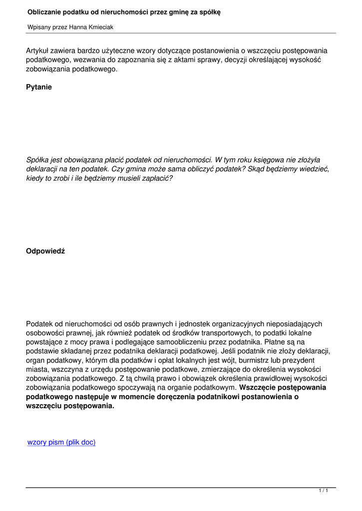 Obliczanie podatku od nieruchomości przez gminę za spółkę Wpisany przez Hanna Kmieciak Artykuł zawiera bardzo użyteczne wzory dotyczące postanowienia o wszczęciu postępowania podatkowego, wezwania do zapoznania się z aktami sprawy, decyzji określającej wysokość zobowiązania podatkowego. Pytanie Spółka jest obowiązana płacić podatek od nieruchomości. W tym roku księgowa nie złożyła deklaracji na ten podatek. Czy gmina może sama obliczyć podatek? Skąd będziemy wiedzieć, kiedy to zrobi i ile będziemy musieli zapłacić? Odpowiedź Podatek od nieruchomości od osób prawnych i jednostek organizacyjnych nieposiadających osobowości prawnej, jak również podatek od środków transportowych, to podatki lokalne powstające z mocy prawa i podlegające samoobliczeniu przez podatnika. Płatne są na podstawie składanej przez podatnika deklaracji podatkowej. Jeśli podatnik nie złoży deklaracji, organ podatkowy, którym dla podatków i opłat lokalnych jest wójt, burmistrz lub prezydent miasta, wszczyna z urzędu postępowanie podatkowe, zmierzające do określenia wysokości zobowiązania podatkowego. Z tą chwilą prawo i obowiązek określenia prawidłowej wysokości zobowiązania podatkowego spoczywają na organie podatkowym. Wszczęcie postępowania podatkowego następuje w momencie doręczenia podatnikowi postanowienia o wszczęciu postępowania. wzory pism (plik doc) 1/1