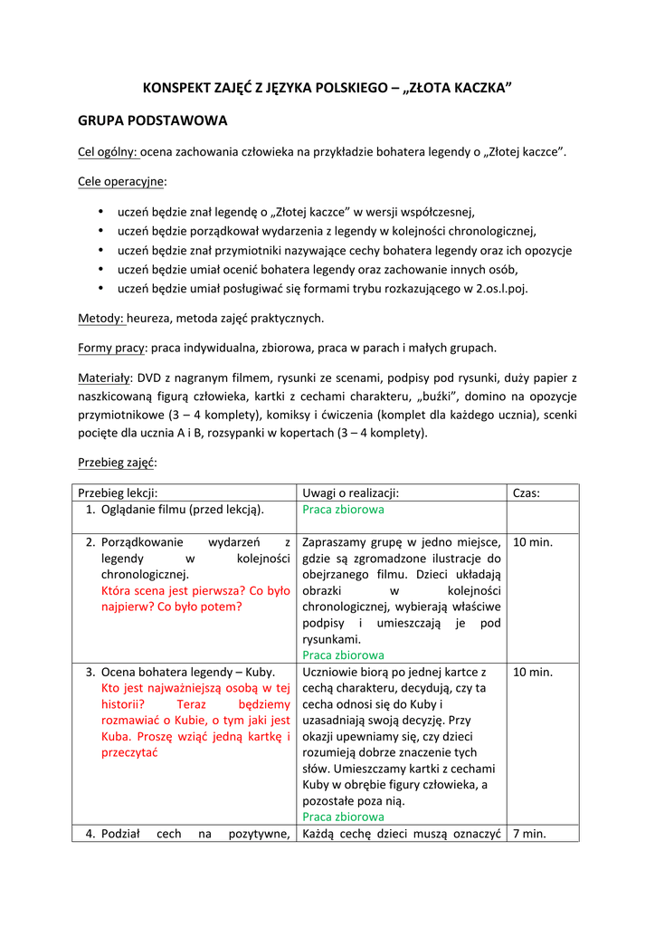 KONSPEKT ZAJĘĆ Z JĘZYKA POLSKIEGO – „ZŁOTA KACZKA