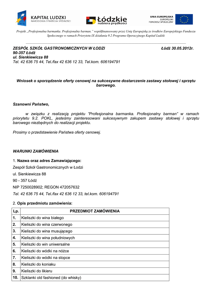 Projekt „Profesjonalna barmanka. Profesjonalny barman.” współfinansowany przez Unię Europejską ze środków Europejskiego Funduszu Społecznego w ramach Priorytetu IX działania 9.2 Programu Operacyjnego Kapitał Ludzki ____________________________________________________________________________________________________ ZESPÓŁ SZKÓŁ GASTRONOMICZNYCH W ŁODZI 90-357 Łódź ul. Sienkiewicza 88 Tel. 42 636 75 44, Tel./fax 42 636 12 33, Tel.kom. 606194791 Łódź 30.05.2012r. Wniosek o sporządzenie oferty cenowej na sukcesywne dostarczenie zastawy stołowej i sprzętu barowego. Szanowni Państwo, w związku z realizacją projektu ”Profesjonalna barmanka. Profesjonalny barman” w ramach priorytetu 9.2. POKL, jesteśmy zainteresowani sukcesywnym zakupem zastawy stołowej i sprzętu barowego niezbędnych do realizacji projektu. Prosimy o przedstawienie Państwa oferty cenowej. WARUNKI ZAMÓWIENIA 1. Nazwa oraz adres Zamawiającego: Zespół Szkół Gastronomicznych w Łodzi ul. Sienkiewicza 88 90 - 357 Łódź NIP 7250028902; REGON 472057632 Tel. 42 636 75 44, Tel./fax 42 636 12 33, tel.kom. 606194791 2. Opis przedmiotu zamówienia: PRZEDMIOT ZAMÓWIENIA Lp. 1. Kieliszki do wina białego 2. Kieliszki do wina czerwonego 3. Kieliszki do wina musującego 4. Kieliszki do wina południowych 5. Kieliszki do win uniwersalne 6. Kieliszki do wódki na nóżce 7. Kieliszki do wódki na stopce 8. Kieliszki do koniaku 9. Kieliszki do likieru 10. Szklanki old fashioned (do whisky) Projekt „Profesjonalna barmanka. Profesjonalny barman.” współfinansowany przez Unię Europejską ze środków Europejskiego Funduszu Społecznego w ramach Priorytetu IX działania 9.2 Programu Operacyjnego Kapitał Ludzki ____________________________________________________________________________________________________ 11. Kieliszki do grappy 12. Szklanki do piwa 13. Kielichy do piwa 14. Dekanterki 15. Kieliszki koktajlowe 16. Szklanki hurricane 17. Kieliszki martini 18. Kieliszki chiller (martini chiller) 19. Kieliszki do shotów 20. Kieliszki do pousse café 21. Pucharki do cobblerów 22. Kieliszki do sour 23. Szklanki long drink 24. Szklanki do hot drinków 25. Szklanki do irish coffee 26. Misy do bowli i ponczu 27. Dzbanki do soków 28. Stopery do wina musującego 29. Tace kelnerskie okrągłe 30. Trybuszon 31. Cooler do wina 32. Shaker klasyczny 0,5 l 33. Shaker klasyczny 0,7 l 34. Shaker bostoński 35. Pojemnik do lodu 5l 36. Szklanice barmańskie 37. Sitka barowe 38. Sitko zwykłe stożkowe 39. Miarki barowe 2/4 40. Miarki barowe 2,5/5 41. Miarki barowe 0,25 l 42. Zlewki (menzurki) 43. Łyżeczki miarowe 44. Łyżeczki barowe 45. Muddlery 46. Łyżeczki barowe ze szpikulcem Projekt „Profesjonalna barmanka. Profesjonalny barman.” współfinansowany przez Unię Europejską ze środków Europejskiego Funduszu Społecznego w ramach Priorytetu IX działania 9.2 Programu Operacyjnego Kapitał Ludzki ____________________________________________________________________________________________________ 47. Łyżeczki barowe spiralne 48. Łyżki do drążenia 49. Mątewka (koziołek) 50. Porcjoner do lodów 51. Szczypce do lodu 52. Deski do krojenia z tworzywa 53. Noże do owoców 54. Noże do twistów 55. Ręczne wyciskarki do cytrusów 56. Cęgi do wyciskania owoców 57. Tarki do gałki 58. Szufelki do lodów perforowane 59. Maty barowe 60. Crustownice 61. Pojemniki na owoce 62. Pomocniki do dodatków 63. Separatory do jaj 64. Rurki koktajlowe 65. Mieszadełka koktajlowe 66. Szpadki koktajlowe 67. Serwetki koktajlowe 68. Butelki treningowe flair 69. Kubki metalowe z wyważeniem 70. Nalewaki plastikowe 71. Nalewaki metalowe Zamawiający będzie dokonywał zamówień cyklicznie, w zależności od zapotrzebowania, na różne towary do 31.12.2013r. 3. Zamawiający dokona wyboru ofert na podstawie następujących kryteriów 1. cena brutto – 50% 2. jakość przedmiotu zamówienia – 50% Cena powinna być wyrażona w złotych polskich. Zamawiający dopuszcza możliwość składania ofert częściowych. 4. Zamawiający zapytuje o koszt dostarczenia produktów do siedziby zamawiającego, jeżeli wykonawcy taką usługę wykonują. Projekt „Profesjonalna barmanka. Profesjonalny barman.” współfinansowany przez Unię Europejską ze środków Europejskiego Funduszu Społecznego w ramach Priorytetu IX działania 9.2 Programu Operacyjnego Kapitał Ludzki ____________________________________________________________________________________________________ 5. Informacja o oświadczeniach i dokumentach, jakie mają dostarczyć Wykonawcy w celu potwierdzenia spełnienia warunków udziału w postępowaniu Zamawiający wymaga, by każda oferta zawierała minimum następujące dokumenty: 1. ofertę cenową z wyszczególnieniem cech jakościowych przedmiotu zamówienia podpisaną przez Wykonawcę (zał.1) 2. oświadczenie oferenta o braku powiązań osobowych i kapitałowych z zamawiającym (zał.2). 6. Informacja o sposobie porozumiewania się Zamawiającego z Wykonawcami oraz przekazywania oświadczeń i dokumentów Wszelkie zawiadomienia oraz informacje Zamawiający i Wykonawcy mogą przekazywać zgodnie z wyborem Zamawiającego e-mailem. 7. Miejsce i termin składania i otwarcia ofert 1. Ofertę należy złożyć w formie pisemnej na adres szkoły lub w formie elektronicznej na adres e-mail: [email protected] w terminie do dnia 13.06.2012r 2. Zamawiający dokona otwarcia ofert w dniu 14.06.2012r. 3. Jeżeli Wykonawca, którego oferta została wybrana uchyli się od zawarcia umowy, Zamawiający wybierze ofertę najkorzystniejszą spośród pozostałych ofert, bez przeprowadzania ich ponownej oceny. Sporządził: Klaudia Balcerowska Iwona Wolska Koordynator Projektu Asystent Koordynatora Projektu Projekt „Profesjonalna barmanka. Profesjonalny barman.” współfinansowany przez Unię Europejską ze środków Europejskiego Funduszu Społecznego w ramach Priorytetu IX działania 9.2 Programu Operacyjnego Kapitał Ludz