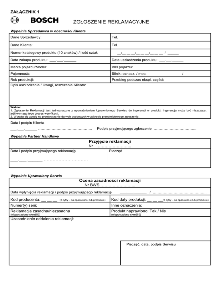 ZAŁĄCZNIK 1 ZGŁOSZENIE REKLAMACYJNE Wypełnia Sprzedawca w obecności Klienta Dane Sprzedawcy: Tel. Dane Klienta: Tel. Numer katalogowy produktu (10 znaków) / ilość sztuk __:__ __ __:__ __ __:__ __ __ / ______ Data zakupu produktu: ___.___.______ Data uszkodzenia produktu: ___.___.______ Marka pojazdu/Model: VIN pojazdu: Pojemność: Silnik: oznacz. / moc: Rok produkcji: Przebieg podczas ekspl. części: / Opis uszkodzenia / Uwagi, roszczenia Klienta: Ważne: 1. Zgłoszenie Reklamacji jest jednoznaczne z upoważnieniem Uprawnionego Serwisu do ingerencji w produkt. Ingerencja może być niszcząca, jeśli wymaga tego proces weryfikacji. 2. Wyraża się zgodę na przetwarzanie danych osobowych w zakresie przedmiotowego zgłoszenia. Data i podpis Klienta ___.___.______ …………………………………….. Podpis przyjmującego zgłoszenie …………………………….. Wypełnia Partner Handlowy Przyjęcie reklamacji Nr …………………….. Data i podpis przyjmującego reklamację Pieczęć ___.___.______ ………………………… Wypełnia Uprawniony Serwis Ocena zasadności reklamacji Nr BWS …………………….. Data wpłynięcia reklamacji / podpis przyjmującego reklamację Kod producenta: __ __ __ (3 cyfry – na opakowaniu lub produkcie) ___.___.______ / …………………………………….. Kod daty produkcji: __ __ __(3 cyfry – na opakowaniu lub produkcie) Numer(y) serii: Inne oznaczenia: Reklamacja zasadna/niezasadna Produkt naprawiono: Tak / Nie (niepotrzebne skreślić) (niepotrzebne skreślić) Uzasadnienie oddalenia reklamacji: Pieczęć, data, podpis Serwisu