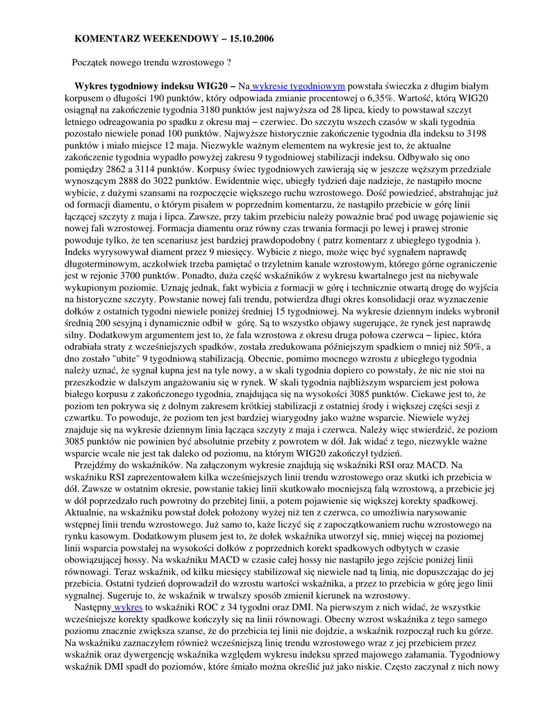 KOMENTARZ WEEKENDOWY − 15.10.2006 Początek nowego trendu wzrostowego ? Wykres tygodniowy indeksu WIG20 − Na wykresie tygodniowym powstała świeczka z długim białym korpusem o długości 190 punktów, który odpowiada zmianie procentowej o 6,35%. Wartość, którą WIG20 osiągnął na zakończenie tygodnia 3180 punktów jest najwyższa od 28 lipca, kiedy to powstawał szczyt letniego odreagowania po spadku z okresu maj − czerwiec. Do szczytu wszech czasów w skali tygodnia pozostało niewiele ponad 100 punktów. Najwyższe historycznie zakończenie tygodnia dla indeksu to 3198 punktów i miało miejsce 12 maja. Niezwykle ważnym elementem na wykresie jest to, że aktualne zakończenie tygodnia wypadło powyżej zakresu 9 tygodniowej stabilizacji indeksu. Odbywało się ono pomiędzy 2862 a 3114 punktów. Korpusy świec tygodniowych zawierają się w jeszcze węższym przedziale wynoszącym 2888 do 3022 punktów. Ewidentnie więc, ubiegły tydzień daje nadzieje, że nastąpiło mocne wybicie, z dużymi szansami na rozpoczęcie większego ruchu wzrostowego. Dość powiedzieć, abstrahując już od formacji diamentu, o którym pisałem w poprzednim komentarzu, że nastąpiło przebicie w górę linii łączącej szczyty z maja i lipca. Zawsze, przy takim przebiciu należy poważnie brać pod uwagę pojawienie się nowej fali wzrostowej. Formacja diamentu oraz równy czas trwania formacji po lewej i prawej stronie powoduje tylko, że ten scenariusz jest bardziej prawdopodobny ( patrz komentarz z ubiegłego tygodnia ). Indeks wyrysowywał diament przez 9 miesięcy. Wybicie z niego, może więc być sygnałem naprawdę długoterminowym, aczkolwiek trzeba pamiętać o trzyletnim kanale wzrostowym, którego górne ograniczenie jest w rejonie 3700 punktów. Ponadto, duża część wskaźników z wykresu kwartalnego jest na niebywale wykupionym poziomie. Uznaję jednak, fakt wybicia z formacji w górę i technicznie otwartą drogę do wyjścia na historyczne szczyty. Powstanie nowej fali trendu, potwierdza długi okres konsolidacji oraz wyznaczenie dołków z ostatnich tygodni niewiele poniżej średniej 15 tygodniowej. Na wykresie dziennym indeks wybronił średnią 200 sesyjną i dynamicznie odbił w górę. Są to wszystko objawy sugerujące, że rynek jest naprawdę silny. Dodatkowym argumentem jest to, że fala wzrostowa z okresu druga połowa czerwca − lipiec, która odrabiała straty z wcześniejszych spadków, została zredukowana późniejszym spadkiem o mniej niż 50%, a dno zostało "ubite" 9 tygodniową stabilizacją. Obecnie, pomimo mocnego wzrostu z ubiegłego tygodnia należy uznać, że sygnał kupna jest na tyle nowy, a w skali tygodnia dopiero co powstały, że nic nie stoi na przeszkodzie w dalszym angażowaniu się w rynek. W skali tygodnia najbliższym wsparciem jest połowa białego korpusu z zakończonego tygodnia, znajdująca się na wysokości 3085 punktów. Ciekawe jest to, że poziom ten pokrywa się z dolnym zakresem krótkiej stabilizacji z ostatniej środy i większej części sesji z czwartku. To powoduje, że poziom ten jest bardziej wiarygodny jako ważne wsparcie. Niewiele wyżej znajduje się na wykresie dziennym linia łącząca szczyty z maja i czerwca. Należy więc stwierdzić, że poziom 3085 punktów nie powinien być absolutnie przebity z powrotem w dół. Jak widać z tego, niezwykle ważne wsparcie wcale nie jest tak daleko od poziomu, na którym WIG20 zakończył tydzień. Przejdźmy do wskaźników. Na załączonym wykresie znajdują się wskaźniki RSI oraz MACD. Na wskaźniku RSI zaprezentowałem kilka wcześniejszych linii trendu wzrostowego oraz skutki ich przebicia w dół. Zawsze w ostatnim okresie, powstanie takiej linii skutkowało mocniejszą falą wzrostową, a przebicie jej w dół poprzedzało ruch powrotny do przebitej linii, a potem pojawienie się większej korekty spadkowej. Aktualnie, na wskaźniku powstał dołek położony wyżej niż ten z czerwca, co umożliwia narysowanie wstępnej linii trendu wzrostowego. Już samo to, każe liczyć się z zapoczątkowaniem ruchu wzrostowego na rynku kasowym. Dodatkowym plusem jest to, że dołek wskaźnika utworzył się, mniej więcej na poziomej linii wsparcia powstałej na wysokości dołków z poprzednich korekt spadkowych odbytych w czasie obowiązującej hossy. Na wskaźniku MACD w czasie całej hossy nie nastąpiło jego zejście poniżej linii równowagi. Teraz wskaźnik, od kilku miesięcy stabilizował się niewiele nad tą linią, nie dopuszczając do jej przebicia. Ostatni tydzień doprowadził do wzrostu wartości wskaźnika, a przez to przebicia w górę jego linii sygnalnej. Sugeruje to, że wskaźnik w trwalszy sposób zmienił kierunek na wzrostowy. Następny wykres to wskaźniki ROC z 34 tygodni oraz DMI. Na pierwszym z nich widać, że wszystkie wcześniejsze korekty spadkowe kończyły się na linii równowagi. Obecny wzrost wskaźnika z tego samego poziomu znacznie zwiększa szanse, że do przebicia tej linii nie dojdzie, a wskaźnik rozpoczął ruch ku górze. Na wskaźniku zaznaczyłem również wcześniejszą linię trendu wzrostowego wraz z jej przebiciem przez wskaźnik oraz dywergencję wskaźnika względem wykresu indeksu sprzed majowego załamania. Tygodniowy wskaźnik DMI spadł do poziomów, które śmiało można określić już jako niskie. Często zaczynał z nich nowy ruch wzrostowy. Przebicie się wzajemne składowych +DI oraz −DI pokazuje, że kierunek wzrostowy jest preferowany przez wskaźnik, a jego potwierdzenie nastąpi wraz z dalszym wzrostem linii ADX. Na kolejnym wykresie znajdują się wskaźniki ULT i TRIX. Na wskaźniku ULT najważniejszą rolę pełni trzyletnia linia wsparcia, od której wskaźnik przy każdej głębszej korekcie odbija się w górę zapoczątkowując kolejny swój ruch ku strefie wykupienia. Takie odbicie w górę powstało w ubiegłym tygodniu i wraz z przebiciem zaznaczonej na wykresie linii trendu spadkowego w