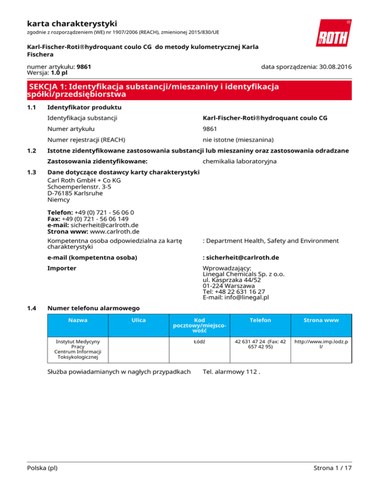 karta charakterystyki zgodnie z rozporządzeniem (WE) nr 1907/2006 (REACH), zmienionej 2015/830/UE Karl-Fischer-Roti®hydroquant coulo CG do metody kulometrycznej Karla Fischera numer artykułu: 9861 Wersja: 1.0 pl data sporządzenia: 30.08.2016 SEKCJA 1: Identyfikacja substancji/mieszaniny i identyfikacja spółki/przedsiębiorstwa 1.1 1.2 Identyfikator produktu Identyfikacja substancji Karl-Fischer-Roti®hydroquant coulo CG Numer artykułu 9861 Numer rejestracji (REACH) nie istotne (mieszanina) Istotne zidentyfikowane zastosowania substancji lub mieszaniny oraz zastosowania odradzane Zastosowania zidentyfikowane: 1.3 chemikalia laboratoryjna Dane dotyczące dostawcy karty charakterystyki Carl Roth GmbH + Co KG Schoemperlenstr. 3-5 D-76185 Karlsruhe Niemcy Telefon: +49 (0) 721 - 56 06 0 Fax: +49 (0) 721 - 56 06 149 e-mail: [email protected] Strona www: www.carlroth.de 1.4 Kompetentna osoba odpowiedzialna za kartę charakterystyki : Department Health, Safety and Environment e-mail (kompetentna osoba) : [email protected] Importer Wprowadzający: Linegal Chemicals Sp. z o.o. ul. Kasprzaka 44/52 01-224 Warszawa Tel: +48 22 631 16 27 E-mail: [email protected] Numer telefonu alarmowego Nazwa Ulica Kod pocztowy/miejscowość Telefon Strona www Łódź 42 631 47 24 (Fax: 42 657 42 95) http://www.imp.lodz.p l/ Instytut Medycyny Pracy Centrum Informacji Toksykologicznej Służba powiadamianych w nagłych przypadkach Polska (pl) Tel. alarmowy 112 . Strona 1 / 17 karta charakterystyki zgodnie z rozporządzeniem (WE) nr 1907/2006 (REACH), zmienionej 2015/830/UE Karl-Fischer-Roti®hydroquant coulo CG do metody kulometrycznej Karla Fischera numer artykułu: 9861 SEKCJA 2: Identyfikacja zagrożeń 2.1 Klasyfikacja substancji lub mieszaniny Klasyfikacja zgodnie z rozporządzeniem (WE) nr 1272/2008 (CLP) Klasyfikacja zg. z GHS Sekcja Klasa zagrożenia Klasa i kategoria zagrożenia Zwrot wskazujący rodzaj zagrożenia 2.6 substancja ciekła łatwopalna (Flam. Liq. 2) H225 3.1O toksyczność ostra (droga pokarmowa) (Acute Tox. 3) H301 3.1D toksyczność ostra (po naniesieniu na skórę) (Acute Tox. 3) H311 3.1I toksyczność ostra (przez drogi oddechowe) (Acute Tox. 3) H331 3.3 poważne uszkodzenie oczu/działanie drażniące na oczy (Eye Irrit. 2) H319 3.8 działanie toksyczne na narządy docelowe – narażenie jednorazowe (STOT SE 1) H370 Uwagi Pełny tekst zwrotów wskazujących rodzaj zagrożenia i zwrotów EUH: zob. SEKCJA 16. 2.2 Elementy oznakowania Oznakowania zgodnie z rozporządzeniem (WE) nr 1272/2008 (CLP) Hasło ostrzegawcze Niebezpieczeństwo Piktogramy Zwroty wskazujące rodzaj zagrożenia H225 H301+H311+H331 H319 H370 Wysoce łatwopalna ciecz i pary. Działa toksycznie po połknięciu, w kontakcie ze skórą lub w następstwie wdychania. Działa drażniąco na oczy. Powoduje uszkodzenie narządów. Zwroty wskazujące środki ostrożności Zwroty wskazujące środki ostrożności - zapobieganie Polska (pl) Strona 2 / 17 karta charakterystyki zgodnie z rozporządzeniem (WE) nr 1907/2006 (REACH), zmienionej 2015/830/UE Karl-Fischer-Roti®hydroquant coulo CG do metody kulometrycznej Karla Fischera numer artykułu: 9861 P210 Przechowywać z dala od źródeł ciepła, gorących powierzchni, źródeł iskrzenia, otwartego ognia. Nie palić. Stosować rękawice ochronne/ochronę oczu. P280 Zwroty wskazujące środki ostrożności - reagowanie P301+P310 P303+P361+P353 P308+P311 W PRZYPADKU POŁKNIĘCIA: natychmiast skontaktować się z OŚRODKIEM ZATRUĆ lub z lekarzem. W PRZYPADKU KONTATKU ZE SKÓRĄ (lub z włosami): Natychmiast zdjąć całą zanieczyszczoną odzież. Spłukać skórę pod strumieniem wody/prysznicem. W PRZYPADKU narażenia lub styczności: Skontaktować się z OŚRODKIEM ZATRUĆ/lekarzem. Niebezpieczne składniki do oznakowania: Metanol Oznakowanie opakowań, których zawartość nie przekracza 125 ml Hasło ostrzegawcze: Niebezpieczeństwo Symbol(-e) H301+H311+H331 Działa toksycznie po połknięciu, w kontakcie ze skórą lub w następstwie wdychania. H370 Powoduje uszkodzenie narządów. P280 P301+P310 zawiera: 2.3 Stosować rękawice ochronne/ochronę oczu. W PRZYPADKU POŁKNIĘCIA: natychmiast skontaktować się z OŚRODKIEM ZATRUĆ lub z lekarzem. Metanol Inne zagrożenia Nie ma dodatkowych informacji. SEKCJA 3: Skład/informacja o składnikach 3.2 Mieszaniny Opis mieszanki Skład/informacja o składnikach. Nazwa substancji Identyfikator wt% Klasyfikacja zg. z 1272/2008/WE Diethanolamine hydrochloride Nr. CAS 14426-21-2 ≥ 50 Eye Irrit. 2 / H319 25 50 Flam. Liq. 2 / H225 Acute Tox. 3 / H301 Acute Tox. 3 / H311 Acute Tox. 3 / H331 STOT SE 1 / H370 Piktogramy Specyficzne stężenia graniczne Nr. WE 238-396-4 Metanol Nr. CAS 67-56-1 Nr. WE 200-659-6 STOT SE 1; H370: C ≥ 10 % STOT SE 2; H371: 3 % ≤ C < 10 % Nr. indeksowy 603-001-00-X Nr. rej. REACH 01-211943330744-xxxx Polska (pl) Strona 3 / 17 karta charakterystyki zgodnie z rozporządzeniem (WE) nr 1907/2006 (REACH), zmienionej 2015/830/UE Karl-Fischer-Roti®hydroquant coulo CG do metody kulometrycznej Karla Fischera numer artykułu: 9861 Uwagi Pełny tekst zwrotów wskazujących rodzaj zagrożenia i zwrotów EUH: zob. SEKCJA 16. SEKCJA 4: Środki pierwszej pomocy 4.1 Opis środków pierwszej pomocy Uwagi ogólne Natychmiast zdjąć całą zanieczyszczoną odzież. Samoochrona udzielających pierwszej pomocy. Po narażeniu przez drogi oddechowe Natychmiast wezwać lekarza. W razie trudności w oddychaniu lub zatrzymania oddechu zastosować sztuczne oddychanie. Po kontakcie ze skórą Zanieczyszczoną skórę natychmiast przemyć dużą ilością wody. W przypadku kontaktu na dużym obszarze skóry możliwe ciężkie zatrucie. Wezwać lekarza w każdym przypadku. Po kontakcie z oczami Spłukiwać obficie czystą, świeżą wodą, przez co najmniej 10 minut, utrzymując otwarte powieki. W przypadku podrażnienia oczu zasięgnąć porady lekarza okulisty. Po narażeniu przez przewód pokarmowy Natychmiast wypłukać usta 