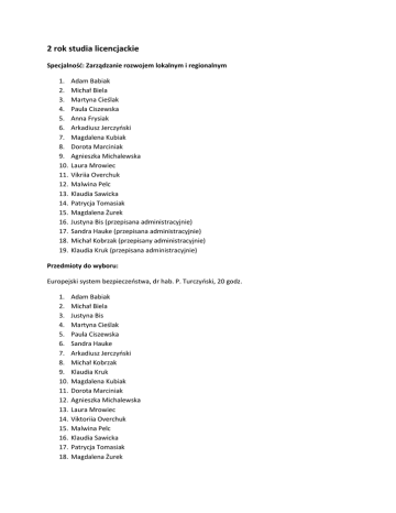 2 rok studia licencjackie Specjalność: Zarządzanie rozwojem lokalnym i regionalnym 1. 2. 3. 4. 5. 6. 7. 8. 9. 10. 11. 12. 13. 14. 15. 16. 17. 18. 19. Adam Babiak Michał Biela Martyna Cieślak Paula Ciszewska Anna Frysiak Arkadiusz Jerczyoski Magdalena Kubiak Dorota Marciniak Agnieszka Michalewska Laura Mrowiec Vikriia Overchuk Malwina Pelc Klaudia Sawicka Patrycja Tomasiak Magdalena Żurek Justyna Bis (przepisana administracyjnie) Sandra Hauke (przepisana administracyjnie) Michał Kobrzak (przepisany administracyjnie) Klaudia Kruk (przepisana administracyjnie) Przedmioty do wyboru: Europejski system bezpieczeostwa, dr hab. P. Turczyoski, 20 godz. 1. 2. 3. 4. 5. 6. 7. 8. 9. 10. 11. 12. 13. 14. 15. 16. 17. 18. Adam Babiak Michał Biela Justyna Bis Martyna Cieślak Paula Ciszewska Sandra Hauke Arkadiusz Jerczyoski Michał Kobrzak Klaudia Kruk Magdalena Kubiak Dorota Marciniak Agnieszka Michalewska Laura Mrowiec Viktoriia Overchuk Malwina Pelc Klaudia Sawicka Patrycja Tomasiak Magdalena Żurek Płed w polityce europejskiej, dr hab. A. Pacześniak, 20 godz. 1. 2. 3. 4. 5. 6. 7. 8. 9. 10. 11. 12. 13. 14. 15. 16. 17. 18. 19. Adam Babiak Michał Biela Justyna Bis Martyna Cieślak Paula Ciszewska Anna Frysiak Sandra Hauke Klaudia Kruk Magdalena Kubiak Dorota Marciniak Agnieszka Michalewska Viktoriia Overchuk Malwina Pelc Magdalena Żurek Arkadiusz Jerczyoski (przepisany administracyjnie) Laura Mrowiec (przepisana administracyjnie) Klaudia Sawicka (przepisana administracyjnie) Patrycja Tomasiak (przepisana administracyjnie) Michał Kobrzak (przepisany administracyjnie)