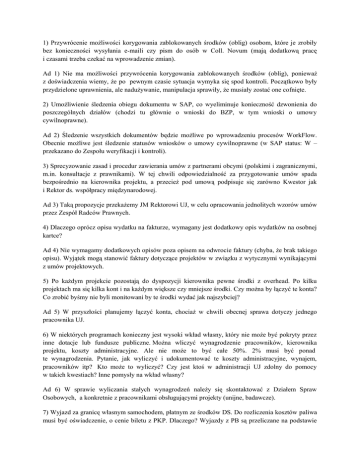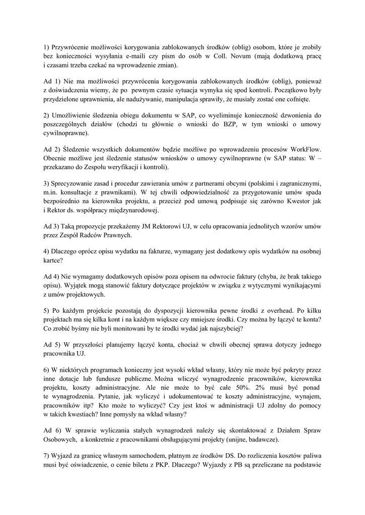 1) Przywrócenie możliwości korygowania zablokowanych środków (oblig) osobom, które je zrobiły bez konieczności wysyłania e-maili czy pism do osób w Coll. Novum (mają dodatkową pracę i czasami trzeba czekać na wprowadzenie zmian). Ad 1) Nie ma możliwości przywrócenia korygowania zablokowanych środków (oblig), ponieważ z doświadczenia wiemy, że po pewnym czasie sytuacja wymyka się spod kontroli. Początkowo były przydzielone uprawnienia, ale nadużywanie, manipulacja sprawiły, że musiały zostać one cofnięte. 2) Umożliwienie śledzenia obiegu dokumentu w SAP, co wyeliminuje konieczność dzwonienia do poszczególnych działów (chodzi tu głównie o wnioski do BZP, w tym wnioski o umowy cywilnoprawne). Ad 2) Śledzenie wszystkich dokumentów będzie możliwe po wprowadzeniu procesów WorkFlow. Obecnie możliwe jest śledzenie statusów wniosków o umowy cywilnoprawne (w SAP status: W – przekazano do Zespołu weryfikacji i kontroli). 3) Sprecyzowanie zasad i procedur zawierania umów z partnerami obcymi (polskimi i zagranicznymi, m.in. konsultacje z prawnikami). W tej chwili odpowiedzialność za przygotowanie umów spada bezpośrednio na kierownika projektu, a przecież pod umową podpisuje się zarówno Kwestor jak i Rektor ds. współpracy międzynarodowej. Ad 3) Taką propozycje przekażemy JM Rektorowi UJ, w celu opracowania jednolitych wzorów umów przez Zespół Radców Prawnych. 4) Dlaczego oprócz opisu wydatku na fakturze, wymagany jest dodatkowy opis wydatków na osobnej kartce? Ad 4) Nie wymagamy dodatkowych opisów poza opisem na odwrocie faktury (chyba, że brak takiego opisu). Wyjątek mogą stanowić faktury dotyczące projektów w związku z wytycznymi wynikającymi z umów projektowych. 5) Po każdym projekcie pozostają do dyspozycji kierownika pewne środki z overhead. Po kilku projektach ma się kilka kont i na każdym większe czy mniejsze środki. Czy można by łączyć te konta? Co zrobić byśmy nie byli monitowani by te środki wydać jak najszybciej? Ad 5) W przyszłości planujemy łączyć konta, chociaż w chwili obecnej sprawa dotyczy jednego pracownika UJ. 6) W niektórych programach konieczny jest wysoki wkład własny, który nie może być pokryty przez inne dotacje lub fundusze publiczne. Można wliczyć wynagrodzenie pracowników, kierownika projektu, koszty administracyjne. Ale nie może to być całe 50%. 2% musi być ponad te wynagrodzenia. Pytanie, jak wyliczyć i udokumentować te koszty administracyjne, wynajem, pracowników itp? Kto może to wyliczyć? Czy jest ktoś w administracji UJ zdolny do pomocy w takich kwestiach? Inne pomysły na wkład własny? Ad 6) W sprawie wyliczania stałych wynagrodzeń należy się skontaktować z Działem Spraw Osobowych, a konkretnie z pracownikami obsługującymi projekty (unijne, badawcze). 7) Wyjazd za granicę własnym samochodem, płatnym ze środków DS. Do rozliczenia kosztów paliwa musi być oświadczenie, o cenie biletu z PKP. Dlaczego? Wyjazdy z PB są przeliczane na podstawie stawki za kilometr. Dodatkowo takie oświadczenie z PKP nie może być przesłane przez nich mailem, musi być na nim pieczątka z PKP. Jest to tylko jedynie formalność, pracownicy PKP w kasach wypisują i podbijają odręcznie kwotę jaką się podaje. Informacja z PKP mówi, że ceny połączeń z kilkoma przesiadkami, a więc z różnymi miejscowościami, są bardzo różne i aby uzyskać konkretną cenę takiego połączenia należałoby wykupić bilet, którego wstecznie nie można oczywiście wystawić. Ad 7) Ta kwestia dotyczy wewnętrznych uregulowań (Komunikat nr 12 Prorektora UJ ds. badań i współpracy międzynarodowej z 31 marca 2010r.). 8) Dotyczy usług ksero. Szczegółowe wyjaśnianie dlaczego korzystamy z usług firmy zewnętrznej. Często jest to konieczność, szczególnie przy dużej ilości lub kolorowych odbitkach. Wynika to z braku odpowiedniego sprzętu lub konieczności jego oszczędności. Ad 8) Z ewidencji środków trwałych wynika, iż jednostki UJ posiadają wysokiej jakości sprzęt. Stąd wydaje się nieracjonalnym zlecanie usług ksero na zewnątrz. Sprawa wymaga generalnego przedyskutowania jeżeli jest inaczej. 9) Czy można zmienić tabelki rozliczeniowe krajowe przy projektach UE na bardziej szczegółowe na podobieństwo do dewiz. Ad 9) Pytanie jest niezrozumiałe. Czy na pewno chodzi o tabele rozliczeniowe przy projektach UE? Naszym zdaniem są one bardzo szczegółowe. Być może są jednostki, które mają ograniczony dostęp do systemu i nie widzą wszystkich elementów. (Należy zwrócić się o nadanie odpowiednich uprawnień). 10) Czy wydatki krajowe i dewizowe muszą iść równolegle w projekcie unijnym, czy wystarczy jak na końcu projektu proporcja będzie się zgadzała z zadeklarowanymi wstępnie? Ad 10) Co do zasady wydatki krajowe i dewizowe powinny być ponoszone równolegle. 11) Wyjazd za granicę gościa nie będącego pracownikiem UJ. Nie ma odpowiednich instrukcji, wzoru umowy cywilno-prawnej, na podstawie których można bez konieczności wykonania kilkunastu telefonów do osób w administracji złożyć dokumenty w DWM. Za każdym telefonem dostawaliśmy informacje, że jest to sprawa nietypowa i nie potrafiono nam pomóc. Dopiero „pocztą pantoflową” udało się wyciągnąć wnioski i zaadoptować pewną umowę, która odpowiadałaby naszym potrzebom. Ad 11) W Dziale Współpracy Międzynarodowej jest dostępny odpowiedni wniosek dotyczący wyjazdu za granicę osoby nie będącej pracownikiem UJ. 12) Odsyłanie faktur, które nie miały kompensaty (dotyczy faktur od Fundacji UJ) do kierownika projektu. To jest sprawa między zainteresowanymi: Fundacji dla UJ, a Uniwersytetem. Dysponent środków nie jest stroną w tej sprawie. Zlecona została płatność, faktura zgodnie z zaleceniami wpisana do systemu SAP, opieczętowana, podpisana, środki do zapłacenia są przewidziane w projekcie. Ad 12) Potwierdzamy. Sprawa ta nie dotyc