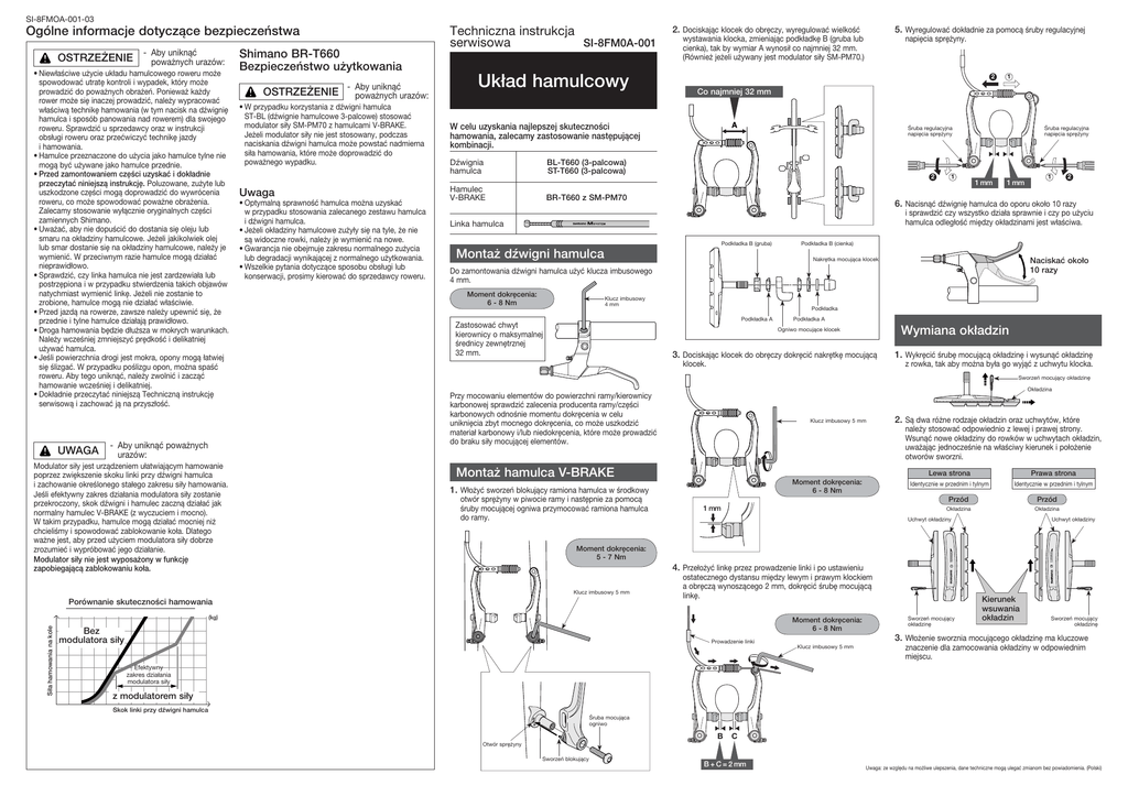 SI-8FMOA-001-03 • Niewłaściwe użycie układu hamulcowego roweru może spowodować utratę kontroli i wypadek, który może prowadzić do poważnych obrażeń. Ponieważ każdy rower może się inaczej prowadzić, należy wypracować właściwą technikę hamowania (w tym nacisk na dźwignię hamulca i sposób panowania nad rowerem) dla swojego roweru. Sprawdzić u sprzedawcy oraz w instrukcji obsługi roweru oraz przećwiczyć technikę jazdy i hamowania. • Hamulce przeznaczone do użycia jako hamulce tylne nie mogą być używane jako hamulce przednie. • Przed zamontowaniem części uzyskać i dokładnie przeczytać niniejszą instrukcję. Poluzowane, zużyte lub uszkodzone części mogą doprowadzić do wywrócenia roweru, co może spowodować poważne obrażenia. Zalecamy stosowanie wyłącznie oryginalnych części zamiennych Shimano. • Uważać, aby nie dopuścić do dostania się oleju lub smaru na okładziny hamulcowe. Jeżeli jakikolwiek olej lub smar dostanie się na okładziny hamulcowe, należy je wymienić. W przeciwnym razie hamulce mogą działać nieprawidłowo. • Sprawdzić, czy linka hamulca nie jest zardzewiała lub postrzępiona i w przypadku stwierdzenia takich objawów natychmiast wymienić linkę. Jeżeli nie zostanie to zrobione, hamulce mogą nie działać właściwie. • Przed jazdą na rowerze, zawsze należy upewnić się, że przednie i tylne hamulce działają prawidłowo. • Droga hamowania będzie dłuższa w mokrych warunkach. Należy wcześniej zmniejszyć prędkość i delikatniej używać hamulca. • Jeśli powierzchnia drogi jest mokra, opony mogą łatwiej się ślizgać. W przypadku poślizgu opon, można spaść roweru. Aby tego uniknąć, należy zwolnić i zacząć hamowanie wcześniej i delikatniej. • Dokładnie przeczytać niniejszą Techniczną instrukcję serwisową i zachować ją na przyszłość. UWAGA - Aby uniknąć poważnych urazów: OSTRZEŻENIE - Aby uniknąć poważnych urazów: • W przypadku korzystania z dźwigni hamulca ST-BL (dźwignie hamulcowe 3-palcowe) stosować modulator siły SM-PM70 z hamulcami V-BRAKE. Jeżeli modulator siły nie jest stosowany, podczas naciskania dźwigni hamulca może powstać nadmierna siła hamowania, które może doprowadzić do poważnego wypadku. Uwaga • Optymalną sprawność hamulca można uzyskać w przypadku stosowania zalecanego zestawu hamulca i dźwigni hamulca. • Jeżeli okładziny hamulcowe zużyły się na tyle, że nie są widoczne rowki, należy je wymienić na nowe. • Gwarancja nie obejmuje zakresu normalnego zużycia lub degradacji wynikającej z normalnego użytkowania. • Wszelkie pytania dotyczące sposobu obsługi lub konserwacji, prosimy kierować do sprzedawcy roweru. Układ hamulcowy napięcia sprężyny. 2 Dźwignia hamulca Śruba regulacyjna napięcia sprężyny BL-T660 (3-palcowa) ST-T660 (3-palcowa) Hamulec V-BRAKE 1 Co najmniej 32 mm W celu uzyskania najlepszej skuteczności hamowania, zalecamy zastosowanie następującej kombinacji. 2 BR-T660 z SM-PM70 1 Śruba regulacyjna napięcia sprężyny 1 mm mm 11mm mm 2 1 6. Nacisnąć dźwignię hamulca do oporu około 10 razy i sprawdzić czy wszystko działa sprawnie i czy po użyciu hamulca odległość między okładzinami jest właściwa. Linka hamulca Podkładka B (gruba) Montaż dźwigni hamulca Podkładka B (cienka) Nakrętka mocująca klocek Naciskać około 10 razy Do zamontowania dźwigni hamulca użyć klucza imbusowego 4 mm. Moment dokręcenia: 6 - 8 Nm Klucz imbusowy 4 mm Podkładka Podkładka A Zastosować chwyt kierownicy o maksymalnej średnicy zewnętrznej 32 mm. Podkładka A Wymiana okładzin Ogniwo mocujące klocek 3. Dociskając klocek do obręczy dokręcić nakrętkę mocującą klocek. 1. Wykręcić śrubę mocującą okładzinę i wysunąć okładzinę z rowka, tak aby można była go wyjąć z uchwytu klocka. Sworzeń mocujący okładzinę Okładzina Przy mocowaniu elementów do powierzchni ramy/kierownicy karbonowej sprawdzić zalecenia producenta ramy/części karbonowych odnośnie momentu dokręcenia w celu uniknięcia zbyt mocnego dokręcenia, co może uszkodzić materiał karbonowy i/lub niedokręcenia, które może prowadzić do braku siły mocującej elementów. Klucz imbusowy 5 mm Moment dokręcenia: 6 - 8 Nm 1. Włożyć sworzeń blokujący ramiona hamulca w środkowy otwór sprężyny w piwocie ramy i następnie za pomocą śruby mocującej ogniwa przymocować ramiona hamulca do ramy. 1 mm mm Prawa strona Identycznie w przednim i tylnym Przód Przód Okładzina Okładzina Uchwyt okładziny L 4. Przełożyć linkę przez prowadzenie linki i po ustawieniu ostatecznego dystansu między lewym i prawym klockiem a obręczą wynoszącego 2 mm, dokręcić śrubę mocującą linkę. (kg) (kg) Moment dokręcenia: 6 - 8 Nm Bez w/o power modulatora siły modulator Lewa strona Identycznie w przednim i tylnym Uchwyt okładziny Moment dokręcenia: 5 - 7 Nm Klucz imbusowy 5 mm 2. Są dwa różne rodzaje okładzin oraz uchwytów, które należy stosować odpowiednio z lewej i prawej strony. Wsunąć nowe okładziny do rowków w uchwytach okładzin, uważając jednocześnie na właściwy kierunek i położenie otworów sworzni. Montaż hamulca V-BRAKE Porównanie skuteczności hamowania Braking Performance Comparison Siła hamowania kole Braking force atna wheel 5. Wyregulować dokładnie za pomocą śruby regulacyjnej wystawania klocka, zmieniając podkładkę B (gruba lub cienka), tak by wymiar A wynosił co najmniej 32 mm. (Również jeżeli używany jest modulator siły SM-PM70.) FORWARD Modulator siły jest urządzeniem ułatwiającym hamowanie poprzez zwiększenie skoku linki przy dźwigni hamulca i zachowanie określonego stałego zakresu siły hamowania. Jeśli efektywny zakres działania modulatora siły zostanie przekroczony, skok dźwigni i hamulec zaczną działać jak normalny hamulec V-BRAKE (z wyczuciem i mocno). W takim przypadku, hamulce mogą działać mocniej niż chc