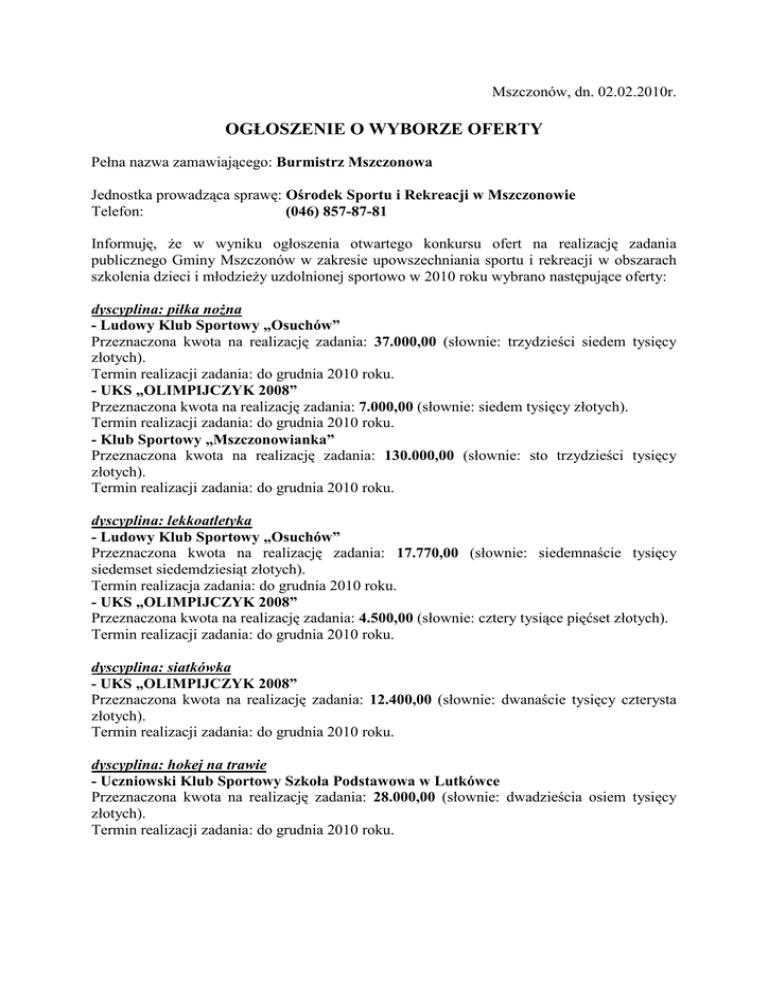 Mszczonów, dn. 02.02.2010r. OGŁOSZENIE O WYBORZE OFERTY Pełna nazwa zamawiającego: Burmistrz Mszczonowa Jednostka prowadząca sprawę: Ośrodek Sportu i Rekreacji w Mszczonowie Telefon: (046) 857-87-81 Informuję, Ŝe w wyniku ogłoszenia otwartego konkursu ofert na realizację zadania publicznego Gminy Mszczonów w zakresie upowszechniania sportu i rekreacji w obszarach szkolenia dzieci i młodzieŜy uzdolnionej sportowo w 2010 roku wybrano następujące oferty: dyscyplina: piłka noŜna - Ludowy Klub Sportowy „Osuchów” Przeznaczona kwota na realizację zadania: 37.000,00 (słownie: trzydzieści siedem tysięcy złotych). Termin realizacji zadania: do grudnia 2010 roku. - UKS „OLIMPIJCZYK 2008” Przeznaczona kwota na realizację zadania: 7.000,00 (słownie: siedem tysięcy złotych). Termin realizacji zadania: do grudnia 2010 roku. - Klub Sportowy „Mszczonowianka” Przeznaczona kwota na realizację zadania: 130.000,00 (słownie: sto trzydzieści tysięcy złotych). Termin realizacji zadania: do grudnia 2010 roku. dyscyplina: lekkoatletyka - Ludowy Klub Sportowy „Osuchów” Przeznaczona kwota na realizację zadania: 17.770,00 (słownie: siedemnaście tysięcy siedemset siedemdziesiąt złotych). Termin realizacja zadania: do grudnia 2010 roku. - UKS „OLIMPIJCZYK 2008” Przeznaczona kwota na realizację zadania: 4.500,00 (słownie: cztery tysiące pięćset złotych). Termin realizacji zadania: do grudnia 2010 roku. dyscyplina: siatkówka - UKS „OLIMPIJCZYK 2008” Przeznaczona kwota na realizację zadania: 12.400,00 (słownie: dwanaście tysięcy czterysta złotych). Termin realizacji zadania: do grudnia 2010 roku. dyscyplina: hokej na trawie - Uczniowski Klub Sportowy Szkoła Podstawowa w Lutkówce Przeznaczona kwota na realizację zadania: 28.000,00 (słownie: dwadzieścia osiem tysięcy złotych). Termin realizacji zadania: do grudnia 2010 roku.