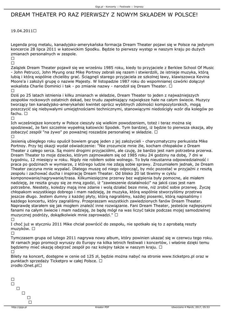 Gigs.pl - Koncerty :: Festiwale :: Imprezy DREAM THEATER PO RAZ PIERWSZY Z NOWYM SKŁADEM W POLSCE! 19.04.2011 Legenda prog metalu, kanadyjsko-amerykańska formacja Dream Theater pojawi się w Polsce na jedynym koncercie 28 lipca 2011 w katowickim Spodku. Będzie to pierwszy występ w naszym kraju po dużych zmianach personalnych w zespole. Zalążek Dream Theater pojawił się we wrześniu 1985 roku, kiedy to przyjaciele z Berklee School Of Music - John Petrucci, John Myung oraz Mike Portnoy zebrali się razem i stwierdzili, że istnieje muzyka, którą lubią i którą wspólnie chcieliby grać. Ściągnęli starego przyjaciela ze szkolnej ławy, klawiszowca Kevina Moore'a i założyli grupę o nazwie Majesty. W listopadzie 1987 roku do wspomnianej czwórki dołączył wokalista Charlie Dominici i tak - po zmianie nazwy - narodził się Dream Theater. Dziś po 25 latach istnienia i kilku zmianach w składzie, Dream Theater to jeden z najważniejszych zespołów rockowych ostatnich dekad, bez trudu zapełniający największe hale na całym świecie. Muzycy tworzący ten kanadyjsko-amerykański kwintet oprócz wybitnych zdolności kompozytorskich, mogą poszczycić się niebywałymi umiejętnościami technicznymi, stanowiącymi niedościgły wzór dla kolegów po fachu. Ich wcześniejsze koncerty w Polsce cieszyły się wielkim powodzeniem, toteż i teraz można się spodziewać, że fani szczelnie wypełnią katowicki Spodek. Tym bardziej, iż będzie to pierwsza okazja, aby zobaczyć zespół "na żywo" po poważnej roszadzie personalnej w składzie. Jesienią ubiegłego roku opuścił bowiem grupę jeden z jej założycieli - charyzmatyczny perkusista Mike Portnoy. Przy tej okazji wydał oświadczenie: "Nie zrozumcie mnie źle, kocham chłopaków z Dream Theater z całego serca. Są moimi drogimi przyjaciółmi, ale czuję, że bardzo jest nam potrzebna przerwa. Dream Theater to moje dziecko, którym zajmowałem się od 1985 roku 24 godziny na dobę, 7 dni w tygodniu, 12 miesięcy w roku. Nigdy nie robiłem sobie wolnego. To była nieustanna odpowiedzialność i praca po godzinach w wymiarze, z którego ludzie nie zdają sobie sprawy. Zrozumiałem jednak, że Dream Theater zaczyna mnie wypalać. Dlatego muszę od niego odpocząć, by móc pozostać w przyjaźni z resztą zespołu i zachować ducha i inspirację Dream Theater. Od blisko 20 lat tkwimy w cyklu komponowanie/nagrywanie/trasa. Kilkumiesięczne przerwy bez wątpienia były pomocne, ale miałem nadzieję, że reszta grupy się ze mną zgodzi, iż "zawieszenie działalności" na jakiś czas jest nam potrzebne. Niestety, koledzy mają inne zdanie i wolą działać beze mnie, niż zrobić sobie przerwę. Życzę chłopakom wszystkiego dobrego i mam nadzieję, że muzyka, którą wspólnie stworzyliśmy przetrwa jeszcze długo. Jestem dumny z każdej płyty, którą nagraliśmy, każdej piosenki, którą napisaliśmy i każdego koncertu, który zagraliśmy. Przepraszam wszystkich zawiedzionych fanów Dream Theater. Naprawdę starałem się jak mogłem znaleźć inne rozwiązanie. Fani Dream Theater, jesteście najlepszymi fanami na całym świecie i mam nadzieję, że będę mógł na was liczyć także podczas mojej samodzielnej muzycznej podróży, dokądkolwiek mnie zaprowadzi." I choć już w styczniu 2011 Mike chciał powrócić do zespołu, nie spotkało się to z aprobatą reszty muzyków. Tymczasem grupa od lutego 2011 nagrywa nowy album, który powinien ukazać się w czerwcu tego roku. W ramach jego promocji wyruszy do Europy na kilka letnich festiwali i koncertów, i właśnie dzięki temu będziemy mieć okazję obejrzeć zespół po raz kolejny także w naszym kraju. Bilety na koncert, dostępne w cenie od 125 zł, będzie można nabyć na stronie www.ticketpro.pl oraz w punktach sprzedaży Ticketpro w całej Polsce. zrodło:Onet.pl http://gigs.pl Kreator PDF Utworzono 4 March, 2017, 05:53 Gigs.pl - Koncerty :: Festiwale :: Imprezy http://gigs.pl Kreator PDF Utworzono 4 March, 2017, 05:53