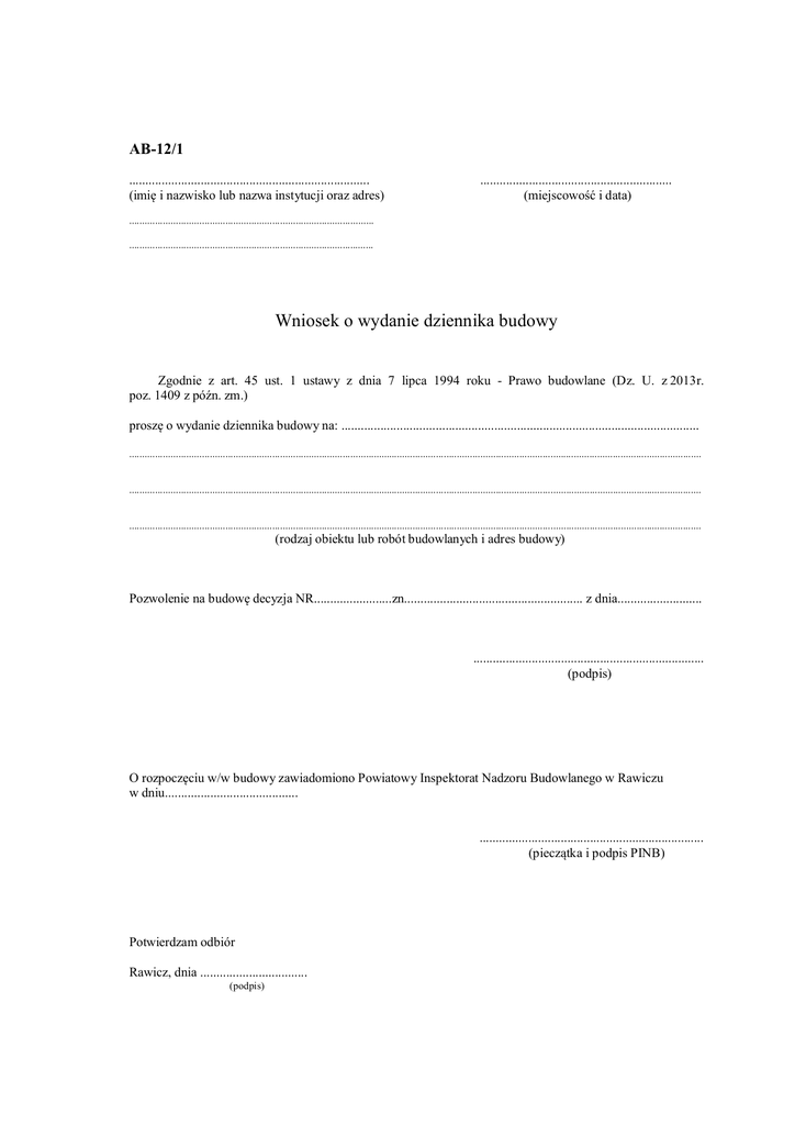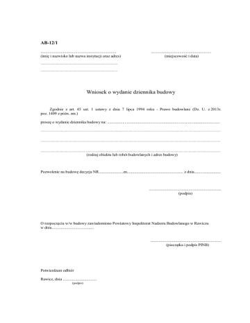 AB-12/1 .......................................................................... (imię i nazwisko lub nazwa instytucji oraz adres) ........................................................... (miejscowość i data) .............................................................................................. .............................................................................................. Wniosek o wydanie dziennika budowy Zgodnie z art. 45 ust. 1 ustawy z dnia 7 lipca 1994 roku - Prawo budowlane (Dz. U. z 2013r. poz. 1409 z późn. zm.) proszę o wydanie dziennika budowy na: .............................................................................................................. ............................................................................................................................................................................................................................ ............................................................................................................................................................................................................................ ............................................................................................................................................................................................................................ (rodzaj obiektu lub robót budowlanych i adres budowy) Pozwolenie na budowę decyzja NR........................zn....................................................... z dnia.......................... ....................................................................... (podpis) O rozpoczęciu w/w budowy zawiadomiono Powiatowy Inspektorat Nadzoru Budowlanego w Rawiczu w dniu......................................... ..................................................................... (pieczątka i podpis PINB) Potwierdzam odbiór Rawicz, dnia ................................. (podpis)
