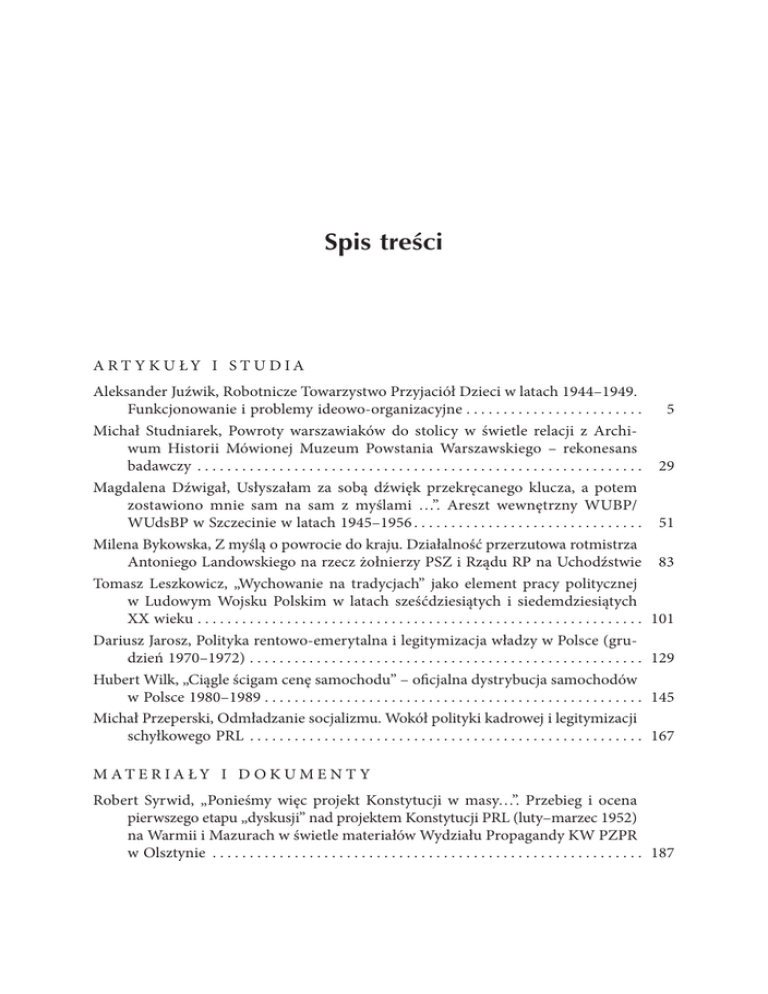 Spis treści A RT Y K U ŁY I S T U D IA Aleksander Juźwik, Robotnicze Towarzystwo Przyjaciół Dzieci w latach 1944–1949. Funkcjonowanie i problemy ideowo-organizacyjne . . . . . . . . . . . . . . . . . . . . . . . . Michał Studniarek, Powroty warszawiaków do stolicy w świetle relacji z Archiwum Historii Mówionej Muzeum Powstania Warszawskiego – rekonesans badawczy . . . . . . . . . . . . . . . . . . . . . . . . . . . . . . . . . . . . . . . . . . . . . . . . . . . . . . . . . . . . Magdalena Dźwigał, Usłyszałam za sobą dźwięk przekręcanego klucza, a potem zostawiono mnie sam na sam z myślami …”. Areszt wewnętrzny WUBP/ WUdsBP w Szczecinie w latach 1945–1956 . . . . . . . . . . . . . . . . . . . . . . . . . . . . . . . Milena Bykowska, Z myślą o powrocie do kraju. Działalność przerzutowa rotmistrza Antoniego Landowskiego na rzecz żołnierzy PSZ i Rządu RP na Uchodźstwie Tomasz Leszkowicz, „Wychowanie na tradycjach” jako element pracy politycznej w Ludowym Wojsku Polskim w latach sześćdziesiątych i siedemdziesiątych XX wieku . . . . . . . . . . . . . . . . . . . . . . . . . . . . . . . . . . . . . . . . . . . . . . . . . . . . . . . . . . . . Dariusz Jarosz, Polityka rentowo-emerytalna i legitymizacja władzy w Polsce (grudzień 1970–1972) . . . . . . . . . . . . . . . . . . . . . . . . . . . . . . . . . . . . . . . . . . . . . . . . . . . . . Hubert Wilk, „Ciągle ścigam cenę samochodu” – oficjalna dystrybucja samochodów w Polsce 1980–1989 . . . . . . . . . . . . . . . . . . . . . . . . . . . . . . . . . . . . . . . . . . . . . . . . . . . Michał Przeperski, Odmładzanie socjalizmu. Wokół polityki kadrowej i legitymizacji schyłkowego PRL . . . . . . . . . . . . . . . . . . . . . . . . . . . . . . . . . . . . . . . . . . . . . . . . . . . . . 5 29 51 83 101 129 145 167 M AT E R IA ŁY I D O K U M E N T Y Robert Syrwid, „Ponieśmy więc projekt Konstytucji w masy…”. Przebieg i ocena pierwszego etapu „dyskusji” nad projektem Konstytucji PRL (luty–marzec 1952) na Warmii i Mazurach w świetle materiałów Wydziału Propagandy KW PZPR w Olsztynie . . . . . . . . . . . . . . . . . . . . . . . . . . . . . . . . . . . . . . . . . . . . . . . . . . . . . . . . . . 187 4 Spis treści A RT Y K U ŁY R E C E N Z Y J N E Krzysztof Kosiński, Żmiąca po raz trzeci . . . . . . . . . . . . . . . . . . . . . . . . . . . . . . . . . . . . . Jakub Szumski, Na marginesie Człowieka z węgla Piotra Gajdzińskiego . . . . . . . . . . . Paweł Sasanka, O Człowieku z węgla krytycznie . . . . . . . . . . . . . . . . . . . . . . . . . . . . . . . Paweł Sowiński, Kulturowa penetracja – notes George’a Mindena . . . . . . . . . . . . . . . . 223 247 261 267 RECENZJE Gregory F. Domber, Empowering Revolution. America, Poland, and the End of the Cold War (Jan Skórzyński) . . . . . . . . . . . . . . . . . . . . . . . . . . . . . . . . . . . . . . . . . . . . . . Natalia Jarska, Kobiety z marmuru. Robotnice w Polsce w latach 1945–1960 (Kamila Kulczycka-Mulewska) . . . . . . . . . . . . . . . . . . . . . . . . . . . . . . . . . . . . . . . . . . . . . . . . . . Jarosław Pałka, Jerzy Poksiński, Michał Żymierski 1890–1989 (Tomasz Leszkowicz) Dominik Wierski, Sport w polskim kinie 1944–1989 (Tadeusz Wolsza) . . . . . . . . . . . . 279 284 287 292