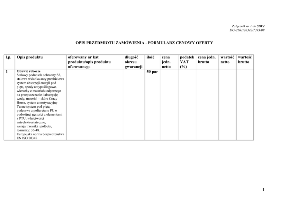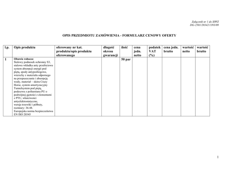 Załącznik nr 1 do SIWZ DG-2501/20342/1393/09 OPIS PRZEDMIOTU ZAMÓWIENIA - FORMULARZ CENOWY OFERTY l.p. Opis produktu 1 Obuwie robocze Stalowy podnosek ochronny S3, stalowa wkładka anty przebiciowa system absorpcji energii pod piętą, spody antypoślizgowe, wierzchy z materiału odpornego na przepuszczanie i absorpcję wody, materiał – skóra Crazy Horse, system amortyzacyjny Tunnelsystem pod piętą, podeszwa z poliuretanu PU o podwójnej gęstości z elementami z PTU, właściwości antyelektrostatyczne, wersja trzewiki i półbuty, rozmiary: 36-48. Europejska norma bezpieczeństwa EN ISO 20345 oferowany nr kat. produktu/opis produktu oferowanego długość okresu gwarancji ilość cena jedn. netto podatek cena jedn. VAT brutto (%) wartość wartość netto brutto 50 par 1 2 Ubranie robocze- typ 1 Kombinezon roboczy składający się z bluzy oraz spodni do pasa lub w drugim wariancie spodnie ogrodniczki. Tkanina - elanobawełna o składzie: 35 % bawełny 65 % poliesteru i poliester 600D , gramatura: 280 g/m2. Kolor: ciemny szary, wstawki pomarańczowe , kolor poliestru 600D czarny. Części kombinezonu tj. bluzę i spodnie opisano poniŜej. 45 kpl Bluza: przedłuŜana, na przedzie bluzy dwie duŜe dolne naszywane kieszenie, na dolnych kieszeniach dodatkowe kieszenie wykonane w całości z poliestru 600D zamykane na rzepa, na górze dwie kieszenie zamykane patką na rzepa, rękaw zakończony elastycznym ściągaczem z dzianiny, pod pachami rozpięcia z siatką wentylacyjną zamykane na zamek. Bluza musi być zamykana na zamek przykryty patką zapinaną na rzepy, oraz posiadać wzmocnienia z poliestru 600D na barkach i łokciach. Spodnie do pasa: z gumą ściągającą wszytą w tunel po obwodzie pasa, metalowy zamek błyskawiczny w rozporku, dwie duŜe kieszenie zewnętrzne naszywane, na zewnętrznych kieszeniach dodatkowe kieszenie 2 z poliestru 600D zamykane patką na rzep, z tyłu dwie duŜe kieszenie z patką zamykaną na rzep, na lewej nogawce kieszeń bojówkowa z patką zamykaną na rzep, na prawej nogawce kieszeń calówkowa w całości wykonana z poliestru 600D, wzmocnienia na kolanach z miejscem na nakolanniki. Spodnie ogrodniczki: z podwyŜszonym bawetem: na przedzie bawetu duŜa kieszeń zamykana na rzep; dwie kieszenie zewnętrzne naszywane, na zewnętrznych kieszeniach dodatkowe kieszenie z poliestru 600D zamykane patką na rzep, z tyłu dwie duŜe kieszenie z patką zamykaną na rzep, na lewej nogawce kieszeń bojówkowa z patką zamykaną na rzep, na prawej nogawce kieszeń calówkowa w całości wykonana z poliestru 600D, wzmocnienia na kolanach z miejscem na nakolanniki. Szelki o szerokości 5 cm z gumą regulującą, zapinane z przodu na klamry. Ubranie musi spełniać wymagania normy EN340. 3 3 Ubranie robocze- typ 2 Kombinezon roboczy składający się z bluzy oraz spodni ogrodniczek. Tkanina – 100% bawełna , gramatura: 260 g/m2. Kolor: czerwony, wstawki czarne. Części kombinezonu tj. bluzę i spodnie opisano poniŜej. 5 kpl. Bluza: zapinana na zamek błyskawiczny, kołnierz typu stójka zapinany na rzep, bluza musi posiadać moŜliwość odpięcia rękawów, Ŝeby po ich odpięciu otrzymać praktyczną kamizelkę, rękaw zakończony elastycznym ściągaczem z dzianiny, na dole bluzy dwie duŜe wewnętrzne kieszenie, na górze trzy kieszenie zamykane patką. Spodnie ogrodniczki: z podwyŜszonym bawetem: na przedzie bawetu duŜa kieszeń zamykana na zamek, dwie duŜe kieszenie zewnętrzne naszywane, na lewej nogawce kieszonka na telefon, a na prawej nogawce kieszeń calówkowa. Szelki z gumą regulującą, zapinane z przodu na klamry. Ubranie musi spełniać wymagania normy EN340. 4 4 5 6 Ocieplacz Kamizelka dwustronna z poliestru powlekana PVC, ocieplenie z polaru, zapięcie na zamek błyskawiczny, ściągnięcie u dołu, pięć kieszeni. RóŜne kolory, róŜne rozmiary. Kurtka ocieplona – typ 1: skład: materiał wierzchni- 65% poliester 35% bawełna, podszewka : 100% poliamid, wypełnienie : 100% poliester, z odpinanymi rękawami , kołnierz typu stójka wewnątrz obszywany sztruksem, podszewka z ociepliną poliamidową , zapięcie z przodu na zamek błyskawiczny i listwę z rzepami, dziesięć kieszeni, wstawki ze sztruksu na ramionach z tyłu i z przodu, patka ściągająca na plecach mocowana na napy. RóŜne rozmiary, kolor granatowy. Kurtka ocieplona – typ 2: skład: materiał wierzchni - 100% poliamid powlekany poliuretanem - wodoodporność 2500 mm, podszewka góra - polar, dółpoliester , kurtka zapinana na zamek błyskawiczny kryty plisą zapinaną na rzepy , wodoszczelne szwy , pod rękawami suwak wentylacyjny, wyposaŜona w 6 kieszeni w tym kieszeń na portfel i telefon, kaptur mocowany na rzepy, szerokość mankietu rękawa regulowana patką na rzep, dół kurtki regulowany elastycznym sznurkiem ze stoperami. RóŜne rozmiary, kolor czerwony. 50 szt. 17 szt. 3 szt. 5 7 8 Koszula flanelowa Wykonana z wysokiej jakości 100% bawełny. RóŜne kolory, róŜne rozmiary. Buty gumowe – buty gumowe robocze z PCV w kolorze czarnym (damskie, męskie) 50 szt. 30 par OGÓŁEM 6