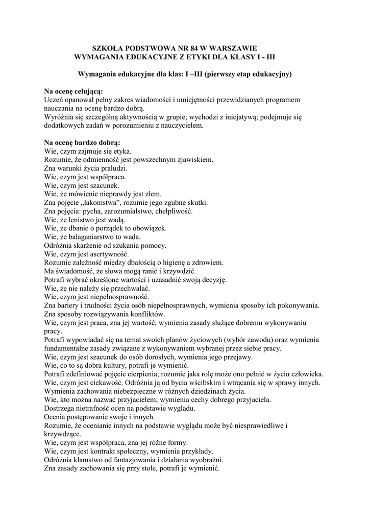 SZKOŁA PODSTWOWA NR 84 W WARSZAWIE WYMAGANIA EDUKACYJNE Z ETYKI DLA KLASY I - III Wymagania edukacyjne dla klas: I –III (pierwszy etap edukacyjny) Na ocenę celującą: Uczeń opanował pełny zakres wiadomości i umiejętności przewidzianych programem nauczania na ocenę bardzo dobrą. Wyróżnia się szczególną aktywnością w grupie; wychodzi z inicjatywą; podejmuje się dodatkowych zadań w porozumieniu z nauczycielem. Na ocenę bardzo dobrą: Wie, czym zajmuje się etyka. Rozumie, że odmienność jest powszechnym zjawiskiem. Zna warunki życia praludzi. Wie, czym jest współpraca. Wie, czym jest szacunek. Wie, że mówienie nieprawdy jest złem. Zna pojęcie „łakomstwa”, rozumie jego zgubne skutki. Zna pojęcia: pycha, zarozumialstwo, chełpliwość. Wie, że lenistwo jest wadą. Wie, że dbanie o porządek to obowiązek. Wie, że bałaganiarstwo to wada. Odróżnia skarżenie od szukania pomocy. Wie, czym jest asertywność. Rozumie zależność między dbałością o higienę a zdrowiem. Ma świadomość, że słowa mogą ranić i krzywdzić. Potrafi wybrać określone wartości i uzasadnić swoją decyzję. Wie, że nie należy się przechwalać. Wie, czym jest niepełnosprawność. Zna bariery i trudności życia osób niepełnosprawnych, wymienia sposoby ich pokonywania. Zna sposoby rozwiązywania konfliktów. Wie, czym jest praca, zna jej wartość; wymienia zasady służące dobremu wykonywaniu pracy. Potrafi wypowiadać się na temat swoich planów życiowych (wybór zawodu) oraz wymienia fundamentalne zasady związane z wykonywaniem wybranej przez siebie pracy. Wie, czym jest szacunek do osób dorosłych, wymienia jego przejawy. Wie, co to są dobra kultury, potrafi je wymienić. Potrafi zdefiniować pojęcie cierpienia; rozumie jaka rolę może ono pełnić w życiu człowieka. Wie, czym jest ciekawość. Odróżnia ją od bycia wścibskim i wtrącania się w sprawy innych. Wymienia zachowania niebezpieczne w różnych dziedzinach życia. Wie, kto można nazwać przyjacielem; wymienia cechy dobrego przyjaciela. Dostrzega nietrafność ocen na podstawie wyglądu. Ocenia postępowanie swoje i innych. Rozumie, że ocenianie innych na podstawie wyglądu może być niesprawiedliwe i krzywdzące. Wie, czym jest współpraca, zna jej różne formy. Wie, czym jest kontrakt społeczny, wymienia przykłady. Odróżnia kłamstwo od fantazjowania i działania wyobraźni. Zna zasady zachowania się przy stole, potrafi je wymienić. Wie, że aktywne spędzanie czasu jest sposobem na nudę. Wymienia swoje obowiązki domowe. Rozumie zagrożenia płynące z niefrasobliwego korzystania ze środków masowego przekazu, Internetu i gier komputerowych. Zna kryteria, którymi powinien się kierować przy wyborze programów TV, stron internetowych i gier komputerowych. Wymienia zasady dbania o zdrowie. Ma świadomość, że słowa mogą ranić i krzywdzić. Potrafi wybrać określone wartości i uzasadnić swoją decyzję. Wie, co to jest sprawiedliwość, potrafi podać przykłady. Wymienia swoje umiejętności i zalety; potrafi wymienić zalety innych osób. Wie, że nie należy się przechwalać. Wie, jak spędzać czas wolny, potrafi wymienić bezpieczne sposoby spędzania czasu wolnego. Układa plan dnia, uwzględniając czas na obowiązki i zainteresowania. Wie, czym jest piękno, wymienia przykłady. Wie, czym jest niepełnosprawność. Wie, jak należy zachować się wobec uczniów niepełnosprawnych. Zna bariery i trudności życia osób niepełnosprawnych, wymienia sposoby ich pokonywania. Wie, czym jest integracja. Wie, czym jest odpowiedzialność . Zna sposoby rozwiązywania konfliktów, potrafi je wymienić. Na ocenę dobrą: Wie, czym zajmuje się etyka. Wie, czym jest asertywność bez podawania definicji. Wie, czym jest szacunek. Wie, co to jest kłamstwo. Wie, co to jest obowiązek. Rozumie zależność między dbałością o higienę a zdrowiem. Ma świadomość, że słowa mogą ranić i krzywdzić. Wie, co to jest sprawiedliwość. Wie, że nie należy się przechwalać. Wie, czym jest niepełnosprawność. Zna bariery i trudności życia osób niepełnosprawnych. Wie, czym jest integracja. Wie, czym jest odpowiedzialność . Zna sposoby rozwiązywania konfliktów. Wie, czym jest praca, zna jej wartość. Potrafi wypowiadać się na temat swoich planów życiowych (wybór zawodu). Wie, czym jest szacunek do osób dorosłych. Wie, co to są dobra kultury. Definiuje pojęcie cierpienia. Wie, czym jest ciekawość. Odróżnia ja od bycia wścibskim i wtrącania się w sprawy innych. Wymienia zachowania niebezpieczne w różnych dziedzinach życia. Wie, kto można nazwać przyjacielem. Przestrzega reguł obowiązujących w społeczności dziecięcej oraz w świecie dorosłych. Wie, że nie można dążyć do zaspokojenia swoich pragnień kosztem innych. Nie niszczy otoczenia. Zdaje sobie sprawę z tego, jak ważna jest prawdomówność, stara się przeciwstawiać kłamstwu i obmowie. Wie, że nie wolno zabierać cudzej własności bez pozwolenia; pamięta o oddawaniu pożyczonych rzeczy i nie niszczy ich. Niesie pomoc potrzebującym, także w sytuacjach codziennych. Wie, że ludzie żyją w różnych warunkach i dlatego nie należy chwalić się bogactwem ani nie należy dokuczać dzieciom, które wychowują się w trudniejszych warunkach. Wie, czym zajmuje się etyka bez podawania definicji. Dostrzega nietrafność ocen na podstawie wyglądu. Ocenia postępowanie swoje i innych z pomocą nauczyciela. Rozumie, że ocenianie innych na podstawie wyglądu może być niesprawiedliwe i krzywdzące. Wie, czym jest współpraca. Wie, czym jest kontrakt społeczny. Z pomocą nauczyciela odróżnia kłamstwo od fantazjowania i działania wyobraźni. Zna zasady zachowania się przy stole; potrafi kilka z nich wymienić. Zna pojęcia: chełpliwość, zawiść. Wie, że aktywne spędzanie czasu jest sposobem na nudę. Rozumie zagrożenia płynące z niefrasobliwego korzystania 