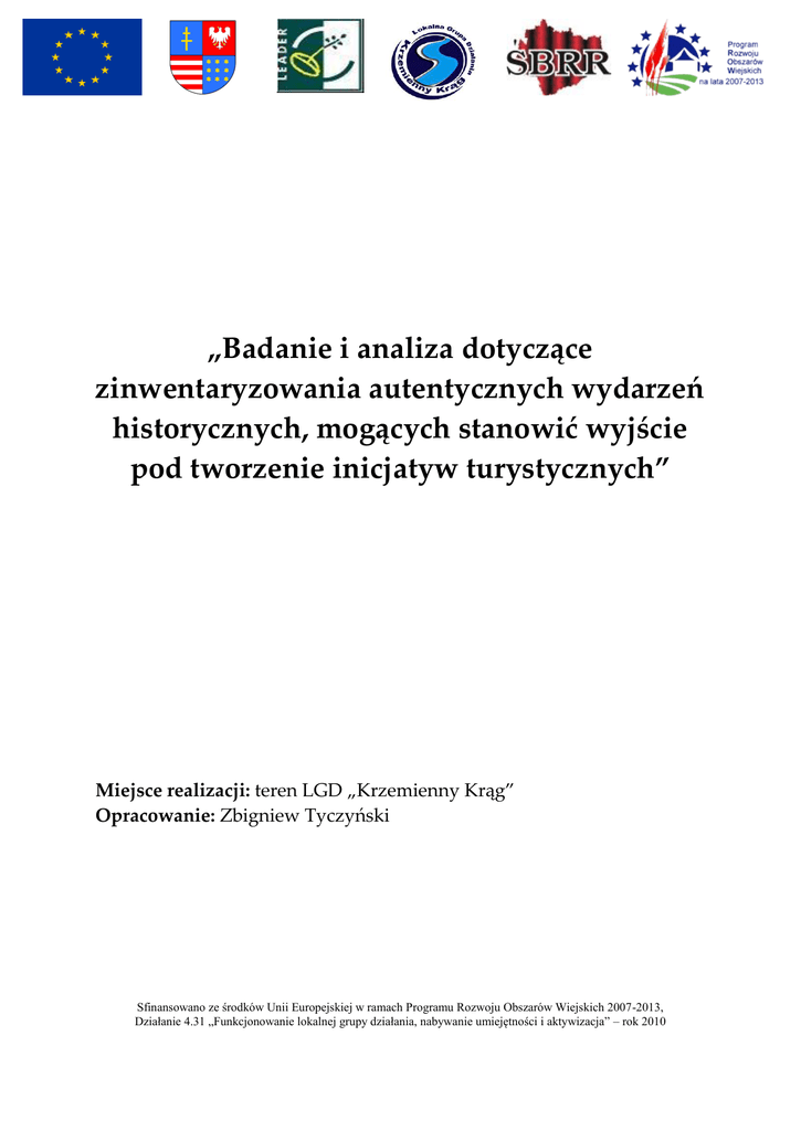 „Badanie i analiza dotyczące zinwentaryzowania autentycznych wydarzeń historycznych, mogących stanowić wyjście pod tworzenie inicjatyw turystycznych” Miejsce realizacji: teren LGD „Krzemienny Krąg” Opracowanie: Zbigniew Tyczyński Sfinansowano ze środków Unii Europejskiej w ramach Programu Rozwoju Obszarów Wiejskich 2007-2013, Działanie 4.31 „Funkcjonowanie lokalnej grupy działania, nabywanie umiejętności i aktywizacja” – rok 2010 1. Autentyczne wydarzenia historyczne, mogące stanowić wyjście pod tworzenie inicjatywy turystycznych. WYKAZ ALFABETYCZNY Baranów, gmina Chotcza 05.01., 01 – 20.06. oraz 02.12.1942 Wielokrotne pacyfikacje wsi prowadziła niemiecka żandarmeria. W trakcie zamordowano 13 członków organizacji podziemnych. Bodzechów 08.06.1787 Wizyta króla Stanisława Augusta Poniatowskiego W 1787 roku gościł tu król Stanisław August Poniatowski, który powracając z Julianem Ursynem Niemcewiczem z Ukrainy, 8 czerwca przeprawił się przez Wisłę, dotarł do Bodzechowa, gdzie zwiedził park oraz uczestniczył w balu, tańcząc z kanclerzyną i kanclerzanką. Dostojnego gościa przyjmowano w ustawionym na tę okoliczność ogromnym namiocie. Jeszcze długo po wizycie w parku pokazywano kamienny stół, który pamiętał to wydarzenie. 27.03.1821 W tutejszym dworze zmarł Jacek hr. Małachowski, właściciel rozległych dóbr, propagator przemysłu, założyciel fabryki porcelany w Ćmielowie, fundator m.in. kościoła w Ruszkowcu oraz dzwonnic w Ćmielowie i Wszechświętym. W tymże roku 1821 zmarł także jego syn Jan z Dukli hr. Malachowski. 16.12.1863 Bitwa bodzechowska Powstańcza kawaleria pod dowództwem gen. Hauke –Bosaka przyjęła bitwę z rosyjskimi dragonami. Mimo przewagi liczebnej, kawalerzyści gen. Bosaka zaczęli opuszczać pole walki. Sprawiła to zdrada Polaka, który przeprowadził oddział Asiejewa parowem do Bodzechowa i umożliwił Rosjanom niespodziewany atak na skrzydło powstańczej jazdy. Dodatkowy popłoch wywołały strzały artyleryjskie. Przy dowódcy została garstka, która cofając się w kierunku lasów i majątku Sowia Góra, odpierała ataki wroga. Przy pokonywaniu głębokiego rowu klacz pułkownika Chmieleńskiego runęła z jeźdźcem na ziemię. Chmieleński walczył nadal i dopiero kilkukrotnie ranny, słabnąc krzyknął do dragonów: Nie rąb! Ja jestem Chmieleński. Rosjanie przerwali pościg, zadawalając się pojmaniem Zygmunta Chmieleńskiego, którego wstępnie przesłuchano w bodzechowskim dworze, a następnie odwieziono przed oblicze gen. Czengierego i Uszakowa. Dla Rosjan była to sensacja, gdyż Chmieleński był oficerem w armii carskiej, który zdezerterował i dołączył do powstańców. Za dezercję został zdegradowany i skazany na 10 lat katorgi, za udział 1 w powstaniu na karę śmierci przez rozstrzelanie, którą wykonano 23 grudnia. Skazaniec był tak osłabiony ranami poniesionymi w bitwie bodzechowskiej, że zanim stanął przed plutonem egzekucyjnym przywiązano do słupka. Miejsce pochówku dzielnego oficera nie jest znane. Pozostałe ofiary bitwy bodzechowskiej spoczywają na denkowskim cmentarzu w Ostrowcu Świętokrzyskim. 22.02.1944 Odział AL opanował teren cementowni, rozbroił ochronę, zlikwidował niemiecką załogę i zdobył broń oraz amunicję. Do partyzantów przyłączyła się grupa 15 pracujących w cementowni Rosjan. Boria, gmina Ćmielów 04.05.1863 Oddział Dionizego Czachowskiego natrafił na zajmujących wieś Rosjach mjr Klewcowa. Po długotrwałej wymianie ognia, tuż przed zachodem słońca Czachowski dał sygnał do ataku na pozycje wroga od północy. Wraz z ciemnościami przerwano jednak szturm i potyczkę należy uznać za nierozstrzygniętą. Jeszcze tej samej nocy oddział Czachowskiego podjął marsz w kierunku Ostrowca, by rano natknąć się na wycofujący się w tym samym kierunku oddział Klewcowa w rejonie osady Jeziorko, gdzie doszło do kolejnej bitwy. Bitwę pod Borią poprzedziła utarczka koło folwarku Limierze (Lemiesze). Bukowiany, gmina Sadowie 31.07.1944 Bój „Zawiszy” W lesie w pobliżu Bukowian doszło do potyczki między oddziałem AK Kazimierza Olchowika „Zawiszy”, a wycofującym się na zachód oddziałem Wehrmachtu. Partyzanci zaatakowali niemiecką kolumnę samochodów, która zboczyła z drogi Opatów-Kielce i kierowała się na Bukowiany. Partyzantom udało się zniszczyć dwa samochody pancerne. W walce zginęło czterech żołnierzy niemieckich. Partyzanci zdobyli pistolet maszynowy, karabin oraz samochód-amfibię. Chocimów, gmina Kunów 09.06.1787 Wizyta króla Stanisława Augusta Poniatowskiego Ponieważ kasztelan Józef Popiel cieszył się opinią człowieka o nieposzlakowanej uczciwości, król Stanisław August Poniatowski wyróżniał go przy różnych okazjach, a wracając z Ukrainy postanowił odwiedzić osobiście w Chocimowie, do którego przybył 9 czerwca. Niestety, trafił na smutną chwilę, gdyż właśnie wyprowadzano zwłoki żony kasztelana, która ratując porażonych piorunem, jaki uderzył w kościół waśniowski, sama z nadmiernego wysiłku umarła. 2 Wyraziwszy swoje współczucie, król odjechał, a towarzyszący mu poeta Stanisław Trembecki napisał taki oto wiersz: Niechaj się róża pod nogi ściele Niech ziemie narcyz okrywa Okażcie radość obywatele Ojciec Ojczyzny przybywa. Pragniecie zyskać jego szacunek On wasze chęci uprzedza Innych tu w drodze stawił trafunek A was umyślnie odwiedza. 28.09.1920 Marian Ośniałowski W chocimowskim dworze przyszedł na świat Marian Ośniałowski, przez rodzinę zwany Rysiem. Spokrewniony z Witoldem Gombrowiczem postromantyczny poeta. Zmarł w Paryżu w roku 1966. Chotcza 10.09.1831 Bitwa na grobli Krwawy bój stoczył tu korpus gen. Samuela Różyckiego z wojskami rosyjskimi gen. T.Rűdigera. Przechodzącą przez wąską groblę między stawem a moczarami kolumnę polską zaatakowali Rosjanie. Gen. Różycki odpowiedział ogniem