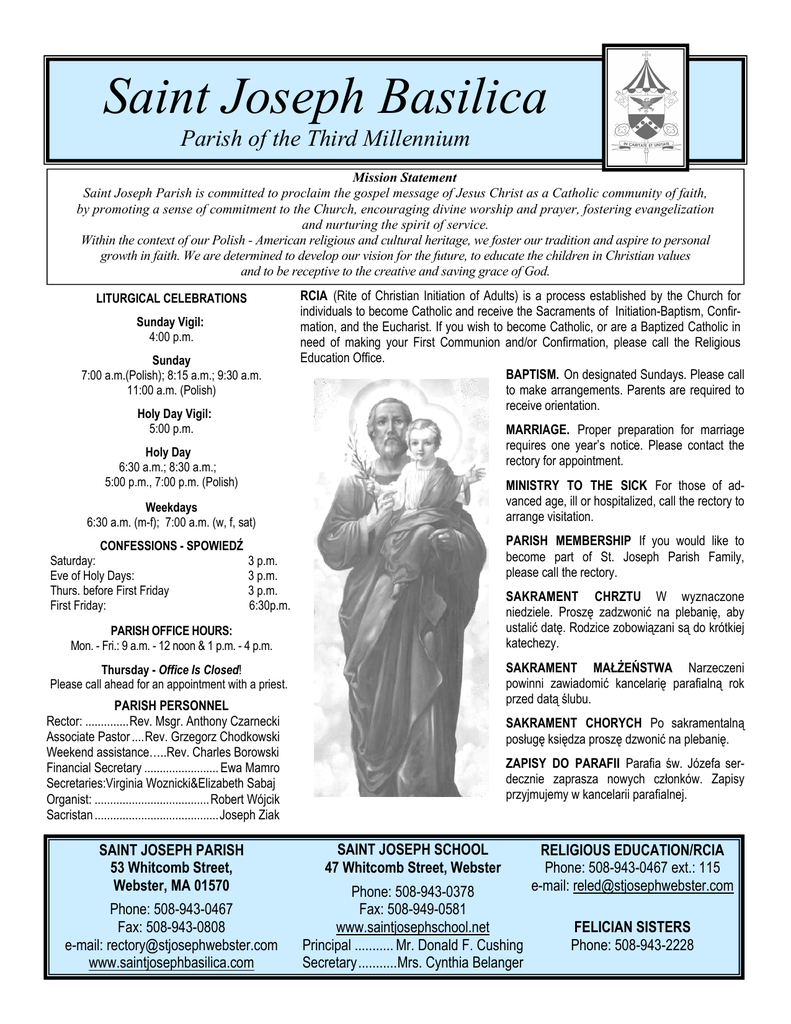 Saint Joseph Basilica Parish of the Third Millennium Mission Statement Saint Joseph Parish is committed to proclaim the gospel message of Jesus Christ as a Catholic community of faith, by promoting a sense of commitment to the Church, encouraging divine worship and prayer, fostering evangelization and nurturing the spirit of service. Within the context of our Polish - American religious and cultural heritage, we foster our tradition and aspire to personal growth in faith. We are determined to develop our vision for the future, to educate the children in Christian values and to be receptive to the creative and saving grace of God. LITURGICAL CELEBRATIONS Sunday Vigil: 4:00 p.m. Sunday 7:00 a.m.(Polish); 8:15 a.m.; 9:30 a.m. 11:00 a.m. (Polish) Holy Day Vigil: 5:00 p.m. RCIA (Rite of Christian Initiation of Adults) is a process established by the Church for individuals to become Catholic and receive the Sacraments of Initiation-Baptism, Confirmation, and the Eucharist. If you wish to become Catholic, or are a Baptized Catholic in need of making your First Communion and/or Confirmation, please call the Religious Education Office. BAPTISM. On designated Sundays. Please call to make arrangements. Parents are required to receive orientation. MARRIAGE. Proper preparation for marriage requires one year’s notice. Please contact the rectory for appointment. Holy Day 6:30 a.m.; 8:30 a.m.; 5:00 p.m., 7:00 p.m. (Polish) MINISTRY TO THE SICK For those of advanced age, ill or hospitalized, call the rectory to arrange visitation. Weekdays 6:30 a.m. (m-f); 7:00 a.m. (w, f, sat) PARISH MEMBERSHIP If you would like to become part of St. Joseph Parish Family, please call the rectory. CONFESSIONS - SPOWIEDŹ Saturday: Eve of Holy Days: Thurs. before First Friday First Friday: 3 p.m. 3 p.m. 3 p.m. 6:30p.m. SAKRAMENT CHRZTU W wyznaczone niedziele. Proszę zadzwonić na plebanię, aby ustalić datę. Rodzice zobowiązani są do krótkiej katechezy. PARISH OFFICE HOURS: Mon. - Fri.: 9 a.m. - 12 noon & 1 p.m. - 4 p.m. SAKRAMENT MAŁŻEŃSTWA Narzeczeni powinni zawiadomić kancelarię parafialną rok przed datą ślubu. Thursday - Office Is Closed! Please call ahead for an appointment with a priest. PARISH PERSONNEL Rector: .............. Rev. Msgr. Anthony Czarnecki Associate Pastor .... Rev. Grzegorz Chodkowski Weekend assistance…..Rev. Charles Borowski Financial Secretary ........................ Ewa Mamro Secretaries:Virginia Woznicki&Elizabeth Sabaj Organist: ..................................... Robert Wójcik Sacristan ........................................ Joseph Ziak SAINT JOSEPH PARISH 53 Whitcomb Street, Webster, MA 01570 Phone: 508-943-0467 Fax: 508-943-0808 e-mail: [email protected] www.saintjosephbasilica.com SAKRAMENT CHORYCH Po sakramentalną posługę księdza proszę dzwonić na plebanię. ZAPISY DO PARAFII Parafia św. Józefa serdecznie zaprasza nowych członków. Zapisy przyjmujemy w kancelarii parafialnej. SAINT JOSEPH SCHOOL 47 Whitcomb Street, Webster Phone: 508-943-0378 Fax: 508-949-0581 www.saintjosephschool.net Principal ........... Mr. Donald F. Cushing Secretary ...........Mrs. Cynthia Belanger RELIGIOUS EDUCATION/RCIA Phone: 508-943-0467 ext.: 115 e-mail: [email protected] FELICIAN SISTERS Phone: 508-943-2228 Page 2 July 27, 2014 Masses for the week—Msze Św. w Tygodniu Sunday Vigil 4:00pm r.s. Louis Kondek ( 16th anniv.) - int. Family Sunday - July 27 7:00 Za Parafian 8:15 St. Anne Society Annual Communion Mass 9:30 r.s. Edward & Julia Baldyga - int. Jill & Peter Manak 11:00 ś.p. Helena i Józef Suchanek - int. wnuczka Ewa Monday - July 28 6:30 r.s. Bridget (Maciejewski) Lingis - int. Mary Lingis 2:00pm Webster Manor Tuesday– July 29 6:30 r.s. Stanley & Joseph Czyzewski & Helen Trombley - int. Brothers and sisters 7:00 Za wypominki Wednesday - July 30 6:30 Za przyczyną św. Jozefa o odpuszczenie grzechow, i życie wieczne dla Antoniego Surowik, Maryli Polewacz, Władysława Bacławskiej, Małgorzaty, Aleksandra oraz Józefa Surowik, Józefa Nalewajk, Czesława Gut i Szymona Mrozek - int. Jolanta Surowik 7:00pm Za przyczyną św Jozefa o cud uwolnienia z nałogu alkoholizmu syna Romana i o powrot do Boga oraz rodziny - int. matka Teresa Thursday - July 31 6:30 r.s. Mary A. Kubicki - int. Edward Sitkowski, Roland Malboeuf and John Hickey Friday - August 1 - First Friday 6:30 r.s. Cecilia Majka, Mary Dudek, Stasia Lamby, Albert, Stanley & Bernard Makara - int. Sisters 7:00 Sacred Heart Society - Living Members 7:00pm r.s. Filomena Kubicki - int. Edward Sitkowski, Roland Malboeuf and John Hickey Saturday –August 2 7:00 r.s. Walter and Helen Baron - int. Daughter Jane Sunday Vigil 12:30pm Wedding - Ewelina Mroczka and Vasileois Dendroulakis 4:00 r.s. James & Adele Canty - int. Jim & Jo-Ann Canty 5:00pm Wedding - Joanna Olejarz & Jaroslaw Bozek Sunday - August 3 7:00 sp. Jan Wojcik - int. syn Wladyslaw z rodzina 8:15 sp. Jan Nagiel - int. J. W. Ciecko 9:30 r.s. Claire Carlson - int. Family 11:00 sp. Anna Wardega (2ga r.) - int. corka Ewa z rodzina 1:00pm Baptism - Jon Thomas Belanger, Jr. MARRIAGE BANNS III - Johnna Kelly & Garett Walker I - Slawomira Sudyka & Pawel Krajewski SHARING OUR BLESSINGS-July 20, 2014 I-25 Club Winner 5th money); week Diocesan Weekly $3826.50 (including $257 infor loose Obligations $77; Fuel $140 Weekly Budget $7000 27 lipca 2014r. Stewardship Note: “The law of Your mouth is to me more precious than thousands of gold and silver pieces. “says the psalmist today. Does the amount of my offering suggest that I could honestly say the same? SEVENTEENTH SUNDAY IN ORDINARY TIME July 27, 2014 All things work for good for those who love God. -Romans 8:28a JACKPOT In our lottery-and sweepstakes-obsessed culture, it is common to ask ourselves or others what they would do if they won. In today’s first reading, Solomon certainly hits the jackpot. What prize could be greater than having God Almighty agree to give you whatever you ask for? Out of all the thin
