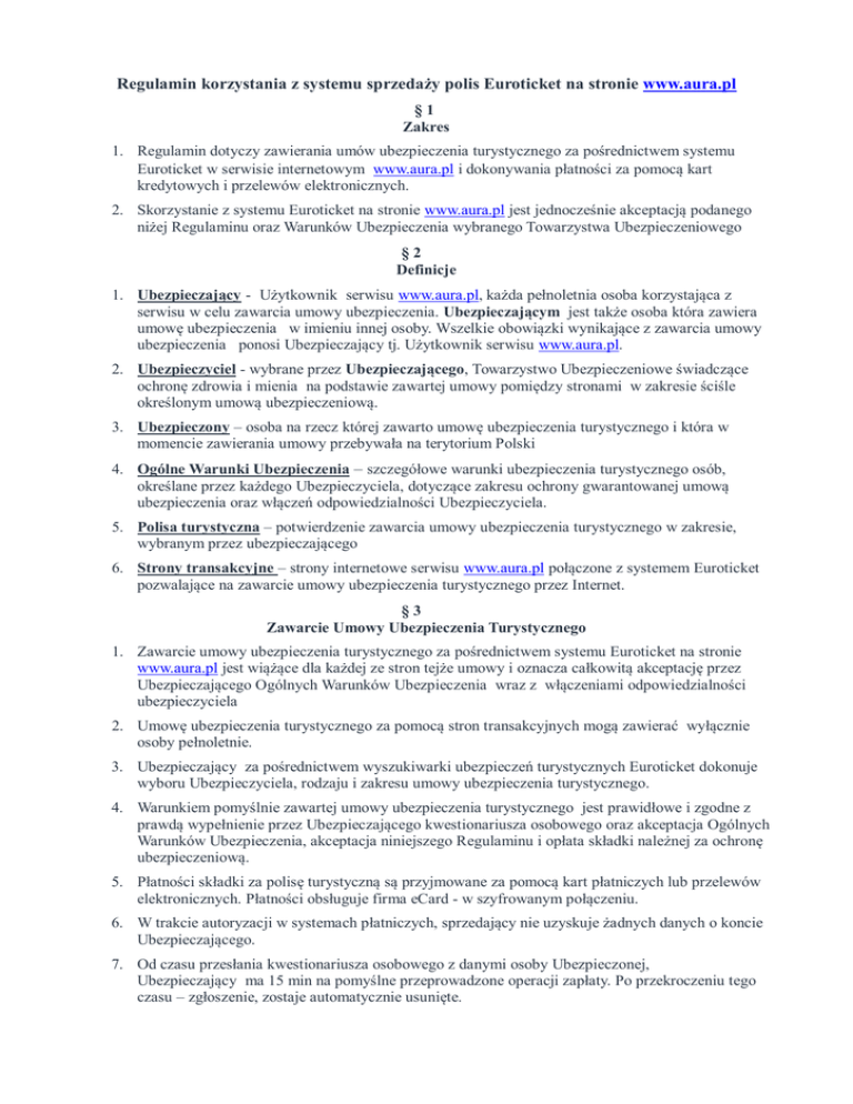 Regulamin korzystania z systemu sprzedaży polis Euroticket na stronie www.aura.pl §1 Zakres 1. Regulamin dotyczy zawierania umów ubezpieczenia turystycznego za pośrednictwem systemu Euroticket w serwisie internetowym www.aura.pl i dokonywania płatności za pomocą kart kredytowych i przelewów elektronicznych. 2. Skorzystanie z systemu Euroticket na stronie www.aura.pl jest jednocześnie akceptacją podanego niżej Regulaminu oraz Warunków Ubezpieczenia wybranego Towarzystwa Ubezpieczeniowego §2 Definicje 1. Ubezpieczający - Użytkownik serwisu www.aura.pl, każda pełnoletnia osoba korzystająca z serwisu w celu zawarcia umowy ubezpieczenia. Ubezpieczającym jest także osoba która zawiera umowę ubezpieczenia w imieniu innej osoby. Wszelkie obowiązki wynikające z zawarcia umowy ubezpieczenia ponosi Ubezpieczający tj. Użytkownik serwisu www.aura.pl. 2. Ubezpieczyciel - wybrane przez Ubezpieczającego, Towarzystwo Ubezpieczeniowe świadczące ochronę zdrowia i mienia na podstawie zawartej umowy pomiędzy stronami w zakresie ściśle określonym umową ubezpieczeniową. 3. Ubezpieczony – osoba na rzecz której zawarto umowę ubezpieczenia turystycznego i która w momencie zawierania umowy przebywała na terytorium Polski 4. Ogólne Warunki Ubezpieczenia – szczegółowe warunki ubezpieczenia turystycznego osób, określane przez każdego Ubezpieczyciela, dotyczące zakresu ochrony gwarantowanej umową ubezpieczenia oraz włączeń odpowiedzialności Ubezpieczyciela. 5. Polisa turystyczna – potwierdzenie zawarcia umowy ubezpieczenia turystycznego w zakresie, wybranym przez ubezpieczającego 6. Strony transakcyjne – strony internetowe serwisu www.aura.pl połączone z systemem Euroticket pozwalające na zawarcie umowy ubezpieczenia turystycznego przez Internet. §3 Zawarcie Umowy Ubezpieczenia Turystycznego 1. Zawarcie umowy ubezpieczenia turystycznego za pośrednictwem systemu Euroticket na stronie www.aura.pl jest wiążące dla każdej ze stron tejże umowy i oznacza całkowitą akceptację przez Ubezpieczającego Ogólnych Warunków Ubezpieczenia wraz z włączeniami odpowiedzialności ubezpieczyciela 2. Umowę ubezpieczenia turystycznego za pomocą stron transakcyjnych mogą zawierać wyłącznie osoby pełnoletnie. 3. Ubezpieczający za pośrednictwem wyszukiwarki ubezpieczeń turystycznych Euroticket dokonuje wyboru Ubezpieczyciela, rodzaju i zakresu umowy ubezpieczenia turystycznego. 4. Warunkiem pomyślnie zawartej umowy ubezpieczenia turystycznego jest prawidłowe i zgodne z prawdą wypełnienie przez Ubezpieczającego kwestionariusza osobowego oraz akceptacja Ogólnych Warunków Ubezpieczenia, akceptacja niniejszego Regulaminu i opłata składki należnej za ochronę ubezpieczeniową. 5. Płatności składki za polisę turystyczną są przyjmowane za pomocą kart płatniczych lub przelewów elektronicznych. Płatności obsługuje firma eCard - w szyfrowanym połączeniu. 6. W trakcie autoryzacji w systemach płatniczych, sprzedający nie uzyskuje żadnych danych o koncie Ubezpieczającego. 7. Od czasu przesłania kwestionariusza osobowego z danymi osoby Ubezpieczonej, Ubezpieczający ma 15 min na pomyślne przeprowadzone operacji zapłaty. Po przekroczeniu tego czasu – zgłoszenie, zostaje automatycznie usunięte. 8. Za odrzucenie zgłoszenia, w przypadku nie dokonania płatności w określonym limicie czasu, Serwis www.aura.pl nie ponosi odpowiedzialności. 9. Aby dokonać płatności za wybrany rodzaj ubezpieczenia, należy posiadać obsługiwaną przez eCard kartę płatniczą lub konto z dostępem internetowym w odpowiednim banku oraz zabezpieczyć odpowiednią kwotę na obciążenie karty lub rachunku bankowego. 10. W przypadku braku możliwości zablokowania odpowiedniej kwoty na karcie płatniczej lub brak wystarczających środków na koncie – umowa ubezpieczeniowa nie zostanie zawarta. 11. Po pomyślnym opłaceniu składki za polisę turystyczną , Ubezpieczający samodzielnie drukuje polisę na kartce formatu A4. 12. Wydrukowana polisa turystyczna jest dokumentem potwierdzającym zawarcie umowy ubezpieczenia 13. Ubezpieczający na podany adres email otrzymuje informację o zawartym ubezpieczeniu oraz dane dostępowe: numer transakcji i PIN, które pozwolą ponownie zalogować się do systemu Euroticket na stronie www.aura.pl, aby wydrukować polisę turystyczną w późniejszym terminie. §4 Zwroty składki za odstąpienie od umowy ubezpieczenia 1. Warunkiem otrzymania zwrotu składki wpłaconej za polisę ubezpieczeniową jest pisemna zgoda Ubezpieczyciela, wydana na pisemny wniosek Ubezpieczającego .Tylko prośby złożone w formie pisemnej i minimum 3 dni przed terminem rozpoczęcia ochrony ubezpieczeniowej, wskazanym w zawartej umowie, będą rozpatrzone. §5 Ochrona danych osobowych 1. Do zawarcia umowy ubezpieczenia turystycznego niezbędne jest podanie danych osobowych osoby Ubezpieczonej tj. (imię, nazwisko, data urodzenia i adres zameldowania). Podane dane w kwestionariuszu są wykorzystywane i przetwarzane wyłącznie w celu prawidłowej rejestracji umowy ubezpieczenia. Dodatkowe dane osobowe mają charakter dobrowolny i wykorzystywane są przez Administratora danych tylko w sytuacjach awaryjnych. Administratorem danych osobowych podawanych przez Ubezpieczającego jest Ubezpieczyciel, z którym zostaje zawarta Umowa Ubezpieczenia Turystycznego. §6 Prawa i obowiązki stron 1. Ubezpieczający jest zobowiązany jest do korzystania z systemu Euroticket na stronie www.aura.pl zgodnie z jego przeznaczeniem, przepisami prawa oraz niniejszym Regulaminem. 2. Ubezpieczający jest zobowiązany do podania prawdziwych danych osobowych, prawdziwych danych na temat zdrowia osoby objętej umową ubezpieczenia oraz prawdziwych danych dotyczących płatności. 3. Wykorzystywanie Serwisu do zawierania fikcyjnych umów ubezpieczenia oraz podawanie nieprawdziwych lub fałszywych danych osobowych, jest niedozwolona. 4. Ubezpieczający dokonując zawarcia