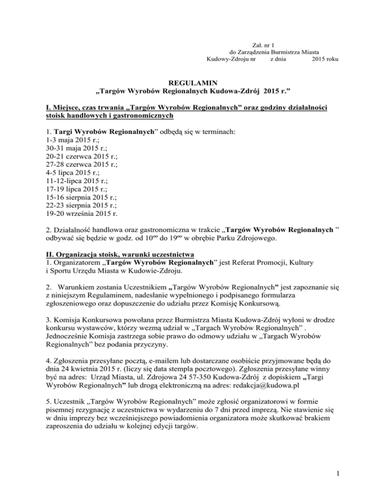 Zał. nr 1 do Zarządzenia Burmistrza Miasta Kudowy-Zdroju nr z dnia 2015 roku REGULAMIN „Targów Wyrobów Regionalnych Kudowa-Zdrój 2015 r.” I. Miejsce, czas trwania „Targów Wyrobów Regionalnych” oraz godziny działalności stoisk handlowych i gastronomicznych 1. Targi Wyrobów Regionalnych” odbędą się w terminach: 1-3 maja 2015 r.; 30-31 maja 2015 r.; 20-21 czerwca 2015 r.; 27-28 czerwca 2015 r.; 4-5 lipca 2015 r.; 11-12-lipca 2015 r.; 17-19 lipca 2015 r.; 15-16 sierpnia 2015 r.; 22-23 sierpnia 2015 r.; 19-20 września 2015 r. 2. Działalność handlowa oraz gastronomiczna w trakcie „Targów Wyrobów Regionalnych ” odbywać się będzie w godz. od 10ºº do 19ºº w obrębie Parku Zdrojowego. II. Organizacja stoisk, warunki uczestnictwa 1. Organizatorem „Targów Wyrobów Regionalnych” jest Referat Promocji, Kultury i Sportu Urzędu Miasta w Kudowie-Zdroju. 2. Warunkiem zostania Uczestnikiem „Targów Wyrobów Regionalnych” jest zapoznanie się z niniejszym Regulaminem, nadesłanie wypełnionego i podpisanego formularza zgłoszeniowego oraz dopuszczenie do udziału przez Komisję Konkursową. 3. Komisja Konkursowa powołana przez Burmistrza Miasta Kudowa-Zdrój wyłoni w drodze konkursu wystawców, którzy wezmą udział w „Targach Wyrobów Regionalnych” . Jednocześnie Komisja zastrzega sobie prawo do odmowy udziału w „Targach Wyrobów Regionalnych” bez podania przyczyny. 4. Zgłoszenia przesyłane pocztą, e-mailem lub dostarczane osobiście przyjmowane będą do dnia 24 kwietnia 2015 r. (liczy się data stempla pocztowego). Zgłoszenia przesyłane winny być na adres: Urząd Miasta, ul. Zdrojowa 24 57-350 Kudowa-Zdrój z dopiskiem „Targi Wyrobów Regionalnych” lub drogą elektroniczną na adres: [email protected] 5. Uczestnik „Targów Wyrobów Regionalnych” może zgłosić organizatorowi w formie pisemnej rezygnację z uczestnictwa w wydarzeniu do 7 dni przed imprezą. Nie stawienie się w dniu imprezy bez wcześniejszego powiadomienia organizatora może skutkować brakiem zaproszenia do udziału w kolejnej edycji targów. 1 6. Warunkiem udziału w „Targach Wyrobów Regionalnych” jest spełnienie warunków zawartych w pkt. II.3 oraz stawienie się Uczestnika na miejscu imprezy w dniu jej rozpoczęcia do godz. 10ºº. 7. Uczestnik ma obowiązek prowadzić działalność stoiska w godzinach wyznaczonych przez Referat Promocji, Kultury i Sportu. Uczestnik nie może zakończyć działalności stoiska przed godziną 18.00. Ewentualne zmiany dotyczące godzin prowadzenia stoiska muszą być ustalane z organizatorem i wprowadzane wyłącznie za jego zgodą. 8. Organizator zapewnia uczestnikowi Targów teren oraz namiot zwany stoiskiem wystawienniczym, w obrębie którego będzie eksponowany towar lub udostępnia miejsce do przygotowania stoiska. Udostępnione przez Referat Promocji, Kultury i Sportu stoisko przeznaczone jest wyłącznie dla Uczestnika „Targów Wyrobów Regionalnych”, który jest za nie odpowiedzialny. Uczestnik zobowiązany jest do utrzymywania wysokiego poziomu estetyki stoiska, dbania o czystość w obrębie stoiska oraz chronić je przed uszkodzeniami. Po zakończeniu działalności stoiska Uczestnik zobowiązany jest do jego posprzątania. 9. W przypadku gdy stoisko ulegnie zniszczeniu, za wyjątkiem szkód spowodowanych działaniem sił przyrody, bądź do spowodowania których nie przyczyniło się działanie bądź zaniechanie Uczestnika, odpowiedzialność materialną za szkody ponosi Uczestnik. 10. Uczestnicy Targów zorganizują swoje stoiska w miejscu wyznaczonym przez organizatora imprezy, przy czym organizator zastrzega sobie prawo do jego zmiany z przyczyn organizacyjnych lub technicznych. 11. Rodzaj oraz rozmiary stoiska przyznanego Uczestnikowi nie podlegają zamianie, a ich przydział wynika z zaistniałej sytuacji logistyczno – organizacyjnej. Organizator wyznacza stoiska i miejsce dla Uczestnika kierując się dbałością o jakość imprezy oraz zadowolenie i bezpieczeństwo Uczestników, współorganizatorów oraz osób odwiedzających „Targi Wyrobów Regionalnych ”. Stoiska własne Uczestnika wymagają obowiązkowej pisemnej akceptacji koordynatora „Targów Wyrobów Regionalnych”. 12. Osoby obsługujące punkty żywnościowe oraz stoiska, na których prowadzi się sprzedaż lub dystrybucję artykułów spożywczych muszą bezwzględnie posiadać ważną książeczką badań dla celów sanitarno – epidemiologicznych a oferowane wyroby powinny cechować się wyjątkowym i oryginalnym charakterem z cechami zdrowej żywności. 13. Osoby odpowiedzialne za stoiska, na których prowadzi się sprzedaż lub dystrybucję artykułów alkoholowych winny posiadać aktualną koncesję na sprzedaż alkoholu uzyskaną w Urzędzie Miasta w Kudowie-Zdroju. 14. Uczestnik ma obowiązek zastosować się do wytycznych organizatora dotyczących estetyki stoiska. 15. Pokazy i warsztaty organizowane przy stoiskach stanowią indywidualną formę promocji Uczestnika, którą Uczestnik organizuje we własnym zakresie i na własny koszt. W uzasadnionych przypadkach organizator targów zastrzega sobie prawo ingerencji w ich formę. 2 16. Użytkownicy stoisk zobowiązani są do przestrzegania obowiązujących przepisów dotyczących oznaczenia placówki, wprowadzania do obrotu handlowego towarów odpowiednio oznakowanych, posługiwania się narzędziami pomiarowymi legalizowanymi, przestrzegania terminów przydatności do spożycia i trwałości towarów spożywczych przeznaczonych do sprzedaży i degustacji. 17. Organizator ma prawo do wyłączenia ze sprzedaży stoiska/ towaru, który według organizatora jest niezgodny z charakterem „Targów Wyrobów Regionalnych”. 18. Uczestnik wystawia na stoisku artykuły, które zostały wymienione w formularzu zgłoszeniowym nadesłanym do Referatu Promocji, Kultury i Sportu lub, których rodzaj został ustalony z organizatorem. Organizator zastrzega sobie prawo do decyzji d