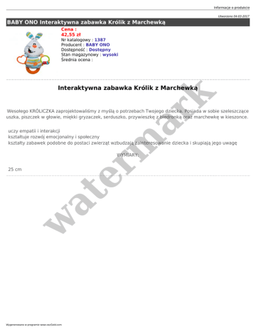 Informacje o produkcie Utworzono 04-03-2017 BABY ONO Interaktywna zabawka Królik z Marchewką Cena : 42,55 zł Nr katalogowy : 1387 Producent : BABY ONO Dostępność : Dostępny Stan magazynowy : wysoki Średnia ocena : er m ar k Interaktywna zabawka Królik z Marchewką Wesołego KRÓLICZKA zaprojektowaliśmy z myślą o potrzebach Twojego dziecka. Posiada w sobie szeleszczące uszka, piszczek w głowie, miękki gryzaczek, serduszko, przywieszkę z biedronką oraz marchewkę w kieszonce. uczy empatii i interakcji kształtuje rozwój emocjonalny i społeczny kształty zabawek podobne do postaci zwierząt wzbudzają zainteresowanie dziecka i skupiają jego uwagę WYMIARY: w at 25 cm Wygenerowano w programie www.oscGold.com