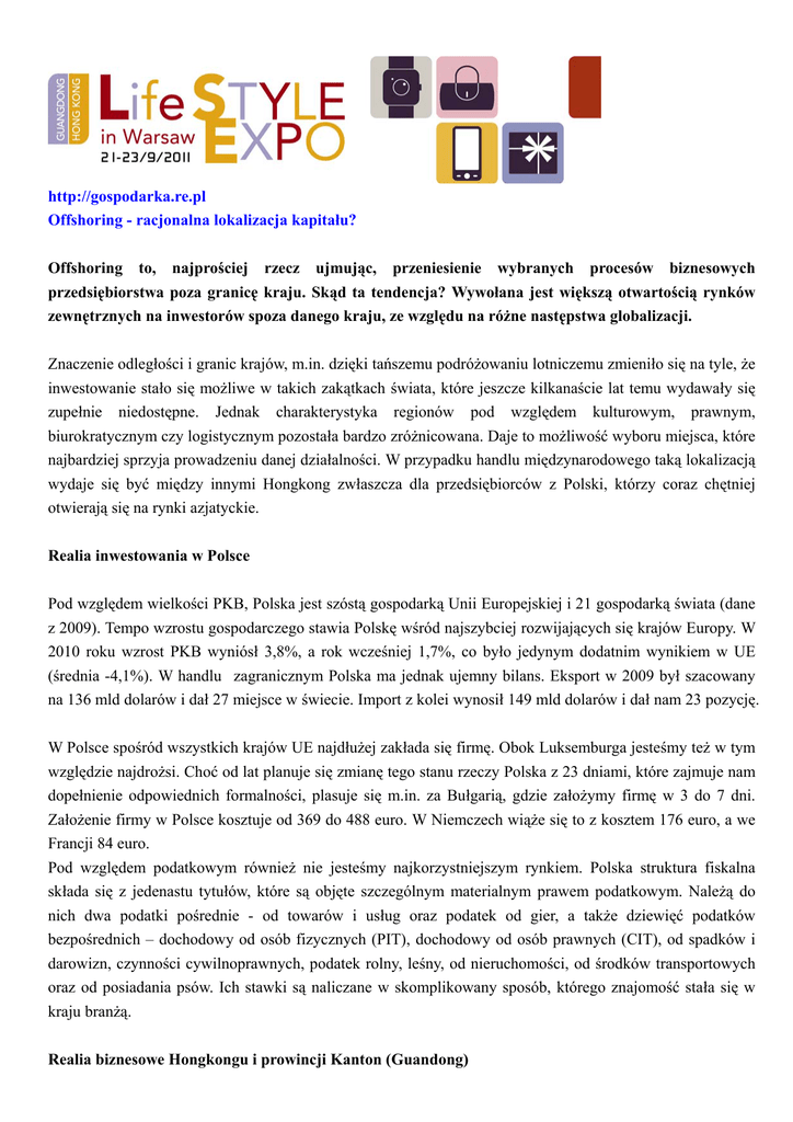 http://gospodarka.re.pl Offshoring - racjonalna lokalizacja kapitału? Offshoring to, najprościej rzecz ujmując, przeniesienie wybranych procesów biznesowych przedsiębiorstwa poza granicę kraju. Skąd ta tendencja? Wywołana jest większą otwartością rynków zewnętrznych na inwestorów spoza danego kraju, ze względu na różne następstwa globalizacji. Znaczenie odległości i granic krajów, m.in. dzięki tańszemu podróżowaniu lotniczemu zmieniło się na tyle, że inwestowanie stało się możliwe w takich zakątkach świata, które jeszcze kilkanaście lat temu wydawały się zupełnie niedostępne. Jednak charakterystyka regionów pod względem kulturowym, prawnym, biurokratycznym czy logistycznym pozostała bardzo zróżnicowana. Daje to możliwość wyboru miejsca, które najbardziej sprzyja prowadzeniu danej działalności. W przypadku handlu międzynarodowego taką lokalizacją wydaje się być między innymi Hongkong zwłaszcza dla przedsiębiorców z Polski, którzy coraz chętniej otwierają się na rynki azjatyckie. Realia inwestowania w Polsce Pod względem wielkości PKB, Polska jest szóstą gospodarką Unii Europejskiej i 21 gospodarką świata (dane z 2009). Tempo wzrostu gospodarczego stawia Polskę wśród najszybciej rozwijających się krajów Europy. W 2010 roku wzrost PKB wyniósł 3,8%, a rok wcześniej 1,7%, co było jedynym dodatnim wynikiem w UE (średnia -4,1%). W handlu zagranicznym Polska ma jednak ujemny bilans. Eksport w 2009 był szacowany na 136 mld dolarów i dał 27 miejsce w świecie. Import z kolei wynosił 149 mld dolarów i dał nam 23 pozycję. W Polsce spośród wszystkich krajów UE najdłużej zakłada się firmę. Obok Luksemburga jesteśmy też w tym względzie najdrożsi. Choć od lat planuje się zmianę tego stanu rzeczy Polska z 23 dniami, które zajmuje nam dopełnienie odpowiednich formalności, plasuje się m.in. za Bułgarią, gdzie założymy firmę w 3 do 7 dni. Założenie firmy w Polsce kosztuje od 369 do 488 euro. W Niemczech wiąże się to z kosztem 176 euro, a we Francji 84 euro. Pod względem podatkowym również nie jesteśmy najkorzystniejszym rynkiem. Polska struktura fiskalna składa się z jedenastu tytułów, które są objęte szczególnym materialnym prawem podatkowym. Należą do nich dwa podatki pośrednie - od towarów i usług oraz podatek od gier, a także dziewięć podatków bezpośrednich – dochodowy od osób fizycznych (PIT), dochodowy od osób prawnych (CIT), od spadków i darowizn, czynności cywilnoprawnych, podatek rolny, leśny, od nieruchomości, od środków transportowych oraz od posiadania psów. Ich stawki są naliczane w skomplikowany sposób, którego znajomość stała się w kraju branżą. Realia biznesowe Hongkongu i prowincji Kanton (Guandong) Zacznijmy od możliwości rozwojowych regionu. Hongkong i Dolina Rzeki Perłowej jest jedną z najbardziej dynamicznych gospodarek, od uruchomienia programu reform w Chinach w 1979 roku. W tym okresie, średnie realne tempo wzrostu PKB w tym rejonie przekroczyło 16%. Przepływa przez niego 24% chińskiego handlu zagranicznego. W 2010 roku gospodarka Hongkongu po raz siedemnasty została ogłoszona najbardziej wolną na świecie (Polska zajęła 71 miejsce) oraz najbardziej konkurencyjnym systemem gospodarczym na podstawie Globalisation Index. Jak te wskaźniki przekładają się na korzyści dla indywidualnego przedsiębiorcy? Może on być pewien sprawnego i prostego systemu prawnego, swobody przepływu informacji, dóbr i kapitału, znakomitej infrastruktury, dostępu do największych banków, powszechnej znajomości angielskiego wśród przedsiębiorców i dobrych relacji handlowych z Chinami. Ponadto od niedawna można zarejestrować tam firmę przez Internet i już w tym samym dniu rozpocząć działalność. - Informacją kluczową dla wielu przedsiębiorców okazuje się być prosty i korzystny system podatkowy - CIT maksymalnie 16,5%, podatek dochodowy maksymalnie 15%. W Hongkongu obowiązują tylko trzy podatki bezpośrednie: od zysków, wynagrodzeń i nieruchomości. Nie ma natomiast podatku VAT, podatku od sprzedaży, podatku u źródła, podatku od zysków kapitałowych, ani podatku od dywidend – mówi Piotr Sierak, ekspert z Rady Rozwoju Handlu Hongkongu, instytucji zajmującej się m.in. organizacją Targów Lifestyle Expo w Polsce. Takie uwarunkowania sprawiły, że rynek ten stał się prawdziwym centrum działań typu Offshore. Na fakt ten znacząco wpłynęła także korzystna lokalizacja i system logistyczny. Między innymi dzięki temu obroty handlowe między Polską, a Hongkongiem w 2009 roku wyniosły 723 miliony USD, a handel z Polską ciągle się rozwija. W 2009 roku eksport z Polski do Chin wzrósł o 21%, a do Hongkongu o 84,1%. Rejon ten jest idealnym miejscem do eksportu towarów na dalsze rynki zewnętrzne, począwszy od Chin kontynentalnych. Eksperci prognozują, że rozwój współpracy między przedsiębiorcami z Polski, a rynkami azjatyckimi będzie się rozwijał. Nic dziwnego, w końcu każdy inwestor chce właściwie ulokować swój kapitał.