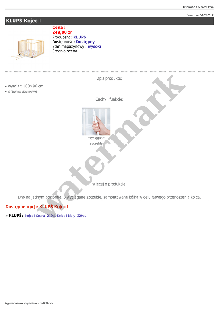 Informacje o produkcie Utworzono 04-03-2017 KLUPŚ Kojec I Cena : 249,00 zł Producent : KLUPŚ Dostępność : Dostępny Stan magazynowy : wysoki Średnia ocena : ● ● wymiar: 100×96 cm drewno sosnowe er m ar k Opis produktu: Cechy i funkcje: Wyciągane at szczeble Więcej o produkcie: w Dno na jednym poziomie, 3 wyciągane szczeble, zamontowane kółka w celu łatwego przenoszenia kojca. Dostępne opcje KLUPŚ Kojec I » KLUPŚ: Kojec I Sosna- 219zł, Kojec I Biały- 229zł. Wygenerowano w programie www.oscGold.com