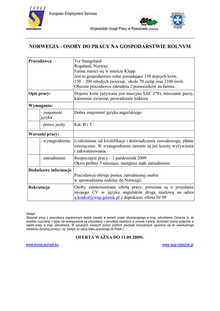 European Employment Services Wojewódzki Urząd Pracy w Rzeszowie (Gdańsk) NORWEGIA - OSOBY DO PRACY NA GOSPODARSTWIE ROLNYM Pracodawca Tor Stangeland Rogaland, Norway Farma mieści się w mieście Klepp. Jest to gospodarstwo rolne posiadające 150 dojnych krów, 150 – 200 młodych zwierząt, około 70 cieląt oraz 2100 świń. Obecnie pracodawca zatrudnia 2 pomocników na farmie. Opis pracy: Dojenie krów (używana jest maszyna SAC 2*8), mieszanie paszy, karmienie zwierząt, prowadzenie traktora Wymagania: - znajomość języka Dobra znajomość języka angielskiego - prawo jazdy Kat. B i T Warunki pracy: - wynagrodzenie Uzależnione od kwalifikacji i doświadczenia zawodowego, płatne miesięcznie. W wynagrodzeniu zawarte są już koszty wyżywienia i zakwaterowania. - zatrudnienie Rozpoczęcie pracy – 1 październik 2009 Okres próbny 3 miesiące, następnie stałe zatrudnienie. Dodatkowe informacje Pracodawca oferuje pomoc zatrudnionej osobie w sprowadzeniu rodziny do Norwegii. Rekrutacja Osoby zainteresowane ofertą pracy, proszone są o przesłanie swojego CV w języku angielskim drogą mailową na adres [email protected] z dopiskiem: oferta Nr 99 Uwaga: Stosunek pracy z pracodawcą zagranicznym będzie zawarty w ramach prawa obowiązującego w kraju zatrudnienia. Oznacza to, że wszelkie roszczenie z tytułu nie wywiązywania się pracodawcy z warunków zawartych w umowie o pracę, dochodzić można wyłącznie w sądzie pracy w kraju zatrudnienia. W sytuacjach losowych pomoc polskich placówek konsularnych ogranicza się do ewentualnego udzielenia doraźnej pomocy ( np. kredytu na zakup biletu powrotnego do Polski ). OFERTA WAŻNA DO 11.09.2009r. www.eures.europa.eu www.wup-rzeszow.pl