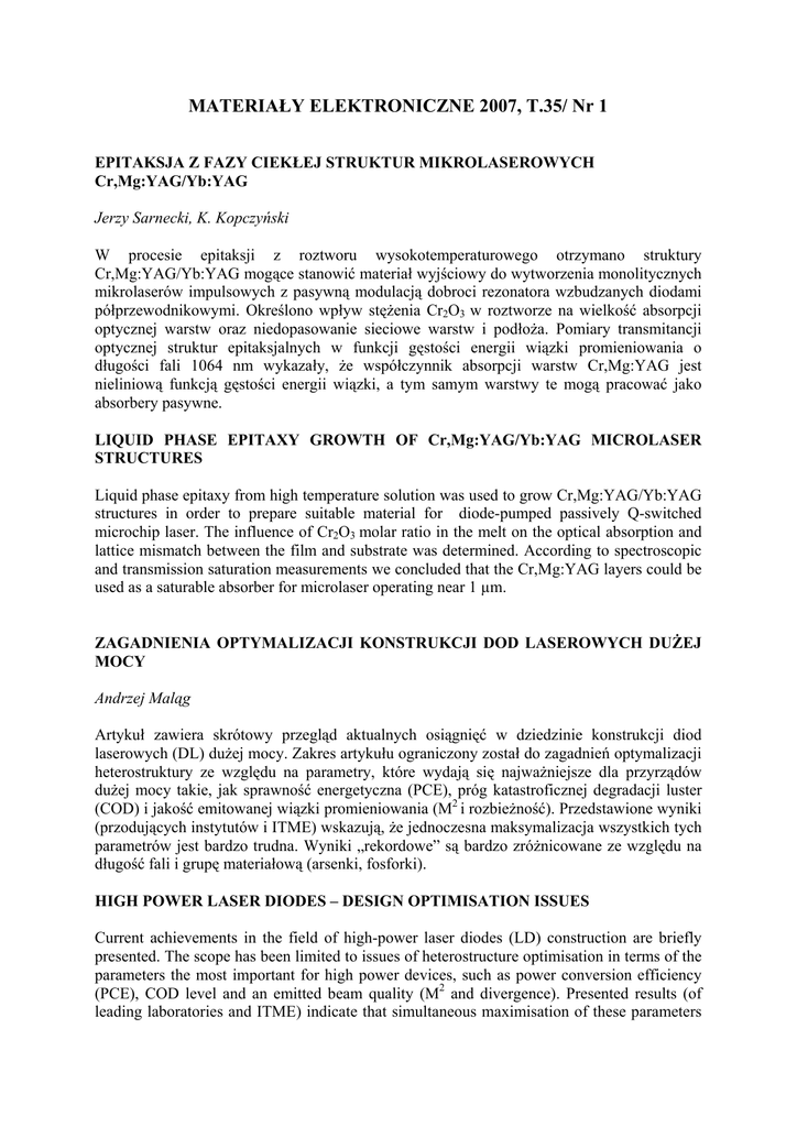 MATERIAŁY ELEKTRONICZNE 2007, T.35/ Nr 1 EPITAKSJA Z FAZY CIEKŁEJ STRUKTUR MIKROLASEROWYCH Cr,Mg:YAG/Yb:YAG Jerzy Sarnecki, K. Kopczyński W procesie epitaksji z roztworu wysokotemperaturowego otrzymano struktury Cr,Mg:YAG/Yb:YAG mogące stanowić materiał wyjściowy do wytworzenia monolitycznych mikrolaserów impulsowych z pasywną modulacją dobroci rezonatora wzbudzanych diodami półprzewodnikowymi. Określono wpływ stężenia Cr2O3 w roztworze na wielkość absorpcji optycznej warstw oraz niedopasowanie sieciowe warstw i podłoża. Pomiary transmitancji optycznej struktur epitaksjalnych w funkcji gęstości energii wiązki promieniowania o długości fali 1064 nm wykazały, że współczynnik absorpcji warstw Cr,Mg:YAG jest nieliniową funkcją gęstości energii wiązki, a tym samym warstwy te mogą pracować jako absorbery pasywne. LIQUID PHASE EPITAXY GROWTH OF Cr,Mg:YAG/Yb:YAG MICROLASER STRUCTURES Liquid phase epitaxy from high temperature solution was used to grow Cr,Mg:YAG/Yb:YAG structures in order to prepare suitable material for diode-pumped passively Q-switched microchip laser. The influence of Cr2O3 molar ratio in the melt on the optical absorption and lattice mismatch between the film and substrate was determined. According to spectroscopic and transmission saturation measurements we concluded that the Cr,Mg:YAG layers could be used as a saturable absorber for microlaser operating near 1 µm. ZAGADNIENIA OPTYMALIZACJI KONSTRUKCJI DOD LASEROWYCH DUŻEJ MOCY Andrzej Maląg Artykuł zawiera skrótowy przegląd aktualnych osiągnięć w dziedzinie konstrukcji diod laserowych (DL) dużej mocy. Zakres artykułu ograniczony został do zagadnień optymalizacji heterostruktury ze względu na parametry, które wydają się najważniejsze dla przyrządów dużej mocy takie, jak sprawność energetyczna (PCE), próg katastroficznej degradacji luster (COD) i jakość emitowanej wiązki promieniowania (M2 i rozbieżność). Przedstawione wyniki (przodujących instytutów i ITME) wskazują, że jednoczesna maksymalizacja wszystkich tych parametrów jest bardzo trudna. Wyniki „rekordowe” są bardzo zróżnicowane ze względu na długość fali i grupę materiałową (arsenki, fosforki). HIGH POWER LASER DIODES – DESIGN OPTIMISATION ISSUES Current achievements in the field of high-power laser diodes (LD) construction are briefly presented. The scope has been limited to issues of heterostructure optimisation in terms of the parameters the most important for high power devices, such as power conversion efficiency (PCE), COD level and an emitted beam quality (M2 and divergence). Presented results (of leading laboratories and ITME) indicate that simultaneous maximisation of these parameters is very difficult. There is a wide diversity of the record-high attainments in terms of preferred design solutions and due to different wavelengths and material systems. DWUSZKLANE WŁÓKNA MIKROSTRUKTURALNE Ireneusz Kujawa, Ryszard Stępień, Dariusz Pysz, Przemysław Szarniak, Andrzej Lechna, Janusz Duszkiewicz, Krzysztof Haraśny, Irena Michalska Periodyczny rozkład współczynnika załamania światła we włóknie fotonicznym PCF (Photonic Crystal Fiber) uzyskuje się przez odpowiednie rozmieszczenie przestrzenne obszarów z przynajmniej dwóch dielektryków – zwykle szkła i powietrza. Dwuszklane włókna mikrostrukturalne są całkowicie szklanymi włóknami fotonicznymi, w przypadku których rolę węzłów sieci dwuwymiarowego kryształu fotonicznego pełnią inkluzje ze szkła o innym współczynniku załamania niż matryca włókna. Dzięki użyciu dwóch szkieł do utworzenia struktury periodycznej możliwa jest na etapie wytwarzania ścisła kontrola geometrii mikrostruktury kryształu. Umożliwia to uzyskanie światłowodu fotonicznego o zamierzonych własnościach optycznych. W artykule zaprezentowano wykonane w wyniku prac dwuszklane włókna fotoniczne oraz przedyskutowano ich potencjalne zastosowania. MICROSTRUCTURAL TWO-GLASSES OPTICAL FIBERS In the case of photonic crystal fibers using two or more multicomponent glasses in the photonic structure allows to manipulate refractive index contrast which is not possible in holey fibers. The all-solid holey fibers (SOHO) offer additional degree of freedom to the designer for determination of dispersion than in case of air-holes PCFs. Moreover a fabrication of all-solid PCFs allows for a better control of geometry and uniformity of the cladding structure design. We report on fabrication of such fibers made of multicomponent glasses. In the paper we also discuss possible future modifications of the structures and their potential applications. ZASTOSOWANIE KLEJÓW PRZEWODZĄCYCH W MIKROMONTAŻU ELEKTRONICZNYM JAKO ALTERNATYWY DO POŁĄCZEŃ LUTOWANYCH M. Słoma, Małgorzata Jakubowska, R. Jezior Artykuł zawiera analizę istniejących rozwiązań zastosowania klejów przewodzących w technologii montażu układów elektronicznych. Celem jego jest ukazanie zastosowań kompozytów przewodzących w montażu mikroelektronicznym, jako alternatywy do połączeń lutowanych. Dotychczas stosowane lutowia PbSn zawierające ołów są obecnie wypierane z montażu elektronicznego wskutek obowiązywania dyrektywy RoHS (Restriction of Hazardous Substances), wykluczającej stosowanie ołowiu, kadmu, rtęci i sześciowartościowego chromu w podzespołach elektronicznych. Nowe, bezołowiowe lutowia wymagają lutowania w wyższych temperaturach, co powoduje zwiększenie narażenia montowanych elementów. Proponowane przez autorów zastosowanie klejów przewodzących pozwoli na uniknięcie tego negatywnego zjawiska. Przedstawiono opis i wyniki badań własnych, mających na celu porównanie parametrów elektrycznych i mechanicznych złącz wykonanych z zastosowaniem klejów przewodzących ze złączami wykonanymi tradycyjnymi metodami z zastosowaniem lutowia PbSn lub lutowia bezołowiowego. Zaproponowana porównawcza metoda pomiaru parametrów elektry