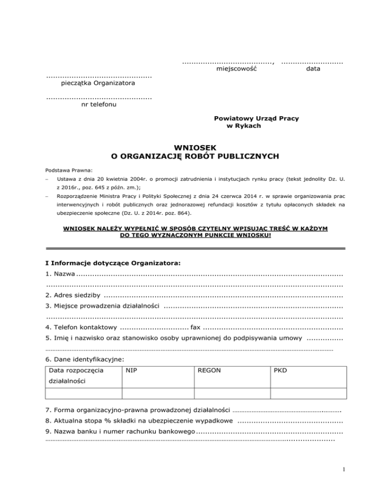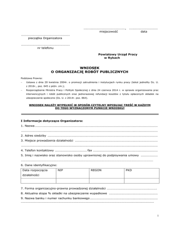 ....................................... , miejscowość ........................... data .............................................. pieczątka Organizatora .............................................. nr telefonu Powiatowy Urząd Pracy w Rykach WNIOSEK O ORGANIZACJĘ ROBÓT PUBLICZNYCH Podstawa Prawna: − Ustawa z dnia 20 kwietnia 2004r. o promocji zatrudnienia i instytucjach rynku pracy (tekst jednolity Dz. U. z 2016r., poz. 645 z późn. zm.); − Rozporządzenie Ministra Pracy i Polityki Społecznej z dnia 24 czerwca 2014 r. w sprawie organizowania prac interwencyjnych i robót publicznych oraz jednorazowej refundacji kosztów z tytułu opłaconych składek na ubezpieczenie społeczne (Dz. U. z 2014r. poz. 864). WNIOSEK NALEŻY WYPEŁNIĆ W SPOSÓB CZYTELNY WPISUJĄC TREŚĆ W KAŻDYM DO TEGO WYZNACZONYM PUNKCIE WNIOSKU! I Informacje dotyczące Organizatora: 1. Nazwa .................................................................................................................... ................................................................................................................................. 2. Adres siedziby ........................................................................................................ 3. Miejsce prowadzenia działalności .............................................................................. ................................................................................................................................. 4. Telefon kontaktowy .............................. fax ............................................................. 5. Imię i nazwisko oraz stanowisko osoby uprawnionej do podpisywania umowy ................ ………………………………………………………………………………………………………………………………………………… 6. Dane identyfikacyjne: Data rozpoczęcia NIP REGON PKD działalności 7. Forma organizacyjno-prawna prowadzonej działalności …………………………………………….………. 8. Aktualna stopa % składki na ubezpieczenie wypadkowe .............................................. 9. Nazwa banku i numer rachunku bankowego ................................................................ …………………………………………………………………………………………………………………………..................... 1 Organizator robót publicznych wskazuje i upoważnia do zawarcia umowy o pracę w ramach robót publicznych pracodawcę ................................................................ ................................................................................................................................. II Informacja dotycząca Pracodawcy (organizator robót publicznych uzupełnia w przypadku, gdy nie będzie jednocześnie pracodawcą dla skierowanych bezrobotnych): 1 Pełna nazwa Pracodawcy .......................................................................................... ................................................................................................................................. 2. Adres siedziby ........................................................................................................ 3. Miejsce prowadzenia działalności .............................................................................. ................................................................................................................................. 4. Telefon kontaktowy .............................. fax ............................................................. 5. Imię i nazwisko oraz stanowisko osoby uprawnionej do podpisywania umowy ................ ………………………………………………………………………………………………………………………………………………… 6. Dane identyfikacyjne: Data rozpoczęcia NIP REGON PKD działalności 7. Forma organizacyjno-prawna prowadzonej działalności …………………………………………….………………………………………………………………………………………………………. 8. Aktualna stopa % składki na ubezpieczenie wypadkowe .............................................. 9. Nazwa banku i numer rachunku bankowego ................................................................ …………………………………………………………………………………………………………………………......................... III Informacje dotyczące zatrudnienia: 1. Liczba bezrobotnych proponowanych do zatrudnienia w ramach robót publicznych ......... 2. Proponowany okres zatrudnienia………………………………………………………………………………………….. 3. Wnioskowany okres refundacji…………………………………...………………………………………………………… 4. Proponowana wysokość wynagrodzenia .................................................................... 5. Wnioskowana wysokość refundowanego wynagrodzenia ............................................. 6. Całkowity koszt organizacji robót publicznych dla ww. liczby osób wynosi ..................... zł w tym zaangażowanie środków własnych ...................................................................... zł 7. Warunki pracy, możliwość zakwaterowania, dowozu do miejsc pracy, inne uprawnienia jakie będą przysługiwały skierowanym osobom bezrobotnym zatrudnionym w ramach robót publicznych ................................................................................................................................. ................................................................................................................................. .................................................................................................................