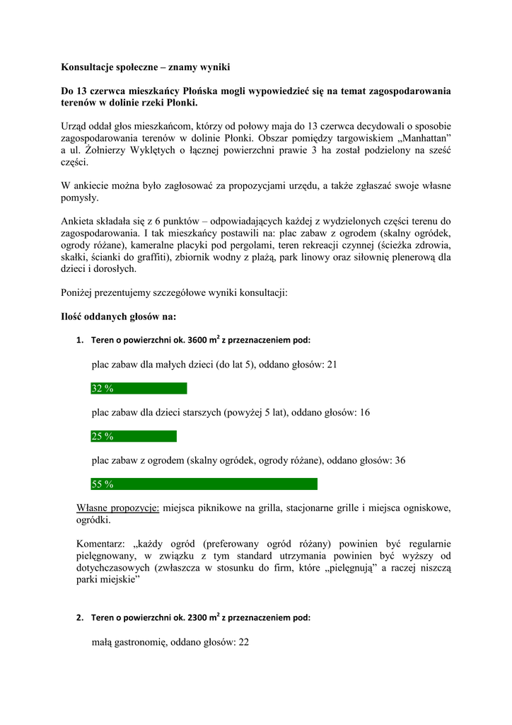 Konsultacje społeczne – znamy wyniki Do 13 czerwca mieszkańcy Płońska mogli wypowiedzieć się na temat zagospodarowania terenów w dolinie rzeki Płonki. Urząd oddał głos mieszkańcom, którzy od połowy maja do 13 czerwca decydowali o sposobie zagospodarowania terenów w dolinie Płonki. Obszar pomiędzy targowiskiem „Manhattan” a ul. Żołnierzy Wyklętych o łącznej powierzchni prawie 3 ha został podzielony na sześć części. W ankiecie można było zagłosować za propozycjami urzędu, a także zgłaszać swoje własne pomysły. Ankieta składała się z 6 punktów – odpowiadających każdej z wydzielonych części terenu do zagospodarowania. I tak mieszkańcy postawili na: plac zabaw z ogrodem (skalny ogródek, ogrody różane), kameralne placyki pod pergolami, teren rekreacji czynnej (ścieżka zdrowia, skałki, ścianki do graffiti), zbiornik wodny z plażą, park linowy oraz siłownię plenerową dla dzieci i dorosłych. Poniżej prezentujemy szczegółowe wyniki konsultacji: Ilość oddanych głosów na: 1. Teren o powierzchni ok. 3600 m2 z przeznaczeniem pod: plac zabaw dla małych dzieci (do lat 5), oddano głosów: 21 32 % plac zabaw dla dzieci starszych (powyżej 5 lat), oddano głosów: 16 25 % plac zabaw z ogrodem (skalny ogródek, ogrody różane), oddano głosów: 36 55 % Własne propozycje: miejsca piknikowe na grilla, stacjonarne grille i miejsca ogniskowe, ogródki. Komentarz: „każdy ogród (preferowany ogród różany) powinien być regularnie pielęgnowany, w związku z tym standard utrzymania powinien być wyższy od dotychczasowych (zwłaszcza w stosunku do firm, które „pielęgnują” a raczej niszczą parki miejskie” 2. Teren o powierzchni ok. 2300 m2 z przeznaczeniem pod: małą gastronomię, oddano głosów: 22 34 % restauracje, oddano głosów: 23 35 % kameralne placyki pod pergolami, oddano głosów: 34 52 % Własne propozycje: ogródki piwne, regały bookcrossingowe. Komentarz: „byle miejsca te nie stały się lokalnymi miejscami nocnych libacji” 3. Teren o powierzchni ok. 7200 m2 z przeznaczeniem pod: teren rekreacji czynnej – boisko wielofunkcyjne oddano głosów: 18 28 % teren rekreacji czynnej – ścieżka zdrowia, skałki, ścianki do graffiti oddano głosów: 25 38 % teren boisk piaskowych – siatka plażowa, ringo, kometka oddano głosów: 20 31 % kort tenisowy oddano głosów: 16 25 % Własne propozycje: coś dla sport, ścianka do wspinaczki, sport, siłownia plenerowa dla dzieci i dla dorosłych – fajnie jakby powstał kort tenisowy cos podobnego jak przy szkole podstawowej nr 3.niby on tam jest a ciężko w ogóle tam pograć bo są tworzone grupy stałe i normalny człowiek nie może nawet pograć a po drugi boisko jest objedzone przez fanatyków koszykówki 4. Teren o powierzchni ok. 3800 m2 z przeznaczeniem pod: plac żwirowy z konstrukcją do ekspozycji lub plakatów, oddano głosów: 1 2% zbiornik wodny z trawiastą pochylnią do opalania, oddano głosów: 18 28 % zbiornik wodny z plażą, oddano głosów: 45 69 % teren boisk piaskowych - siatka plażowa, ringo, kometka, oddano głosów: 14 22 % Własne propozycje: plaża 5. Teren o powierzchni ok. 7100 m2 z przeznaczeniem pod: park linowy, oddano głosów: 52 80 % park dinozaurów, oddano głosów: 17 26 % Własne propozycje: mini amfiteatr na występy plenerowe, gdzie każdy może zaprezentować swoje talenty + występy kabaretów, wieczorki z gitarą, park. 6. Teren o powierzchni ok. 2750 m2 z przeznaczeniem pod: skatepark, oddano głosów: 27 42 % siłownia plenerowa dla dzieci i dla dorosłych, oddano głosów: 42 65 % Własne propozycje: park dla zwierząt. Komentarz: „nawierzchnia wokół sprzętu siłowni powinna być wyłożona materiałem eliminującym błoto (kostka, nawierzchnia bitumiczna, sztuczna trawa, w przypadku podobnych miejsc w dotychczasowych lokalizacjach po opadach lub wiosną trudno dojść do zamontowa” W ankiecie oddano łącznie 65 głosów online. Brak wypełnionych ankiet w wersji papierowej. Komentarze cytujemy bez poprawek, zgodnie z oryginalną pisownią.