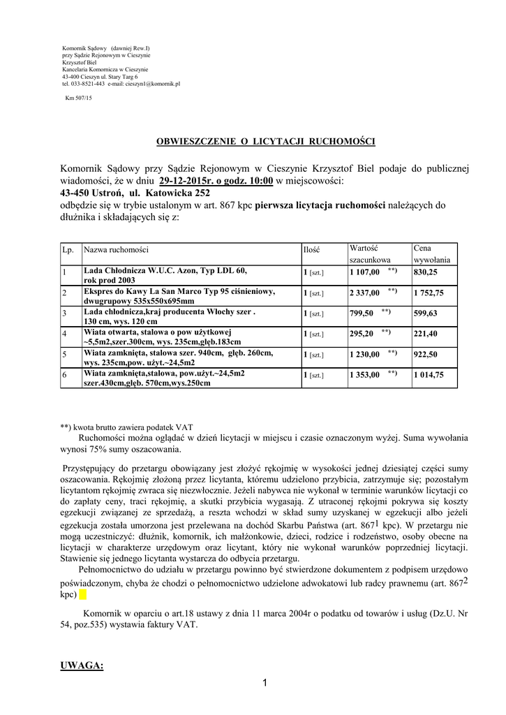 Komornik Sądowy (dawniej Rew.I) przy Sądzie Rejonowym w Cieszynie Krzysztof Biel Kancelaria Komornicza w Cieszynie 43-400 Cieszyn ul. Stary Targ 6 tel. 033-8521-443 e-mail: [email protected] Km 507/15 OBWIESZCZENIE O LICYTACJI RUCHOMOŚCI Komornik Sądowy przy Sądzie Rejonowym w Cieszynie Krzysztof Biel podaje do publicznej wiadomości, że w dniu 29-12-2015r. o godz. 10:00 w miejscowości: 43-450 Ustroń, ul. Katowicka 252 odbędzie się w trybie ustalonym w art. 867 kpc pierwsza licytacja ruchomości należących do dłużnika i składających się z: Lp. Nazwa ruchomości Ilość 1 Lada Chłodnicza W.U.C. Azon, Typ LDL 60, rok prod 2003 Ekspres do Kawy La San Marco Typ 95 ciśnieniowy, dwugrupowy 535x550x695mm Lada chłodnicza,kraj producenta Włochy szer . 130 cm, wys. 120 cm Wiata otwarta, stalowa o pow użytkowej ~5,5m2,szer.300cm, wys. 235cm,głęb.183cm Wiata zamknięta, stalowa szer. 940cm, głęb. 260cm, wys. 235cm,pow. użyt.~24,5m2 Wiata zamknięta,stalowa, pow.użyt.~24,5m2 szer.430cm,głęb. 570cm,wys.250cm 1 [szt.] Wartość szacunkowa 1 107,00 **) 1 [szt.] 2 337,00 1 [szt.] 799,50 **) 599,63 1 [szt.] 295,20 **) 221,40 1 [szt.] 1 230,00 **) 922,50 1 [szt.] 1 353,00 **) 1 014,75 2 3 4 5 6 **) Cena wywołania 830,25 1 752,75 **) kwota brutto zawiera podatek VAT Ruchomości można oglądać w dzień licytacji w miejscu i czasie oznaczonym wyżej. Suma wywołania wynosi 75% sumy oszacowania. Przystępujący do przetargu obowiązany jest złożyć rękojmię w wysokości jednej dziesiątej części sumy oszacowania. Rękojmię złożoną przez licytanta, któremu udzielono przybicia, zatrzymuje się; pozostałym licytantom rękojmię zwraca się niezwłocznie. Jeżeli nabywca nie wykonał w terminie warunków licytacji co do zapłaty ceny, traci rękojmię, a skutki przybicia wygasają. Z utraconej rękojmi pokrywa się koszty egzekucji związanej ze sprzedażą, a reszta wchodzi w skład sumy uzyskanej w egzekucji albo jeżeli egzekucja została umorzona jest przelewana na dochód Skarbu Państwa (art. 8671 kpc). W przetargu nie mogą uczestniczyć: dłużnik, komornik, ich małżonkowie, dzieci, rodzice i rodzeństwo, osoby obecne na licytacji w charakterze urzędowym oraz licytant, który nie wykonał warunków poprzedniej licytacji. Stawienie się jednego licytanta wystarcza do odbycia przetargu. Pełnomocnictwo do udziału w przetargu powinno być stwierdzone dokumentem z podpisem urzędowo poświadczonym, chyba że chodzi o pełnomocnictwo udzielone adwokatowi lub radcy prawnemu (art. 8672 kpc) Komornik w oparciu o art.18 ustawy z dnia 11 marca 2004r o podatku od towarów i usług (Dz.U. Nr 54, poz.535) wystawia faktury VAT. UWAGA: 1 Licytacja może się nie odbyć bez podania przyczyny. Jeżeli drzwi będą zamknięte, będą otwierane na koszt i odpowiedzialność dłużnika. Asesor Komorniczy Joanna Lipka 2 Komornik Sądowy Krzysztof Biel