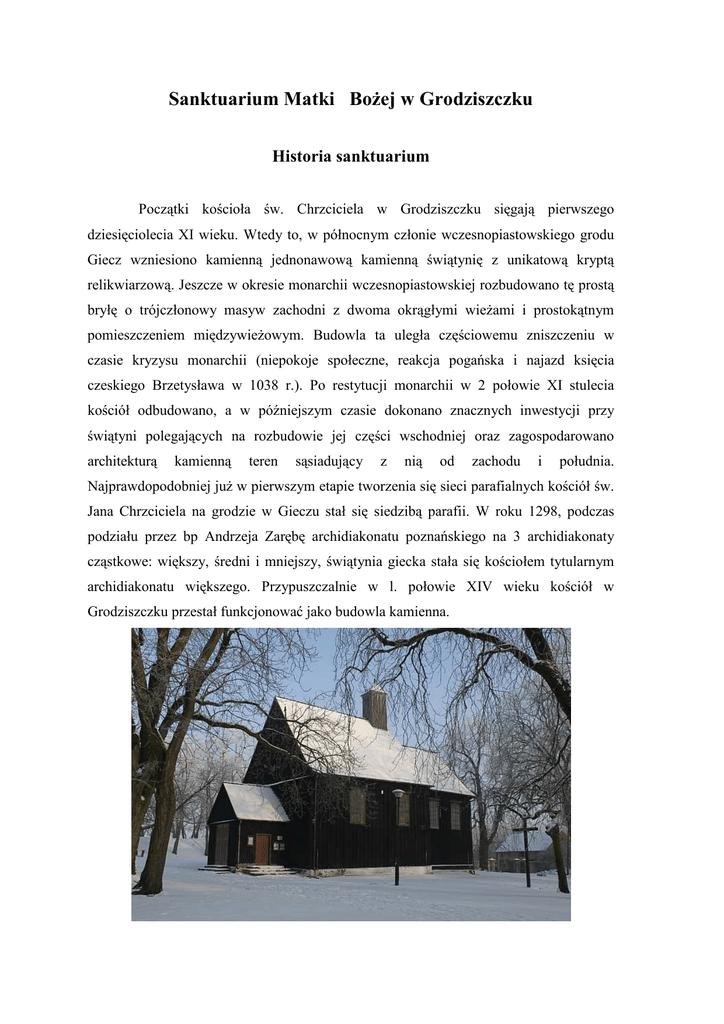 Sanktuarium Matki BoŜej w Grodziszczku Historia sanktuarium Początki kościoła św. Chrzciciela w Grodziszczku sięgają pierwszego dziesięciolecia XI wieku. Wtedy to, w północnym członie wczesnopiastowskiego grodu Giecz wzniesiono kamienną jednonawową kamienną świątynię z unikatową kryptą relikwiarzową. Jeszcze w okresie monarchii wczesnopiastowskiej rozbudowano tę prostą bryłę o trójczłonowy masyw zachodni z dwoma okrągłymi wieŜami i prostokątnym pomieszczeniem międzywieŜowym. Budowla ta uległa częściowemu zniszczeniu w czasie kryzysu monarchii (niepokoje społeczne, reakcja pogańska i najazd księcia czeskiego Brzetysława w 1038 r.). Po restytucji monarchii w 2 połowie XI stulecia kościół odbudowano, a w późniejszym czasie dokonano znacznych inwestycji przy świątyni polegających na rozbudowie jej części wschodniej oraz zagospodarowano architekturą kamienną teren sąsiadujący z nią od zachodu i południa. Najprawdopodobniej juŜ w pierwszym etapie tworzenia się sieci parafialnych kościół św. Jana Chrzciciela na grodzie w Gieczu stał się siedzibą parafii. W roku 1298, podczas podziału przez bp Andrzeja Zarębę archidiakonatu poznańskiego na 3 archidiakonaty cząstkowe: większy, średni i mniejszy, świątynia giecka stała się kościołem tytularnym archidiakonatu większego. Przypuszczalnie w l. połowie XIV wieku kościół w Grodziszczku przestał funkcjonować jako budowla kamienna. Niejasny jest okres, kiedy nieco na południe od reliktów zniszczonego kościoła kamiennego została zbudowana pierwsza świątynia drewniana. Niemniej, najwcześniejsza wzmianka o kościele drewnianym pochodzi z XVI w. Obiekt ten przez stulecia kilkakrotnie ulegał spaleniu. Obecna świątynia została wzniesiona w XVIII stuleciu. Z tego czasu pochodzi teŜ wystrój jej wnętrza. W ołtarzu głównym znajduje się kopia zniszczonego podczas II wojny światowej XVIIwiecznego obrazu Matki Boskiej Pocieszenia. Od kiedy obraz ten zaczął otaczać szczególny kult nie wiadomo, z całą pewnością jednak szczególne miejsce świątyni jako sanktuarium maryjnego potwierdza zdarzenie z roku 1831, kiedy to pobliską wieś Neklę i jej okolice dotknęła zbierająca obfite śmiertelne Ŝniwo epidemia cholery. Za wstawiennictwem cudownego obrazu zaŜegnano epidemię, a pozostali przy Ŝyciu mieszkańcy Nekli ślubowali coroczną pielgrzymkę do Matki Boskiej Pocieszenia w Grodziszczku, który to zwyczaj trwa do dzisiaj. Informacje nt. Sanktuarium Kościół pw. św. Jana Chrzciciela w Grodziszczku Parafia rzymskokatolicka 63-012 Dominowe, ul. Centralna l tel. (61) 285 92 76 Msze św. w niedziele i święta o godz. 11.30, w dni powszednie tylko w środy o godz. 16.00 w święta zniesione o godz. 11.00 Odpust MB Pocieszenia w ostatnią niedzielę sierpnia. Uroczystości odpustowe rozpoczynają się w piątek Mszą św. o godz. 18.00 i procesją. W sobotę Msza św. na cmentarzu parafialnym w Grodziszczku o godz. 18.00. W niedzielę odpustową Msze św.: o godz. 8.00, o godz. 10.00 dla pielgrzymów z Nekli i o godz. 12.00 - suma odpustowa. W poniedziałek o godz. 16.00 - Msza św. dla chorych z udzieleniem sakramentu namaszczenia chorych.