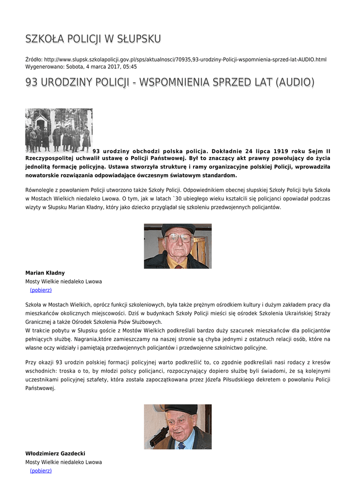 SZKOŁA POLICJI W SŁUPSKU Źródło: http://www.slupsk.szkolapolicji.gov.pl/sps/aktualnosci/70935,93-urodziny-Policji-wspomnienia-sprzed-lat-AUDIO.html Wygenerowano: Sobota, 4 marca 2017, 05:45 93 URODZINY POLICJI - WSPOMNIENIA SPRZED LAT (AUDIO) 93 urodziny obchodzi polska policja. Dokładnie 24 lipca 1919 roku Sejm II Rzeczypospolitej uchwalił ustawę o Policji Państwowej. Był to znaczący akt prawny powołujący do życia jednolitą formację policyjną. Ustawa stworzyła strukturę i ramy organizacyjne polskiej Policji, wprowadziła nowatorskie rozwiązania odpowiadające ówczesnym światowym standardom. Równolegle z powołaniem Policji utworzono także Szkoły Policji. Odpowiednikiem obecnej słupskiej Szkoły Policji była Szkoła w Mostach Wielkich niedaleko Lwowa. O tym, jak w latach `30 ubiegłego wieku kształcili się policjanci opowiadał podczas wizyty w Słupsku Marian Kładny, który jako dziecko przyglądał się szkoleniu przedwojennych policjantów. Marian Kładny Mosty Wielkie niedaleko Lwowa (pobierz) Szkoła w Mostach Wielkich, oprócz funkcji szkoleniowych, była także prężnym ośrodkiem kultury i dużym zakładem pracy dla mieszkańców okolicznych miejscowości. Dziś w budynkach Szkoły Policji mieści się ośrodek Szkolenia Ukraińskiej Straży Granicznej a także Ośrodek Szkolenia Psów Służbowych. W trakcie pobytu w Słupsku goście z Mostów Wielkich podkreślali bardzo duży szacunek mieszkańców dla policjantów pełniących służbę. Nagrania,które zamieszczamy na naszej stronie są chyba jednymi z ostatnuch relacji osób, które na własne oczy widziały i pamiętają przedwojennych policjantów i przedwojenne szkolnictwo policyjne. Przy okazji 93 urodzin polskiej formacji policyjnej warto podkreślić to, co zgodnie podkreślali nasi rodacy z kresów wschodnich: troska o to, by młodzi polscy policjanci, rozpoczynający dopiero służbę byli świadomi, że są kolejnymi uczestnikami policyjnej sztafety, która została zapoczątkowana przez Józefa Piłsudskiego dekretem o powołaniu Policji Państwowej. Włodzimierz Gazdecki Mosty Wielkie niedaleko Lwowa (pobierz) Ciekawostką jest fakt, ze pierwszym komendantem słupskiej Szkoły Policji, która rozpoczęła funkcjonowanie w czerwcu 1945 roku był płk. Jan Płotnicki, przedwojenny policjant, adiutant Komendanta Głównego. Jak podkreślali kresowiacy, którzy gościli w Słupsku, to właśnie w grodzie nad Słupią kontynuowane są tradycje przedwojennej szkoły policyjnej z Mostów Wielkich pod Lwowem. Galeria zdjęć. (24.7.2012) Ocena: 0/5 (0) Tweetnij