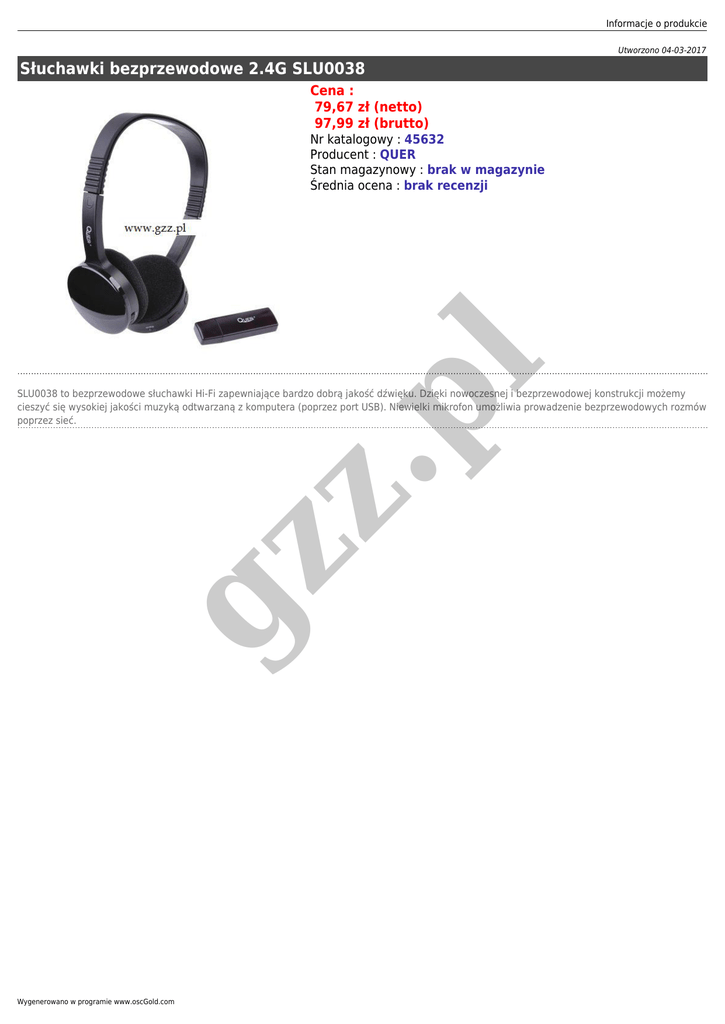 Informacje o produkcie Utworzono 04-03-2017 Słuchawki bezprzewodowe 2.4G SLU0038 Cena : 79,67 zł (netto) 97,99 zł (brutto) .p l Nr katalogowy : 45632 Producent : QUER Stan magazynowy : brak w magazynie Średnia ocena : brak recenzji gz z SLU0038 to bezprzewodowe słuchawki Hi-Fi zapewniające bardzo dobrą jakość dźwięku. Dzięki nowoczesnej i bezprzewodowej konstrukcji możemy cieszyć się wysokiej jakości muzyką odtwarzaną z komputera (poprzez port USB). Niewielki mikrofon umożliwia prowadzenie bezprzewodowych rozmów poprzez sieć. Wygenerowano w programie www.oscGold.com