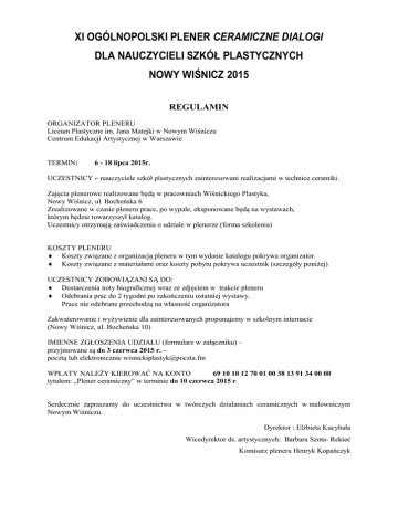 XI OGÓLNOPOLSKI PLENER CERAMICZNE DIALOGI DLA NAUCZYCIELI SZKÓŁ PLASTYCZNYCH NOWY WIŚNICZ 2015 REGULAMIN ORGANIZATOR PLENERU Liceum Plastyczne im. Jana Matejki w Nowym Wiśniczu Centrum Edukacji Artystycznej w Warszawie TERMIN: 6 - 18 lipca 2015r. UCZESTNICY – nauczyciele szkół plastycznych zainteresowani realizacjami w technice ceramiki. Zajęcia plenerowe realizowane będą w pracowniach Wiśnickiego Plastyka, Nowy Wiśnicz, ul. Bocheńska 6 Zrealizowane w czasie pleneru prace, po wypale, eksponowane będą na wystawach, którym będzie towarzyszył katalog. Uczestnicy otrzymają zaświadczenia o udziale w plenerze (forma szkolenia) KOSZTY PLENERU ♦ Koszty związane z organizacją pleneru w tym wydanie katalogu pokrywa organizator. ♦ Koszty związane z materiałami oraz koszty pobytu pokrywa uczestnik (szczegóły poniżej) UCZESTNICY ZOBOWIĄZANI SĄ DO: ♦ Dostarczenia noty biograficznej wraz ze zdjęciem w trakcie pleneru ♦ Odebrania prac do 2 tygodni po zakończeniu ostatniej wystawy. Prace nie odebrane przechodzą na własność organizatora Zakwaterowanie i wyżywienie dla zainteresowanych proponujemy w szkolnym internacie (Nowy Wiśnicz, ul. Bocheńska 10) IMIENNE ZGŁOSZENIA UDZIAŁU (formularz w załączniku) – przyjmowane są do 3 czerwca 2015 r. – pocztą lub elektronicznie [email protected] WPŁATY NALEŻY KIEROWAĆ NA KONTO 69 10 10 12 70 01 00 38 13 91 34 00 00 tytułem: „Plener ceramiczny” w terminie do 10 czerwca 2015 r. Serdecznie zapraszamy do uczestnictwa w twórczych działaniach ceramicznych w malowniczym Nowym Wiśniczu. Dyrektor : Elżbieta Kucybała Wicedyrektor ds. artystycznych: Barbara Szota- Rekieć Komisarz pleneru Henryk Kopańczyk INFORMACJE O KOSZTACH PLENERU KOSZT UDZIAŁU W PLENERZE– (kwoty brutto z wliczonym VAT) - 100 kg masy ceramicznej (białej i czerwonej), szkliwa 250,00 zł - wypały 250,00 zł (wymiar pieca: 80 x 80 x 149) - media (budynek ceramiki) 35,00 zł razem: 535,00 zł KOSZT POBYTU – ( internat) Opłata za wyżywienie i zakwaterowanie (kwoty brutto z wliczonym VAT): a) nocleg 27,00 zł b) całodobowe wyżywienie 22,00 zł - śniadanie - obiad - kolacja 6,00 zł 10,00 zł 6,00 zł W KARTACH ZGŁOSZENIOWYCH PROSIMY ZAZNACZYĆ NA KOGO MA BYĆ WYSTAWIONA FAKTURA ♦ ZA UDZIAŁ W PLENERZE ♦ ZA KOSZTY POBYTU I WYŻYWIENIA