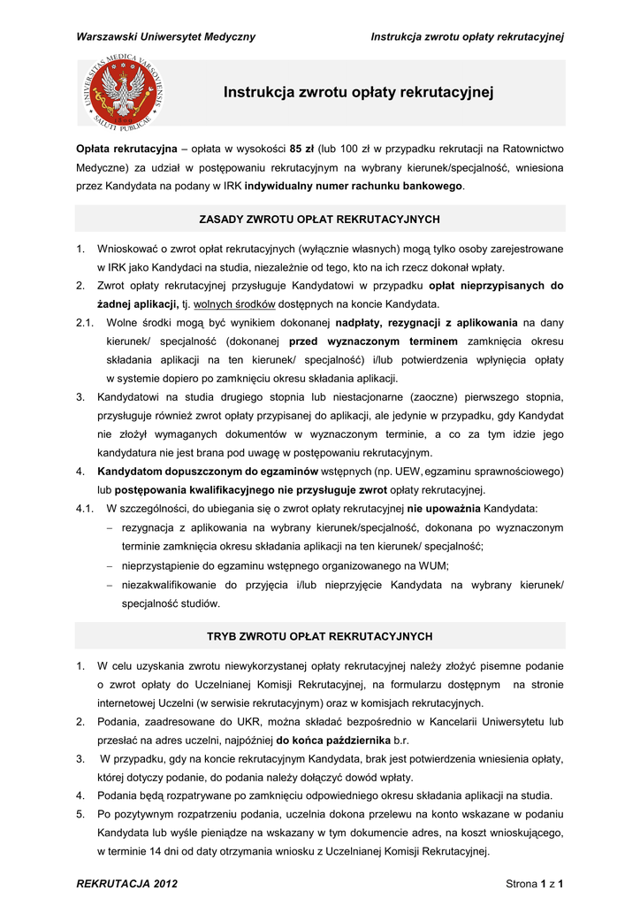Warszawski Uniwersytet Medyczny Instrukcja zwrotu opłaty rekrutacyjnej Instrukcja zwrotu opłaty rekrutacyjnej Opłata rekrutacyjna – opłata w wysokości wysoko 85 zł (lub 100 zł w przypadku rekrutacji na Ratownictwo Medyczne) za udział w postępowaniu ępowaniu rekrutacyjnym na wybrany kierunek/specjalno k/specjalność, wniesiona przez Kandydata andydata na podany w IRK indywidualny numer rachunku bankowego.. ZASADY ZWROTU OPŁAT REKRUTACYJNYCH 1. Wnioskować o zwrot opłat rekrutacyjnych (wyłącznie (wył własnych) mogą tylko osoby zarejestrowane w IRK jako Kandydaci na a studia, niezaleŜnie niezale od tego, kto na ich rzecz dokonał wpłaty. 2. Zwrot opłaty łaty rekrutacyjnej przysługuje Kandydatowi K w przypadku opłat nieprzypisanych do Ŝadnej aplikacji, tj. wolnych środków ś dostępnych na koncie Kandydata. 2.1. Wolne środki mogą byćć wynikiem dokonanej nadpłaty, rezygnacji z aplikowania na dany kierunek/ specjalność ść (dokonanej przed wyznaczonym terminem zamknięcia okresu składania aplikacji na ten kierunek/ specjalność) specjalno ) i/lub potwierdzenia wpłyni wpłynięcia opłaty w systemie dopiero po zamknięciu zamkni okresu składania aplikacji. 3. Kandydatowi na studia drugiego stopnia lub niestacjonarne (zaoczne) pierwszego stopnia, przysługuje równieŜ zwrot opłaty przypisanej do aplikacji, ale jedynie w przypadku, gdy Kandydat nie złoŜył wymaganych ymaganych dokumentów w wyznaczonym terminie, a co za tym idzie jego kandydatura nie jest brana pod uwagę uwag w postępowaniu rekrutacyjnym. 4. Kandydatom dopuszczonym do egzaminów wstępnych (np. UEW, egzaminu sprawnościowego) sprawno lub postępowania powania kwalifikacyjnego nie przysługuje zwrot opłaty rekrutacyjnej. 4.1. W szczególności, ci, do ubiegania się si o zwrot opłaty rekrutacyjnej nie upowaŜnia upowaŜ Kandydata: − rezygnacja z aplikowania na wybrany kierunek/specjalność, kierunek/specjalno , dokonana po wyznaczonym terminie zamknięcia cia okresu składania aplikacji aplikacji na ten kierunek/ specjalność; specjalno − nieprzystąpienie pienie do egzaminu wstępnego wst organizowanego na WUM; − niezakwalifikowanie do przyjęcia przyj i/lub nieprzyjęcie Kandydata na wybrany kierunek/ specjalność studiów. TRYB ZWROTU OPŁAT REKRUTACYJNYCH 1. W celu uzyskania zwrotu niewykorzystanej opłaty rekrutacyjnej naleŜyy złoŜyć złoŜ pisemne podanie o zwrot opłaty do Uczelnianej Komisji Rekrutacyjnej, na formularzu dostępnym dost dostę na stronie internetowej Uczelni (w serwisie rekrutacyjnym) oraz w komisjach rekrutacyjnych. rekrutacyjnych. 2. Podania, zaadresowane do UKR, moŜna mo składać bezpośrednio w Kancelarii Uniwersytetu lub przesłać na adres uczelni, najpóźniej najpó do końca października b.r. 3. W przypadku, gdy na koncie rekrutacyjnym r Kandydata, andydata, brak jest potwierdzenia wniesienia opłaty, której dotyczy podanie, do podania naleŜy nale dołączyć dowód wpłaty. 4. Podania będą rozpatrywane po zamknięciu ciu odpowiedniego okresu składania aplikacji na studia. 5. Po pozytywnym rozpatrzeniu podania, uczelnia dokona przelewu przelewu na konto wskazane w podaniu Kandydata lub wyśle le pieniądze dze na wskazany w tym dokumencie adres, na koszt wnioskuj wnioskującego, w terminie 14 dni od daty otrzymania wniosku z Uczelnianej Komisji Rekrutacyjnej. REKRUTACJA 2012 Strona 1 z 1