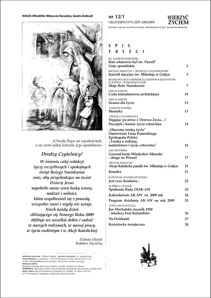 NASZA OKLADKA: Mistyczne Narodziny, Sandro Botticelli nr 1211 GRUDZIENISTYCZEN 2008/2009 WIERZYC ZYCIEM P l S M O AKCJI KATOLICKIEJ ARCHIDIECEZJI WARSZAWSKIEJ I I S P l S T R E S C I : KS. ANDRZEJ BOSOWSKI 1 Kim wlaSciwie byl 6w. Pawel? I Listy apostolskie I I 1 MICHAL SKRZYCKI I BOHDAN CZACHAROWSKI i ROZMOWA JEGO E M I N E N C J JOZEFEM ~ KARDYNALEM GLEMPEM PRYMASEM POLSKi ~ 1 i KoSciol stacyjny Sw. Mikolaja w Grbjcu Moje Boie Narodzenia 2 3 7 EMILIA JAROSZ Cuda miniaturowej architektury 10 EMILIA JAROSZ Szansa dla iycia 13 TADEUSZ KLIMSKI Bioetyka 13 URSZULA STATKIEWICZ a ria KhwaEa Bogu na wysokos'ciach, ziemi pokbj ludziom ]ego upodobania< i D V O ~ ZCYZ Y ~ ~ ~ ~ C Y ! W imieniu calej redakcji iyczg szczgdliwych i spokojnych Swiqt Boiego Narodzenia oraz, aby przychodzqce na Swiat Dziecig Jezus napelnil0 nasze serca laskq wiay, nadziei i miloSci, kto'ra wspo'lweseli sig z prawdq, wszystko znosi i nigdy nie ustaje. Niech kaidy dzien zbliiajqcego sig Nowego Roku 2009 obfittlje we wszelkie dobro i radoSC w naszych rodzinach, w naszej pracy, w iyciu osobistym i w Akcji Katolickiej - -- ~ ~ ~p I 16 JAN SZCZERBA - droga na Wawel MICHAL SKRZYCKI I Akcja Katolicka parafii Sw. Mikolaja w Grojcu 1 Kronika 17 21 21 KARDYNAL STANISLAW RYLKO Jest czas dzialania... 22 ELZBIETA OLEJNIK Spotkanie Rady DIAK AW 23 Kalendarium AK AW na 2009 rok Program dzialania AK AW na rok 2009 24 25 ZOPIA MANOWIECM I ~~ i ~ Elzbieta Oleln~k, ASYSTENT KOSCIELNY- k i Andrzej P a y ADRES REDAKCJI:ui. Driekan~a1, 00-279 Warsrawa, tel./fax (48 22) 831 01 48, e-mall: [email protected], http.1iw.warszawa ak org.pl Redakcla rastrzega sob~eprawo skrbtbw I korekty nadestanych tekstbw. WYDAWCA: D~ecezlalnylnstytut A~LIIKatol~ckiejArchid~ecezjiWarsrawsk~el Nakiad 1000 SKtAD I DRUK: Oflcynd Wydawnlczo-Pol~graficzna ,,ADAMT', ui. Rolna 1911193, 02-729 Warszawa. Wspotpraca redakcylna Stefdn Budzylisk~. ,,Otoczmy troskq iycie" Omowienie Listu Pasterskiego Episkopatu Polski: ,,Troska o rodzinq, malienstwo i iycie czlowieka" I REDAKTOR NACZELNA - REDAGUJE ZESPO~. 14 General broni Wladyslaw Sikorski I Elibieta Olejnik Redaktor Naczelny Siqgajqc po owoc z Drzewa zycia...? Poczqtek i koniec iycia czlowieka i ' Jan Machulski, rocznik 1928 - mlodszy brat Kolumb6w 26 Na Dziekanii f i z ~ i 6 w k aSwiateczna 27 28
