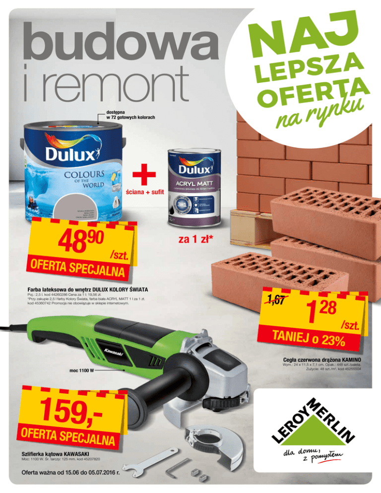 budowa i remont dostępna w 72 gotowych kolorach ściana + sufit 48 90 /szt. za 1 zł* OFERTA SPECJ ALNA Farba lateksowa do wnętrz DULUX KOLORY ŚWIATA Poj.: 2,5 l. kod 44260286 Cena za 1 l: 19,56 zł. *Przy zakupie 2,5 l farby Kolory Świata, farba biała ACRYL MATT 1 l za 1 zł. kod 45360742 Promocja nie obowiązuje w sklepie internetowym. 1,67 1 28 /szt. TANIEJ o 23% Cegła czerwona drążona KAMINO moc 1100 W 159,OFERTA SPECJALNA Szlifierka kątowa KAWASAKI Moc: 1100 W. Śr. tarczy: 125 mm. kod 45207820 Oferta ważna od 15.06 do 05.07.2016 r. Wym.: 24 x 11,5 x 7,1 cm. Opak.: 448 szt./paleta. Zużycie: 48 szt./m2. kod 45255504 farby biały + 19 kolorów złamanej bieli (off white) dostępna w 25 kolorach dostępna w 50 kolorach 267,- 334 TANIEJ o 20% 24,90 farba + wałek za 1 zł* Farba lateksowa do mieszalnika TIKKURILA OPTIVA WHITE Poj.: 9 l. kod 45360756 Cena za 1 l: 29,67 zł. *Przy zakupie 9 l farby TIKKURILA OPTIVA wałek ANZA ANTEX 18 cm za 1 zł. kod 45176033 Promocja nie obowiązuje w sklepie internetowym. 59 OFE TANIEJ o 20% Emalia akrylowa do wnętrz i na zewnątrz LUXENS Poj.: 0,75 l. kod 44602376 Cena za 1 l: 26,53 zł. 90 RTA SPECJALN A Farba lateksowa do wnętrz BONDEX SMART Poj.: 2,5 l. kod 45357683 Cena za 1 l: 23,96 zł. 45,90 1990 38 90 TANIEJ o 15% Farba akrylowa do wnętrz LUXENS Poj.: 10 l. Kolor: śnieżnobiały. kod 44195984 Cena za 1 l: 3,89 zł. 94 90 OFERTA SPECJALNA Farba lateksowa do wnętrz TIKKURILA PURE WHITE Poj.: 10 l. Kolor: biały. kod 45360616 Cena za 1 l: 9,49 zł. 299,- JEGER BETON 14 kg + 7 kg za 1 zł* OFERTA SPECJALNA Efekt dekoracyjny do wnętrz JEGER BETON Poj.: 14 kg. Kolor: roma. kod 44445030 Cena za 1 kg: 21,36 zł. *Przy zakupie 14 kg JEGER BETON 7 kg kolor: roma za 1 zł. kod 44706424 Promocja nie obowiązuje w sklepie internetowym. 97,95 87 90 54,75 TANIEJ o 10% TANIEJ o 17% Farba lateksowa do wnętrz DULUX ACRYL MATT Poj.: 10 l. Kolor: biały. kod 42705950 Cena za 1 l: 8,79 zł. odporna na szorowanie 169 148,- TANIEJ o 12% Farba lateksowa do wnętrz TIKKURILA DREAM WHITE Poj.: 10 l. Kolor: biały. kod 45360791 Cena za 1 l: 14,80 zł. 45,- Farba podkładowa ŚNIEŻKA Poj.: 10 l. Kolor: biały. kod 44683142 Cena za 1 l: 4,50 zł. dobrze kryjąca 19,90 1690 TANIEJ o 15% Uniwersalny grunt akrylowy LUXENS Poj.: 5 l. kod 44121392 Cena za 1 l: 3,38 zł. dekorowanie ścian Sprawdź wybór! XXX Ponad 600 Ponad wzorów tapet wzorów tapet alternatywa dla wykończeń za pomocą gładzi szpachlowych nowoczesne faktury podkreślające kolory i zmniejszające zużycie farb do wielokrotnego malowania, łatwe do usunięcia produkt 100% wolny od PVC, przepuszczalny i regulujący wilgotność pomieszczenia 1699 4999 /szt. OFERTA SPECJALNA 24,99 /szt. OFERTA SPECJALNA Tapeta do malowania PRO 140 Moletowana flizelina. kod 45461892, 45461906, 45461913, 45461871 Tapeta winylowa na flizelinie NATURALIA kod 45451833, 45451861, 45451840, 45451875, 45451812, 45451791, 45451756 18 90 /opak. TANIEJ o 24% akcesoria do malowania Kamień dekoracyjny COMO Opak.: 0,48 m2. Materiał: gips. Zastosowanie: do wnętrz. kod 45297812 Cena za 1 m2: 39,38 zł. 22,- /kpl. OFERTA SPECJALNA 130 cm Zestaw malarski GLOBALL W zestawie: kuweta malarska, folia, wałek 18 cm, wałek 10 cm, rączka 18 cm, rączka 10 cm. kod 45176831 w zestawie pistolet do malowania WAGNER 565 259,- OFERTA SPECJALNA Mieszarka CELMA Moc: 1200 W. Prędkość obr.: 100-700 obr./min. kod 45033086 64,90 4890 TANIEJ o 24% Drabina aluminiowa PRACTYL 4 stopnie. Udźwig: 125 kg. Podest na wys. 78 cm. kod 43844514 wąż 15 m 2590 /kpl. OFERTA SPECJALNA Zestaw malarski GLOBALL W zestawie: wałek 18 cm, stylisko teleskopowe 1,3 m. kod 44750223 2899,Agregat do malowania WAGNER 119 PROJECT PRO Moc: 720 W. Wydajność tłoczenia: 1,25 l/min. Ciśnienie maks.: 200 bar. Waga: 18 kg. Napięcie zasilające: 230 V-50 Hz. kod 43914052 549,- OFERTA SPECJALNA Pistolet do malowania WAGNER 525 Moc: 630 W. Poj. zbiornika: 1300 ml. W zestawie głowice: do farb ściennych, do lakierów i impregnatów, do farb strukturalnych i tynków. kod 45513174 budowa i remont 465,- 1295,- 1499 TANIEJ o 13% OFERTA SPECJALNA Drzwi wejściowe do domu NIKE Szer.: 90 cm, prawe i lewe. Kolor: złoty dąb. W komplecie: ościeżnica, klamka z szyldem, 2 zamki, próg aluminiowy. kod 45221561 Dostępne również w kolorach: orzech i antracyt. 525,Drzwi przeciwpożarowe EI 30 Szer.: 80 cm. Uniwersalne otwieranie: lewe lub prawe. Kolor: biały. W komplecie: ościeżnica, klamka z szyldem, uszczelki. kod 45206595 25 5 855 worek z dosypką /opak. OFERTA SPECJALNA 128 9 9990 /opak. OFERTA SPECJALNA Zaprawa klejąco-zbrojąca STYRLEP KREISEL Opak.: 30 kg. Śr. zużycie: 5 kg/m2. kod 45490011 Dostępna również zaprawa klejąca LEPSTYR KREISEL w cenie: 17,99 zł. kod 45488884 8 kolorów /m2 Farba fasadowa ALPINA Poj.: 10 l. kod 44374673 Cena za 1 l: 9,99 zł. 6 1 7. sztuka za 1 gr 260 2299 TANIEJ o 21% Płyta OSB Wym.: 2500 x 1250 mm. Gr.: 8 mm. kod 43287853 2,90 25 5 worek z dosypką Podkład mocny beton AXTON B-20 Opak.: 30 kg. Gr. warstwy: 20-60 mm. Śr. zużycie: 20 kg/m3/cm. kod 45476053 Cena za kg: 0,29 zł. 98 Drzwi do domu lub mieszkania MARS Szer.: 90 cm. Kolor: złoty dąb. W komplecie: ościeżnica, klamka z szyldem, 2 zamki z wkładkami, wizjer, próg stalowy. kod 45464370 Dostępne również o szer.: 80 cm. kod 45464356 stabilizujące pasy zabezpieczające przed rozsunięciem /m2 TANIEJ o 10% 14 Papa W/K SUPERNOWA W/400/1200 Opak.: 15 m2. Kolor: szary. kod 45455732 Cena za opak.: 39 zł. 40 /m2 Wełna szklana HOME 037 Lambda: 0,037. Gr.: 150 mm. Opak.: 4,56 m2. Cena za opak.: 65,65 zł. kod 45428005 Cena za m2 przy zakupie 7 rolek: 12,34 zł. 15 12 45 /m2 TANIEJ o 17% Fasada STB Lambda: 0,042. Gr.: 10 cm. Opak.: 6 płyt/3 m2. kod 45461773, 44299395 Cena za opak.: 37,35 zł. 329,TANIE 369 J o 10% Drabina wielofunkcyjna CORDA KRAUSE Ilość szczebli: 3 x 9. Maks. wys.: w pozycji opartej - 5,3 m, w pozycji rozstawionej - 3,75 m. kod 42724374 antypo