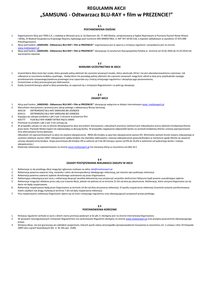 REGULAMIN AKCJI „SAMSUNG - Odtwarzacz BLU-RAY + film w PREZENCIE!” §1 POSTANOWIENIA OGÓLNE 1. 2. 3. Organizatorem Akcji jest TERG S.A. z siedzibą w Złotowie przy ul. Za Dworcem 1D, 77-400 Złotów, zarejestrowaną w Sądzie Rejonowym w Poznaniu Poznań Nowe Miasto i Wilda, IX Wydział Gospodarczy Krajowego Rejestru Sądowego pod numerem KRS 0000427063, nr NIP 767-10-04-218, o kapitale zakładowym w wysokości 37.875.000 PLN,(Organizator). Akcja pod hasłem „SAMSUNG - Odtwarzacz BLU-RAY + film w PREZENCIE!” organizowana jest w oparciu o niniejszy regulamin i prowadzona jest na stronie www.mediaexpert.pl Akcja pod hasłem „SAMSUNG - Odtwarzacz BLU-RAY + film w PREZENCIE!” obowiązuje na terytorium Rzeczpospolitej Polskiej w terminie od 15.01.2016 do 31.03.2016 lub wyczerpania zapasów. §2 WARUNKI UCZESTNICTWA W AKCJI 1. 2. 3. Uczestnikiem Akcji może być osoba, która posiada pełną zdolność do czynności prawnych (osoba, która ukończyła 18 lat i nie jest ubezwłasnowolniona częściowo lub całkowicie w rozumieniu kodeksu cywilnego. Osoby które nie posiadają pełnej zdolności do czynności prawnych mogą brać udział w akcji przy współudziale swojego przedstawiciela ustawowego/opiekuna prawnego) oraz zapoznała się z treścią niniejszego regulaminu i akceptuje jego postanowienia; Uczestnictwo w Akcji promocyjnej jest dobrowolne. Każdy Uczestnik biorący udział w Akcji potwierdza, że zapoznał się z niniejszym Regulaminem i w pełni go akceptuje. §3 ZASADY AKCJI 1. 2. 3. 4. 5. 6. Akcja pod hasłem „SAMSUNG - Odtwarzacz BLU-RAY + film w PREZENCIE!” obowiązuje wyłącznie w sklepie internetowym www. mediaexpert.pl Warunkiem skorzystania z promocji jest zakup jednego z odtwarzaczy Bluray Samsung: 833110 ODTWARZACZ BLU-RAY SAMSUNG BD-J5500/EN 833111 ODTWARZACZ BLU-RAY SAMSUNG BD-J5900/EN Kupujący po zakupie produktu z pkt 2 par 3 otrzyma w prezencie film: 835777 FILM BLU-RAY HOBBIT BITWA PIĘCIU ARMII Promocje na produkt z pkt 2 par 3 nie sumują się. W przypadku zakupu na raty w okresie obowiązywania akcji warunkiem skorzystania z aktualnych promocji ratalnych jest indywidualna ocena zdolności kredytowej Klienta przez bank. Placówki Media Expert nie odpowiadają za decyzję banku. W przypadku negatywnej odpowiedzi banku na wniosek kredytowy Klienta zostaną zaproponowane inne alternatywne formy płatności. (Wysokość rat zaprezentowanych w akcji nie zawiera ubezpieczenia. RRSO dla kredytu w opcji bez ubezpieczenia wynosi 0%. Minimalna wartość brutto towaru nabywanego w systemie ratalnym wynosi 100zł. Ubezpieczenie spłaty kredytu ma charakter dobrowolny i stanowi zabezpieczenie pożyczki/kredytu w momencie zgody Klienta na zawarcie umowy ubezpieczenia kredytu. Stopa procentowa dla kredytu 0% w zakresie od 3 do 40 miesięcy wynosi od 0% do 32,6% w zależności od wybranego banku i rodzaju ubezpieczenia.) Materiały reklamowe zaprezentowane na stronie www.mediaexpert.pl nie stanowią oferty w rozumieniu art.66§ 1K.C §4 ZASADY POSTĘPOWANIA REKLAMACJI ZAKUPU W AKCJI 1. 2. 3. 4. 5. 6. 7. Reklamacje co do przebiegu Akcji mogą być zgłaszane mailowo na adres [email protected]. Reklamacja powinna zawierać imię, nazwisko i adres do korespondencji składającego reklamację, jak również opis podstawy reklamacji. Reklamacja powinna zawierać żądanie określonego zachowania się przez Organizatora. Reklamujący zobowiązany jest wraz z reklamacją doręczyć wszelkie dokumenty oraz przytoczyć wszystkie okoliczności faktyczne bądź prawne uzasadniające żądanie. Reklamacje mogą być składane przez cały czas trwania Akcjii, jednak nie później niż w terminie 21 dni od dnia jej zakończenia. Reklamacje, które otrzyma Organizator po tej dacie nie będą rozpatrywane. Reklamacje rozpatrywane będą przez Organizatora w terminie 14 dni od dnia otrzymania reklamacji. O wyniku rozpatrzenia reklamacji Uczestnik zostanie poinformowany listem zwykłym lub drogą mailową w terminie 7 dni od daty rozpatrzenia reklamacji. Przy rozpatrywaniu reklamacji Organizator opiera się na treści niniejszego regulaminu oraz obowiązujących przepisach prawa polskiego. §5 POSTANOWIENIA KOŃCOWE 1. 2. 3. Niniejszy regulamin wchodzi w życie z dniem startu promocji podanym w §1 pkt.3 i dostępny jest na stronie internetowej Organizatora. W sprawach nieuregulowanych niniejszym Regulaminem ma zastosowanie Regulamin dostępny na stronie www.mediaexpert.pl oraz przepisy powszechnie obowiązującego prawa. Niniejsza Akcja nie jest grą losową ani zakładem wzajemnym, których wynik zależy od przypadku (przeprowadzenie losowania) w rozumieniu art. 2 ustawy z dnia 19 listopada 2009 roku o grach hazardowych (Dz. U. Nr 201 poz. 1540).