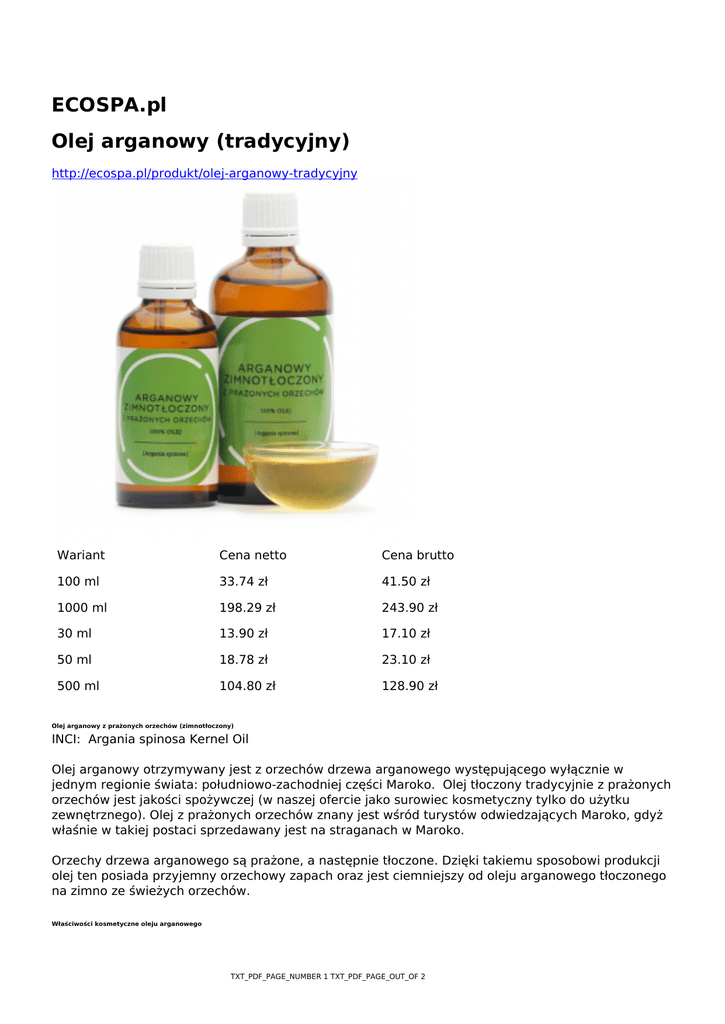 ECOSPA.pl Olej arganowy (tradycyjny) http://ecospa.pl/produkt/olej-arganowy-tradycyjny Wariant Cena netto Cena brutto 100 ml 33.74 zł 41.50 zł 1000 ml 198.29 zł 243.90 zł 30 ml 13.90 zł 17.10 zł 50 ml 18.78 zł 23.10 zł 500 ml 104.80 zł 128.90 zł Olej arganowy z prażonych orzechów (zimnotłoczony) INCI: Argania spinosa Kernel Oil Olej arganowy otrzymywany jest z orzechów drzewa arganowego występującego wyłącznie w jednym regionie świata: południowo-zachodniej części Maroko. Olej tłoczony tradycyjnie z prażonych orzechów jest jakości spożywczej (w naszej ofercie jako surowiec kosmetyczny tylko do użytku zewnętrznego). Olej z prażonych orzechów znany jest wśród turystów odwiedzających Maroko, gdyż właśnie w takiej postaci sprzedawany jest na straganach w Maroko. Orzechy drzewa arganowego są prażone, a następnie tłoczone. Dzięki takiemu sposobowi produkcji olej ten posiada przyjemny orzechowy zapach oraz jest ciemniejszy od oleju arganowego tłoczonego na zimno ze świeżych orzechów. Właściwości kosmetyczne oleju arganowego TXT_PDF_PAGE_NUMBER 1 TXT_PDF_PAGE_OUT_OF 2 Olej arganowy jest wyjątkowym olejem roślinnym. Prawie 80% jego objętości stanowią nienasycone kwasy tłuszczowe bardzo ważne dla ludzkiego organizmu. Niezbędne nienasycone kwasy tłuszczowe uczestniczą m.in. w tworzeniu prostaglandyn hormonów odpowiedzialnych za szereg bardzo ważnych procesów zachodzących zarówno w skórze jak i całym organizmie. Wyjątkowa kompozycja oleju arganowego sprawia, że jest bardzo dobrze przyswajalny i wchłaniany przez skórę. Pod wpływem enzymów występujących w skórze składniki oleju są odpowiednio modyfikowane i wnikają w głębsze warstwy skóry. Olej arganowy jest doskonały na dojrzałą i starzejącą się skórę, wzmacniając barierę naskórkową poprawia nawilżenie skóry, chroni przed przedwczesnym pojawieniem się zmarszczek, wzmacnia paznokcie i włosy. Olej arganowy zawiera szereg fitosteroli, posiada właściwości antyzapalne i chroniące skórę (stigmasterol). Zawiera butyrospermol pielęgnujący skórę przed i po opalaniu. Zastosowanie Berberowie, rdzenna ludność północnej Afryki zamieszkująca tereny górskie Atlas, od stuleci używa olej arganowy do ochrony skóry przed ekstremalnymi warunkami pogodowymi. Tradycyjnie olej arganowy używają: do do do do masażu - dzieci a nawet niemowląt, pielęgnacji skóry w stanach zapalnych (atopowe zapalenie skóry), trądzik, pielęgnacji skóry w trakcie ciąży i po w celu zapobiegania powstawaniu rozstępów codziennej ochrony skóry przed palącym słońcem i silnymi wiatrami. Olej arganowy odkryty na nowo przez przemysł kosmetyczny wykorzystywany jest do produkcji olejowych serum, przeciwzmarszczkowych kremów pod oczy, na dekolt i szyję, w produktach anti-agingowych, w odżywkach i szamponach do włosów. Stosuje się go jako odżywkę na paznokcie oraz składnik preparatów po depilacji i goleniu. Wsparcie dla społeczności lokalnej. Część dochodu pochodzącego ze sprzedaży oleju znajdującego się w naszej ofercie przekazywane jest na rozwój społeczności lokalnej w dwóch regionach Maroko (Biougra, Essaouira). TXT_PDF_PAGE_NUMBER 2 TXT_PDF_PAGE_OUT_OF 2