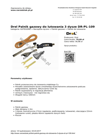 Zapraszamy do sklepu www.narzedziak.pl.pl Przedsiębiorstwo Handlowo Usługowe Gaabi Sławomir Gagatek ul. Legnicka 52A 54-204 Wrocław tel. 801 003 154 dla tel. kom.: 71 724 25 00 fax: 71 724 20 96 Drel Palnik gazowy do lutowania 3 dysze DR-PL-109 kategoria: KATEGORIE > Narzędzia ręczne > Palniki gazowe > Palniki do lutowania Producent: Drel Cena brutto: 70,09 zł Cena netto: 56,98 zł Opcje produktu: Kod QR: Parametry użytkowe: Palnik przeznaczony do lutowania miękkiego Cu Ponadto zastosowane dysze umożliwiają wszechstronne zstosowanie podczas podgrzewania, opalania, obkurczania rurek itp. Palnik wyposażony w regulację płomienia Uchwyt z tworzywa - nie nagrzewa się Długość lancy 100mm W zestawie: Palnik gazowy Wąż zbrojony 1.5m 3 dysze: koncetryczna 17mm (opalanie, podhrzewanie, lutowanie), otaczająca 22mm (lutowanie rurek), płaska 40mm (opalanie starych farb) Klucze strona: 1/2 wydrukowano: 04-03-2017 http://www.narzedziak.pl/drel-palnik-gazowy-do-lutowania-3-dysze-dr-pl-109.html strona: 2/2 wydrukowano: 04-03-2017 http://www.narzedziak.pl/drel-palnik-gazowy-do-lutowania-3-dysze-dr-pl-109.html