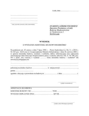 Łódź, dnia .................................................... ............................................................................... ............................................................................... ............................................................................... ............................................................................... / imię i nazwisko inwestora, adres zamieszkania/ STAROSTA ŁÓDZKI WSCHODNI Starostwo Powiatowe w Łodzi Referat Budownictw a ul. Sienkiewicza 3 90-954 Łódź WNIOSEK O WYDANIE DZIENNIKA BUDOWY/ROZBIÓRKI Na podstawie art. 45 ustawy z dnia 7 lipca 1994 r. – Prawo budowlane (t.j. Dz. U. z 2010 r. Nr 243 poz. 1623) oraz § 4 rozporządzenia Ministra Infrastruktury z dnia 26 czerwca 2002 r. w sprawie dziennika budowy, montażu i rozbiórki, tablicy informacyjnej oraz ogłoszenia zawierającego dane dotyczące bezpieczeństwa pracy i ochrony zdrowia ( Dz. U. Nr 108, poz. 953 z późn. zm.) wnoszę o wydanie ................. tomu dziennika budowy / rozbiórki* dla inwestycji polegającej na: ....................................................................................................................................................................................................... ....................................................................................................................................................................................................... położonej na działce/-kach nr ............................................. w miejscowości ...................................................., gmina .................................................... zgodnie z decyzją o pozwoleniu na budowę nr ...................................... z dnia ........................................... r. .................................................... ( podpis wnioskodawcy) ADNOTACJA SŁUZBOWA DZIENNIK BUDOWY NR .............................................................. TOM .............................................................. WYDANO ODPŁATNIE DNIA ....................................................... KP NR........................................................ .................................................................... ( podpis osoby dokonującej rejestracji)