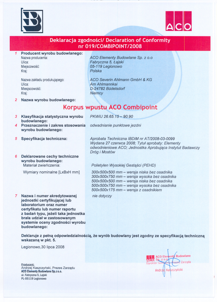 Deklaracja zgodnosci/ Declaration ot Contormity nr 019/COMBIPOINT/2008 1 Producent wyrobu budowlanego: AGO Elementy Budowlane Sp. z 0.0 Nazwaproducenta: Ulica: Kraj: Fabryczna 5, Lajski 05-119 Legionowo Polska Nazwazakladuprodukujacego: Ulica: Miesjscowosc: Kraj: AGO Severin Ahlmann GmbH & KG Am Ahlmannkai 0-24782 BOdelsdorf Niemcy Miejscowosc: 2 Nazwa wyrobu budowlanego: Korpus wpustu ACO Combipoint Klasyfikacja statystyczna wyrobu budowlanego: 4 Przeznaczenie i zakres stosowania wyrobu budowlanego: PKWiU 26.65.15 - 90.90 5 Specyfikacja techniczna: Aprobata Techniczna IBDiM nr A T/200B-03-0099 Wydana 27 czerwca 2008; Tytul aprobaty: Elementy odwodnieniowe AGO; Jednostka Aprobujaca Instytut Badawczy Dróg i Mostów 3 6 Deklarowane cechy techniczne wyrobu budowlanego: Materialzwienczenia: Wymiarynominalne[LxBxHmm] odwadnianie punktowe jezdni Polietylen Wysokiej Gestasci (PEHD) 300x500x500 mm 300x500x750 mm 500x500x500 mm 500x500x750 mm 500x500x175 mm 7 Nazwa i numer akredytowanej jednostki certyfikujacej lub laboratorium oraz numer certyfikatu lub numer raportu z badan typu, jezeli taka jednostka brala udzial w zastosowanym systemie oceny zgodnosci wyrobu budowlanego: - wersja niska bez osadnika - wersja wysoka - wersja niska bez osadnika wersja wysoka bez osadnika wersja z osadnikiem - bez osadnika nie dotyczy Deklaruje z pelna odpowiedzialnoscia, ze wyrób budowlany jest zgodny ze specyfikacja techniczna wskazana w pkt. 5. Legionowo,30lipca2008 Producent: Andrzej Kaszczynski, Prezes Zarzadu ACOElementyBudowlaneSp.z0.0. ul. Fabryczna5, Lajski PL-05119 Legionowo Andrll:lKa~lCzynski